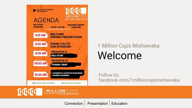 social media channels & create a banner highlighting you as a presenter. Please Submit Your: Photo Bio (short) Register to present go to: www.1millioncups.com/mishawaka “apply to present” 1 2 3 4 5 6 7 8 Connection | Presentation | Education