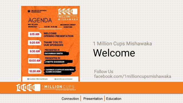 social media channels & create a banner highlighting you as a presenter. Please Submit Your: Photo Bio (short) Register to present go to: www.1millioncups.com/mishawaka “apply to present” 1 2 3 4 5 6 7 8 Connection | Presentation | Education