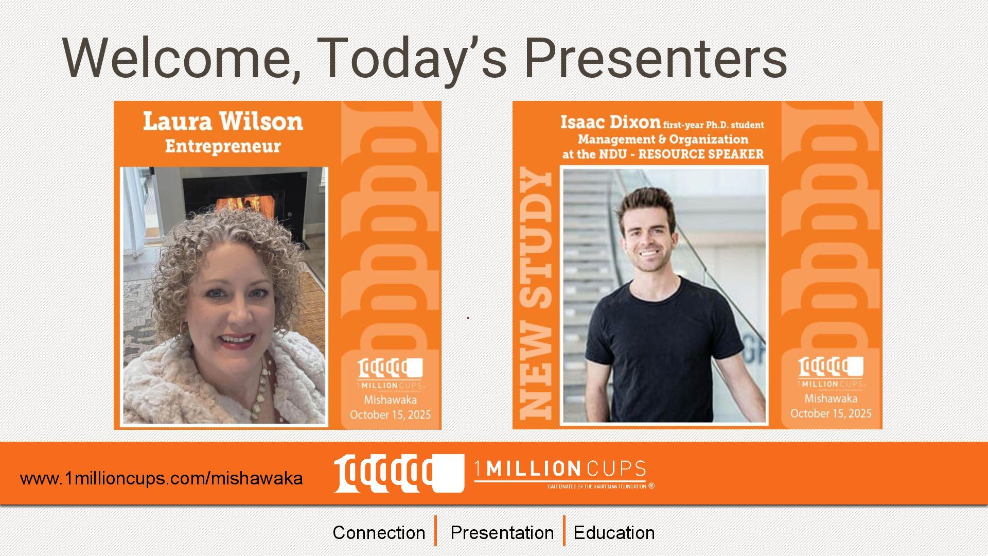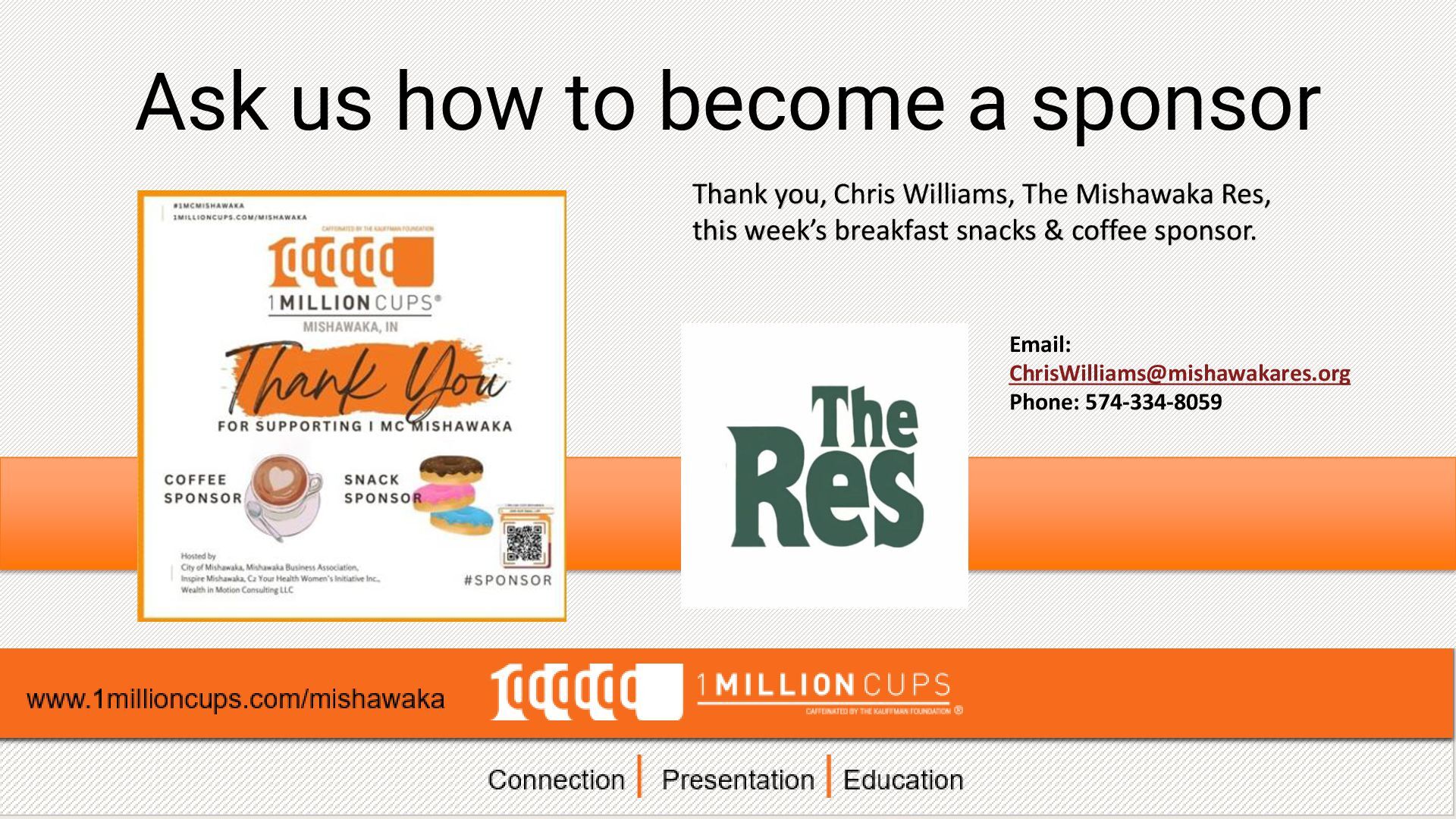 presentation | elevator speech Receive feedback from a diverse audience Gain exposure in new markets Support from 1 MC community Need help? We got you – 1MC Coach Register to Present Go to www.1millioncups.com/mishawaka Look for “apply to present” A 1MC Coach will contact you. 1. 2. 3.