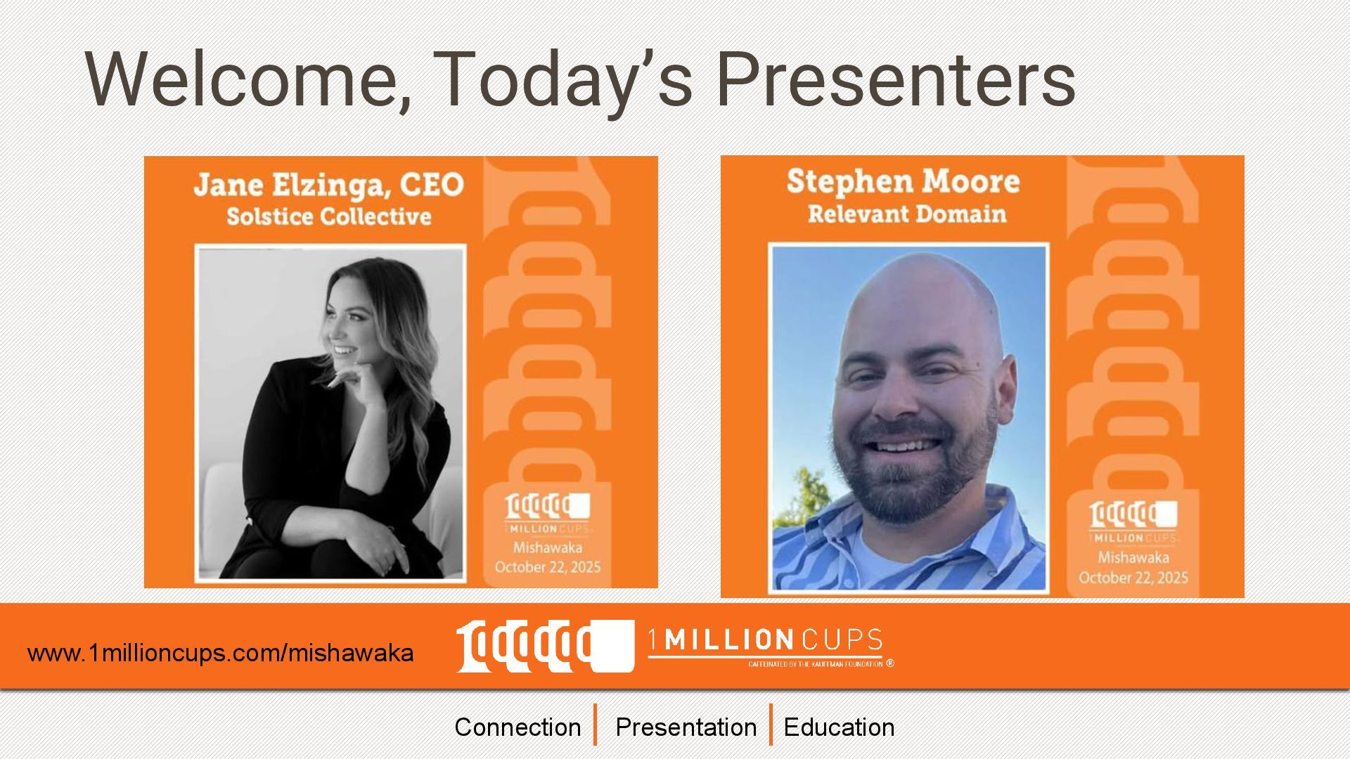 presentation | elevator speech Receive feedback from a diverse audience Gain exposure in new markets Support from 1 MC community Need help? We got you – 1MC Coach Register to Present Go to www.1millioncups.com/mishawaka Look for “apply to present” A 1MC Coach will contact you. 1. 2. 3.