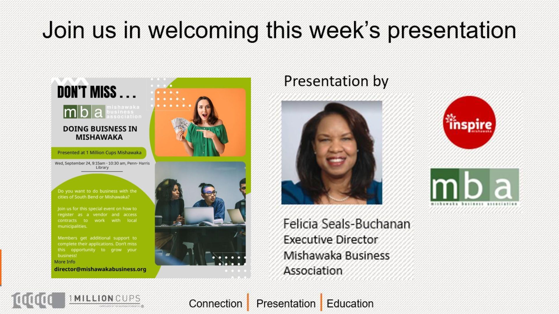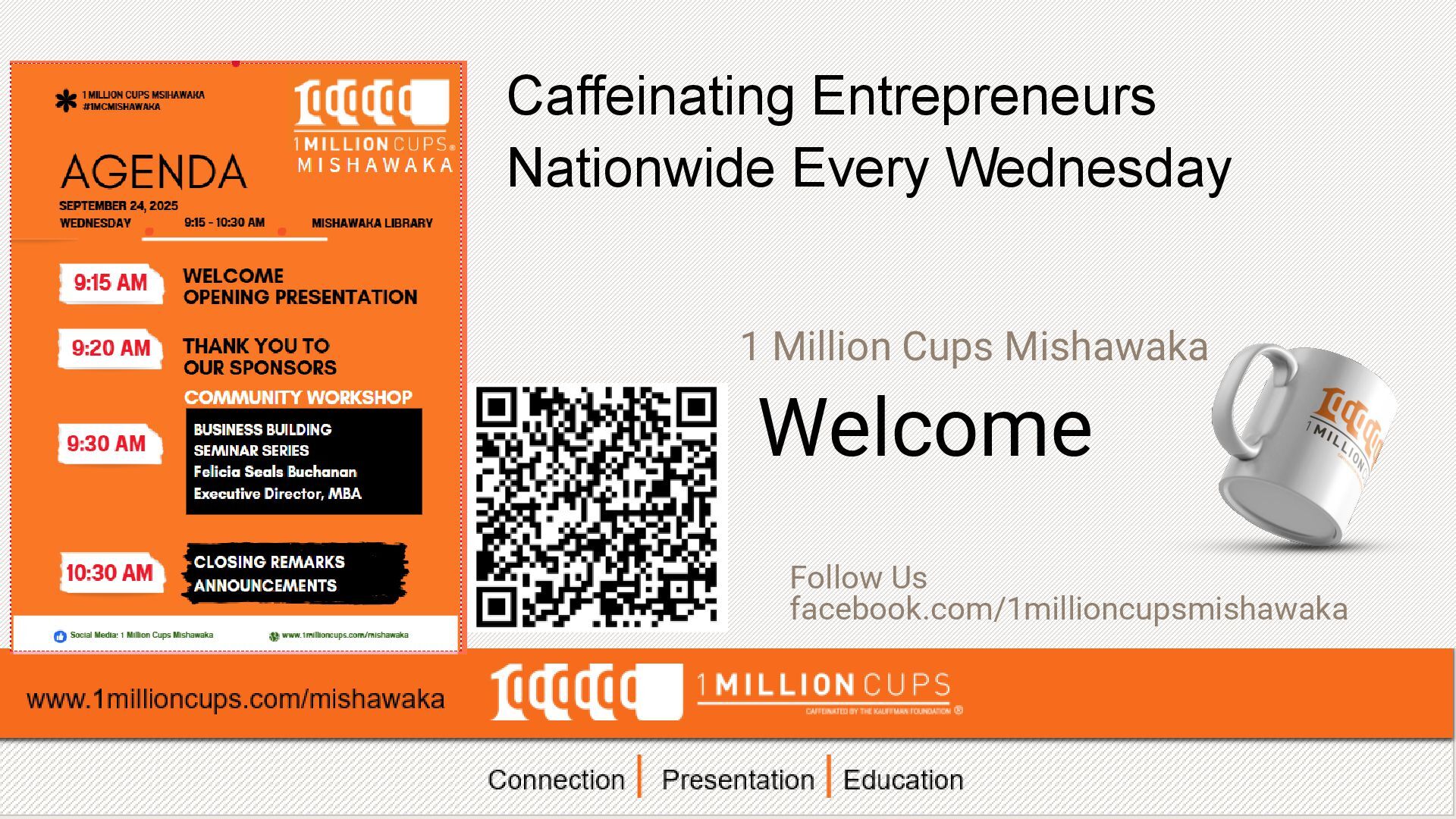 Educating, Inspiring and Connecting Entrepreneurs Nationwide Every Wednesday Morning at the Mishawaka Penn Harris Library, Lower Level, Eisen Room, Downtown Mishawaka. Arrive 9:00 am presentations begin at 9:15 am - 10:30 am.