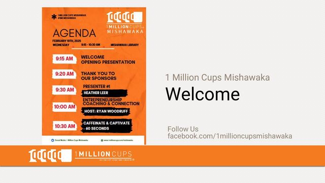 social media channels & create a banner highlighting you as a presenter. Please Submit Your: Photo Bio (short) Register to present go to: www.1millioncups.com/mishawaka “apply to present” 1 2 3 4 5 6 7 8 Connection | Presentation | Education