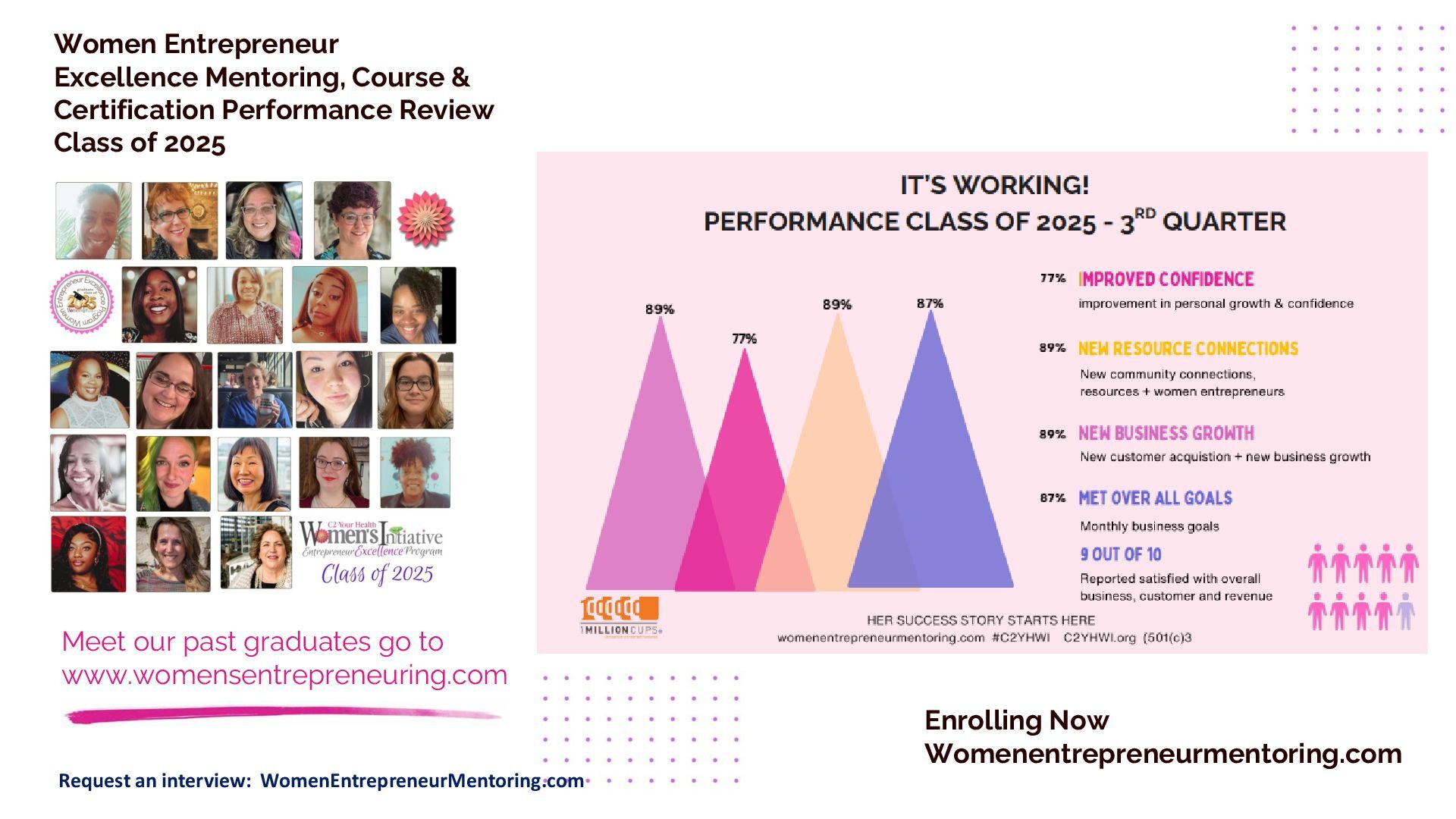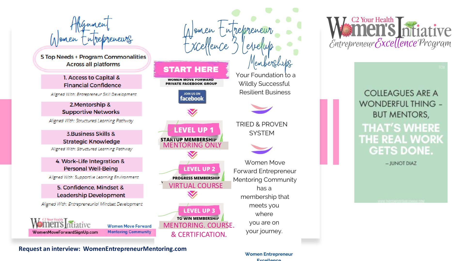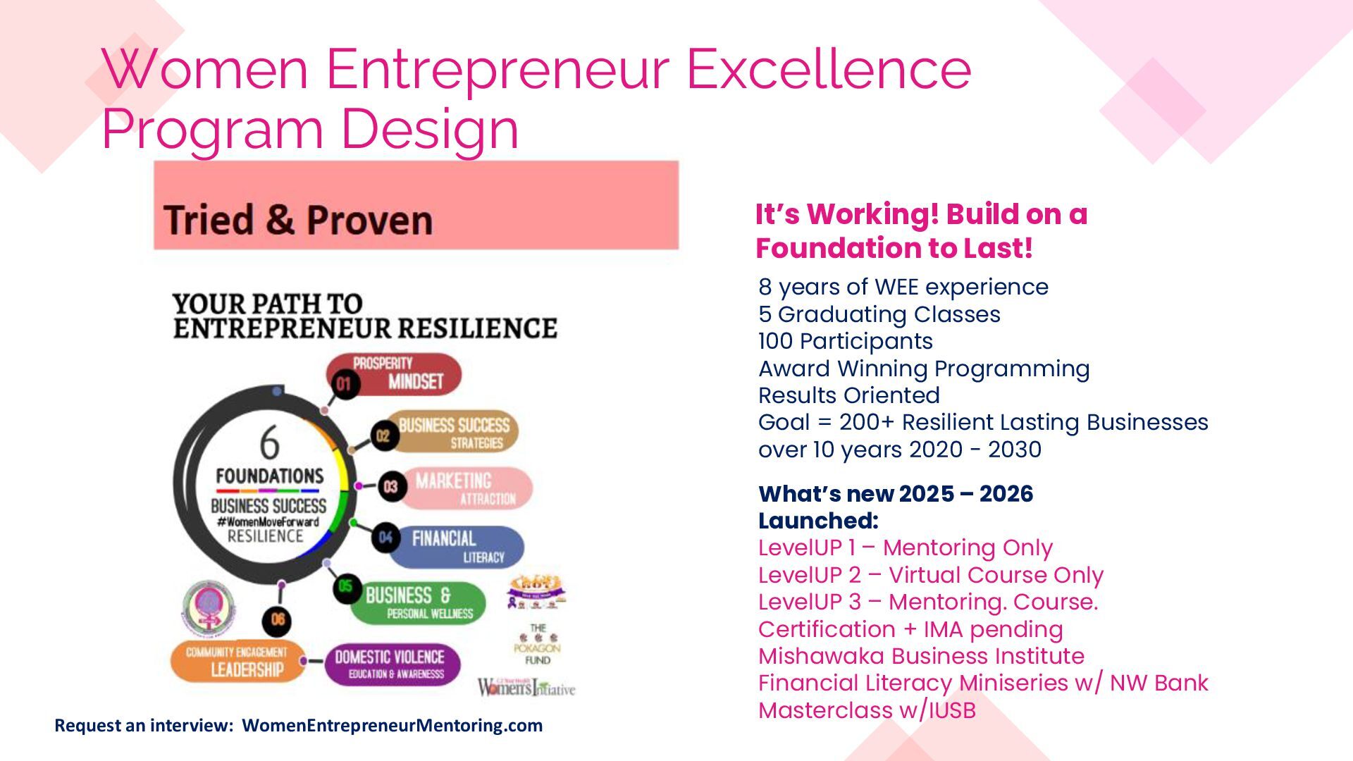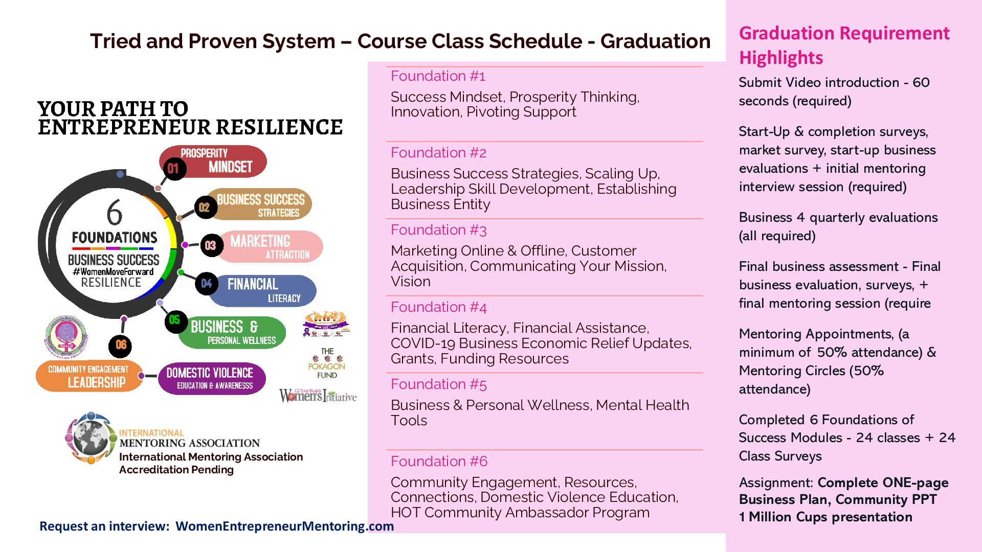 #2 Business Success Strategies, Scaling Up, Leadership Skill Development, Establishing Business Entity Foundation #3 Marketing Online & Offline, Customer Acquisition, Communicating Your Mission, Vision Foundation #4 Financial Literacy, Financial Assistance, COVID-19 Business Economic Relief Updates, Grants, Funding Resources Foundation #5 Business & Personal Wellness, Mental Health Tools Foundation #6 Community Engagement, Resources, Connections, Domestic Violence Education, HOT Community Ambassador Program International Mentoring Association Accreditation Pending Tried and Proven System – Course Class Schedule - Graduation Graduation Requirement Highlights Submit Video introduction - 60 seconds (required) Start-Up & completion surveys, market survey, start-up business evaluations + initial mentoring interview session (required) Business 4 quarterly evaluations (all required) Final business assessment - Final business evaluation, surveys, + final mentoring session (require Mentoring Appointments, (a minimum of 50% attendance) & Mentoring Circles (50% attendance) Completed 6 Foundations of Success Modules - 24 classes + 24 Class Surveys Assignment: Complete ONE-page Business Plan, Community PPT 1 Million Cups presentation Request an interview: WomenEntrepreneurMentoring.com