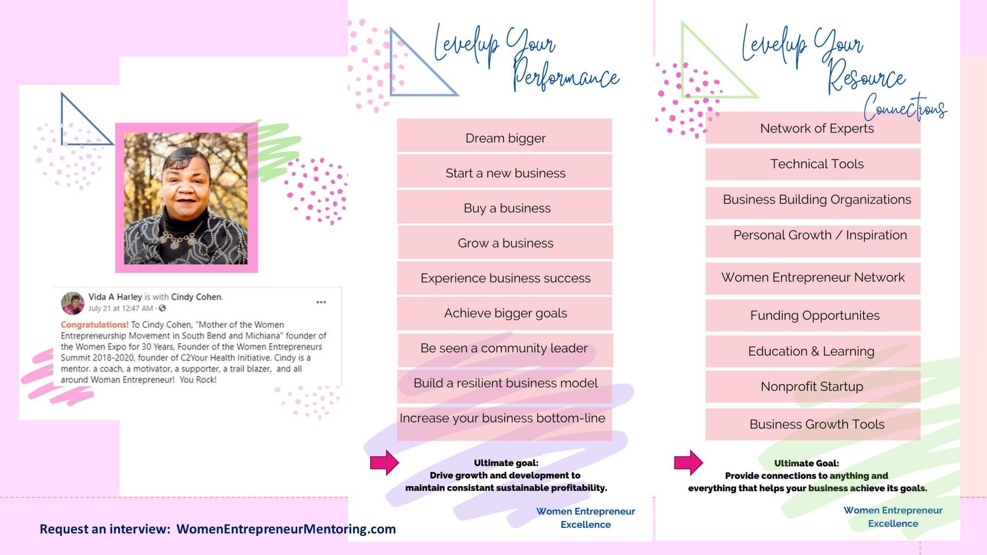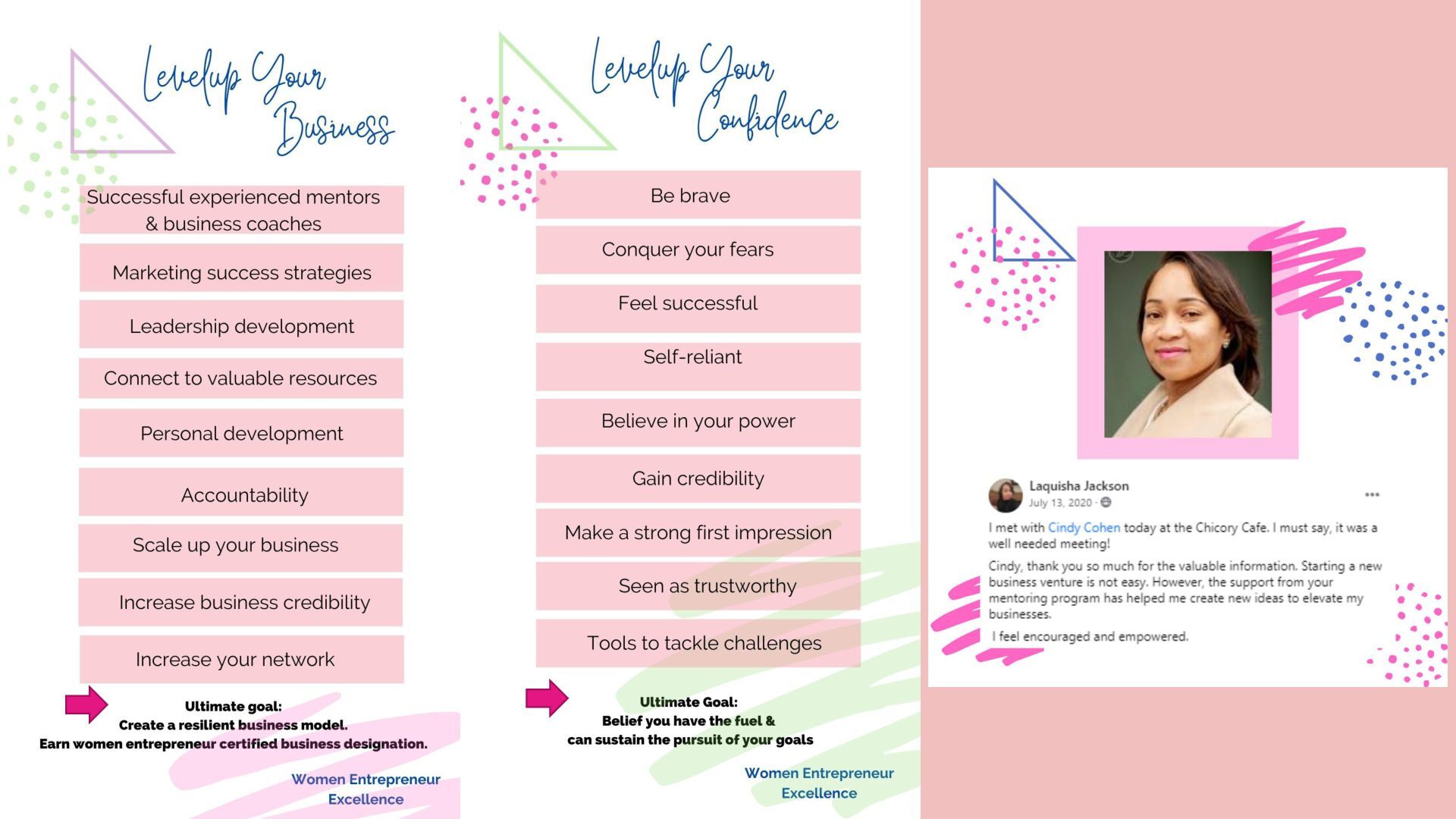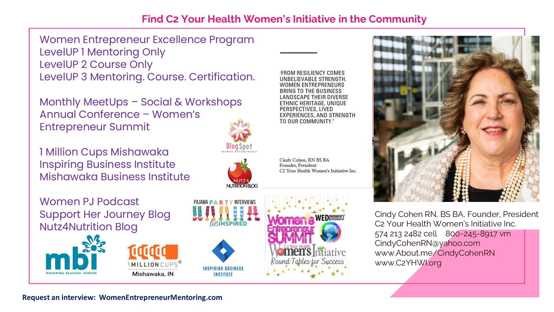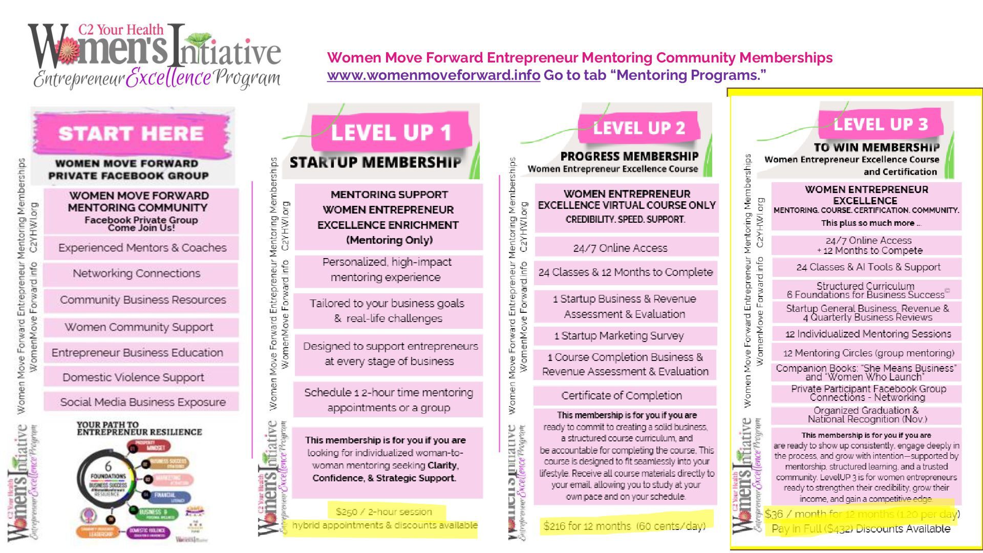 #2 Business Success Strategies, Scaling Up, Leadership Skill Development, Establishing Business Entity Foundation #3 Marketing Online & Offline, Customer Acquisition, Communicating Your Mission, Vision Foundation #4 Financial Literacy, Financial Assistance, COVID-19 Business Economic Relief Updates, Grants, Funding Resources Foundation #5 Business & Personal Wellness, Mental Health Tools Foundation #6 Community Engagement, Resources, Connections, Domestic Violence Education, HOT Community Ambassador Program International Mentoring Association Accreditation Pending Tried and Proven System – Course Class Schedule - Graduation Graduation Requirement Highlights Submit Video introduction - 60 seconds (required) Start-Up & completion surveys, market survey, start-up business evaluations + initial mentoring interview session (required) Business 4 quarterly evaluations (all required) Final business assessment - Final business evaluation, surveys, + final mentoring session (require Mentoring Appointments, (a minimum of 50% attendance) & Mentoring Circles (50% attendance) Completed 6 Foundations of Success Modules - 24 classes + 24 Class Surveys Assignment: Complete ONE-page Business Plan, Community PPT 1 Million Cups presentation Request an interview: WomenEntrepreneurMentoring.com