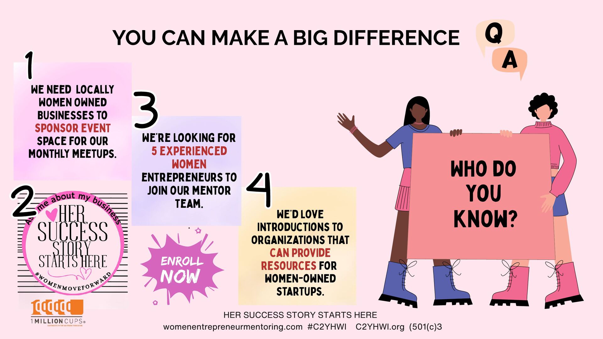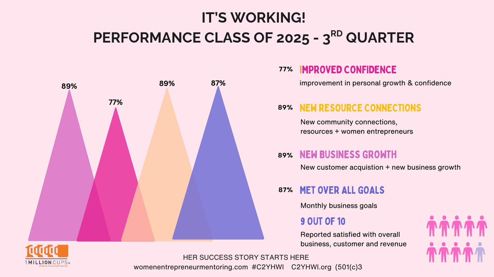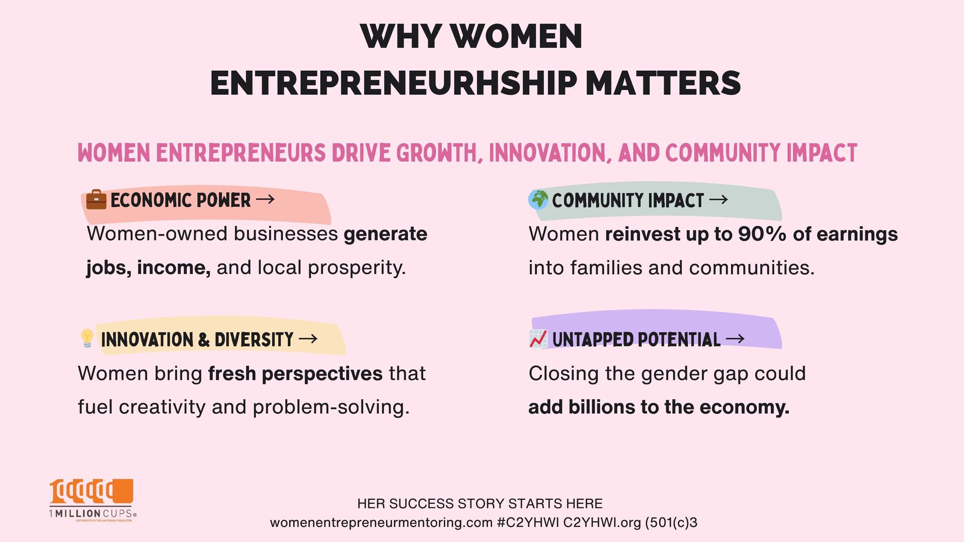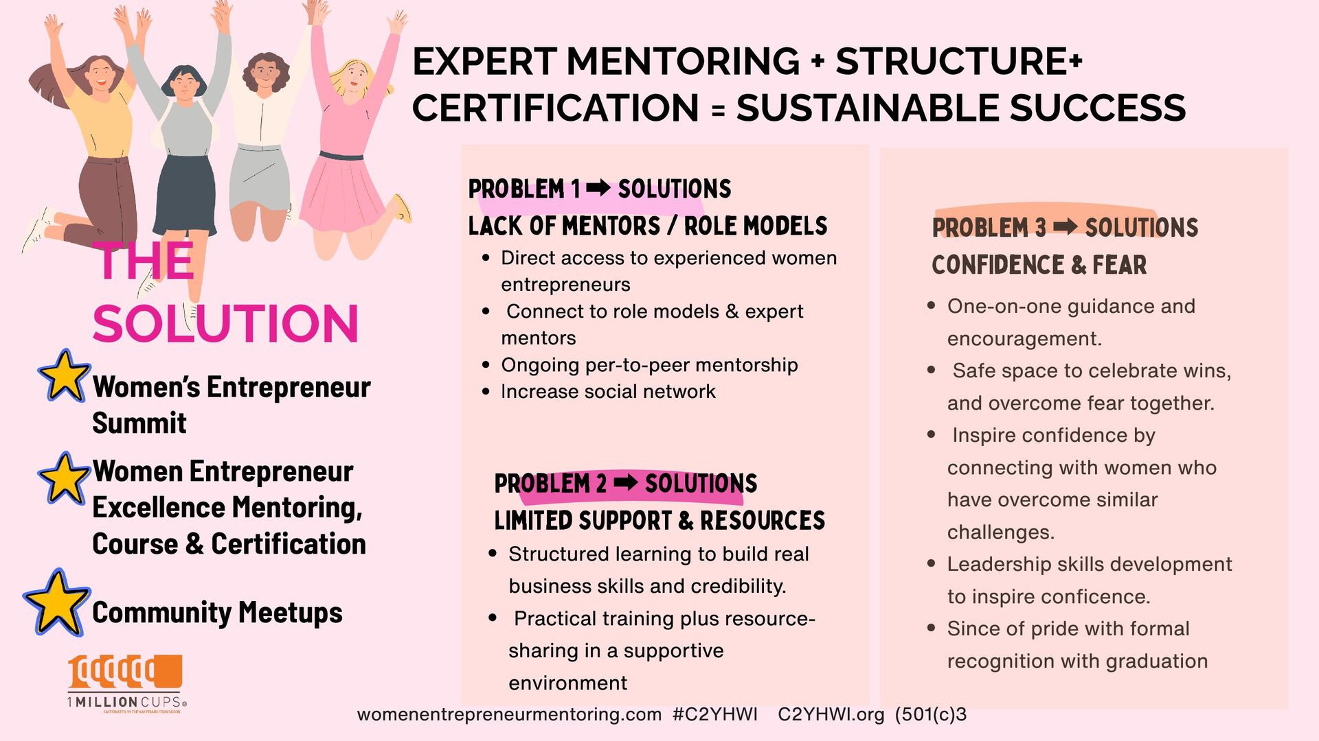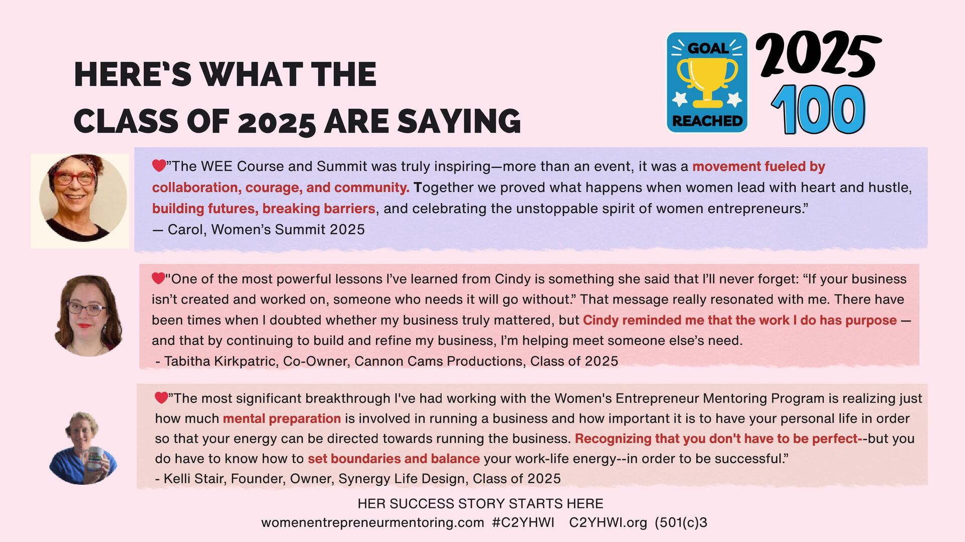 is something she said that I’ll never forget: “If your business isn’t created and worked on, someone who needs it will go without.” That message really resonated with me. There have been times when I doubted whether my business truly mattered, but Cindy reminded me that the work I do has purpose — and that by continuing to build and refine my business, I’m helping meet someone else’s need. - Tabitha Kirkpatric, Co-Owner, Cannon Cams Productions, Class of 2025 ❤️”The WEE Course and Summit was truly inspiring—more than an event, it was a movement fueled by collaboration, courage, and community. Together we proved what happens when women lead with heart and hustle, building futures, breaking barriers, and celebrating the unstoppable spirit of women entrepreneurs.” — Carol, Women’s Summit 2025 HERE’S WHAT THE CLASS OF 2025 ARE SAYING ❤️”The most significant breakthrough I've had working with the Women's Entrepreneur Mentoring Program is realizing just how much mental preparation is involved in running a business and how important it is to have your personal life in order so that your energy can be directed towards running the business. Recognizing that you don't have to be perfect--but you do have to know how to set boundaries and balance your work-life energy--in order to be successful.” - Kelli Stair, Founder, Owner, Synergy Life Design, Class of 2025 HER SUCCESS STORY STARTS HERE womenentrepreneurmentoring.com #C2YHWI C2YHWI.org (501(c)3