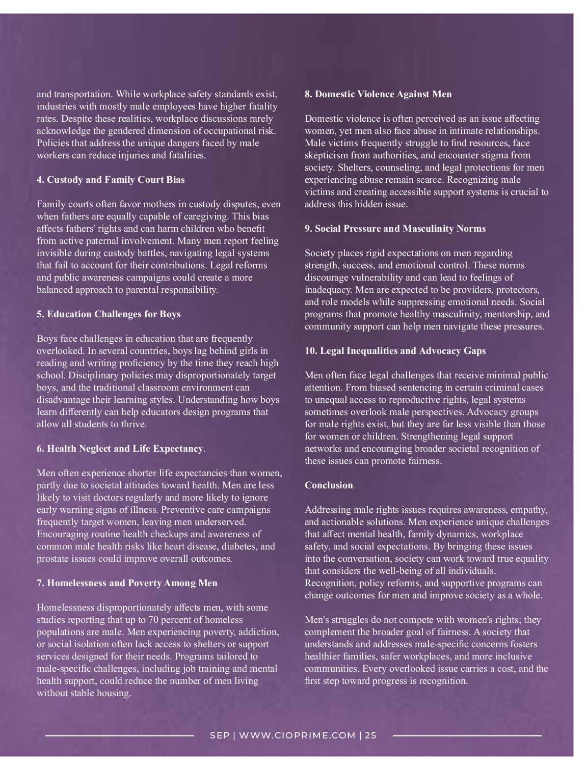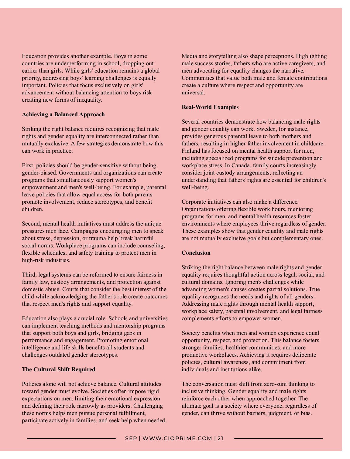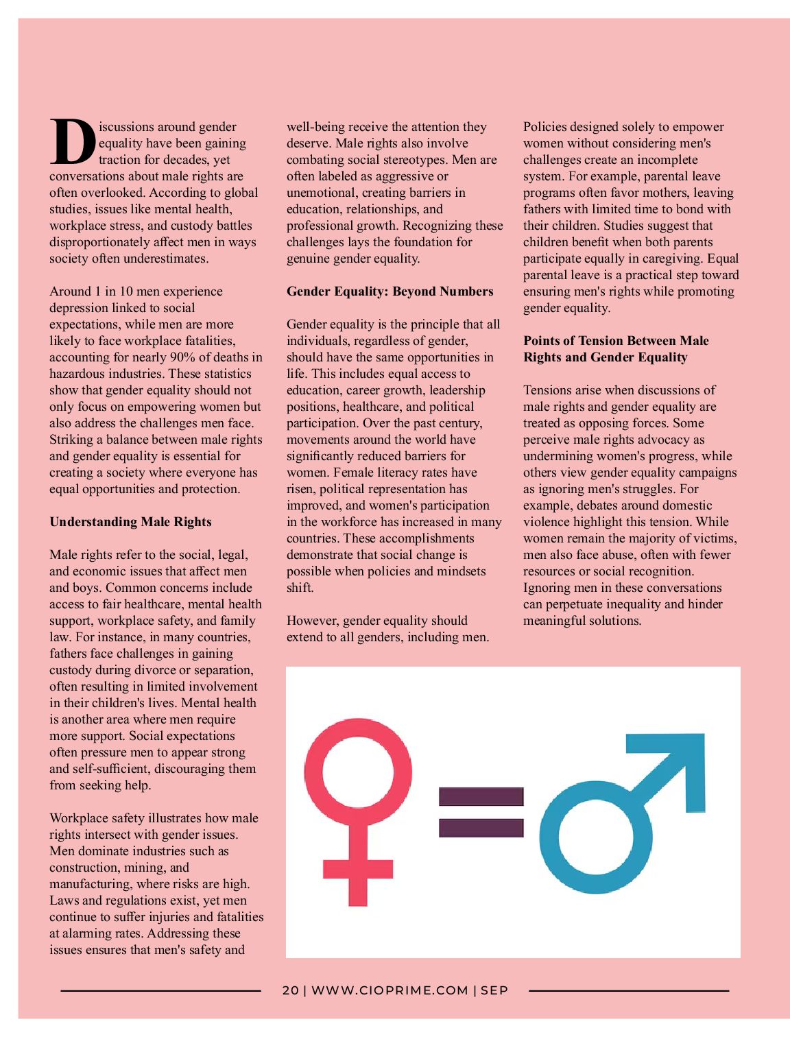 in school, dropping out earlier than girls. While girls' education remains a global priority, addressing boys' learning challenges is equally important. Policies that focus exclusively on girls' advancement without balancing attention to boys risk creating new forms of inequality. Achieving a Balanced Approach Striking the right balance requires recognizing that male rights and gender equality are interconnected rather than mutually exclusive. A few strategies demonstrate how this can work in practice. First, policies should be gender-sensitive without being gender-biased. Governments and organizations can create programs that simultaneously support women's empowerment and men's well-being. For example, parental leave policies that allow equal access for both parents promote involvement, reduce stereotypes, and benefit children. Second, mental health initiatives must address the unique pressures men face. Campaigns encouraging men to speak about stress, depression, or trauma help break harmful social norms. Workplace programs can include counseling, flexible schedules, and safety training to protect men in high-risk industries. Third, legal systems can be reformed to ensure fairness in family law, custody arrangements, and protection against domestic abuse. Courts that consider the best interest of the child while acknowledging the father's role create outcomes that respect men's rights and support equality. Education also plays a crucial role. Schools and universities can implement teaching methods and mentorship programs that support both boys and girls, bridging gaps in performance and engagement. Promoting emotional intelligence and life skills benefits all students and challenges outdated gender stereotypes. The Cultural Shift Required Policies alone will not achieve balance. Cultural attitudes toward gender must evolve. Societies often impose rigid expectations on men, limiting their emotional expression and defining their role narrowly as providers. Challenging these norms helps men pursue personal fulfillment, participate actively in families, and seek help when needed. Media and storytelling also shape perceptions. Highlighting male success stories, fathers who are active caregivers, and men advocating for equality changes the narrative. Communities that value both male and female contributions create a culture where respect and opportunity are universal. Real-World Examples Several countries demonstrate how balancing male rights and gender equality can work. Sweden, for instance, provides generous parental leave to both mothers and fathers, resulting in higher father involvement in childcare. Finland has focused on mental health support for men, including specialized programs for suicide prevention and workplace stress. In Canada, family courts increasingly consider joint custody arrangements, reflecting an understanding that fathers' rights are essential for children's well-being. Corporate initiatives can also make a difference. Organizations offering flexible work hours, mentoring programs for men, and mental health resources foster environments where employees thrive regardless of gender. These examples show that gender equality and male rights are not mutually exclusive goals but complementary ones. Conclusion Striking the right balance between male rights and gender equality requires thoughtful action across legal, social, and cultural domains. Ignoring men's challenges while advancing women's causes creates partial solutions. True equality recognizes the needs and rights of all genders. Addressing male rights through mental health support, workplace safety, parental involvement, and legal fairness complements efforts to empower women. Society benefits when men and women experience equal opportunity, respect, and protection. This balance fosters stronger families, healthier communities, and more productive workplaces. Achieving it requires deliberate policies, cultural awareness, and commitment from individuals and institutions alike. The conversation must shift from zero-sum thinking to inclusive thinking. Gender equality and male rights reinforce each other when approached together. The ultimate goal is a society where everyone, regardless of gender, can thrive without barriers, judgment, or bias. SEP | WWW.CIOPRIME.COM | 21