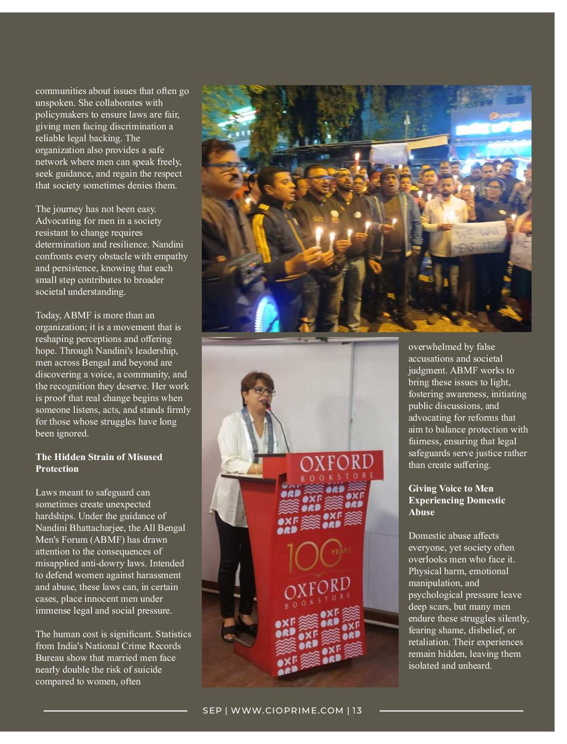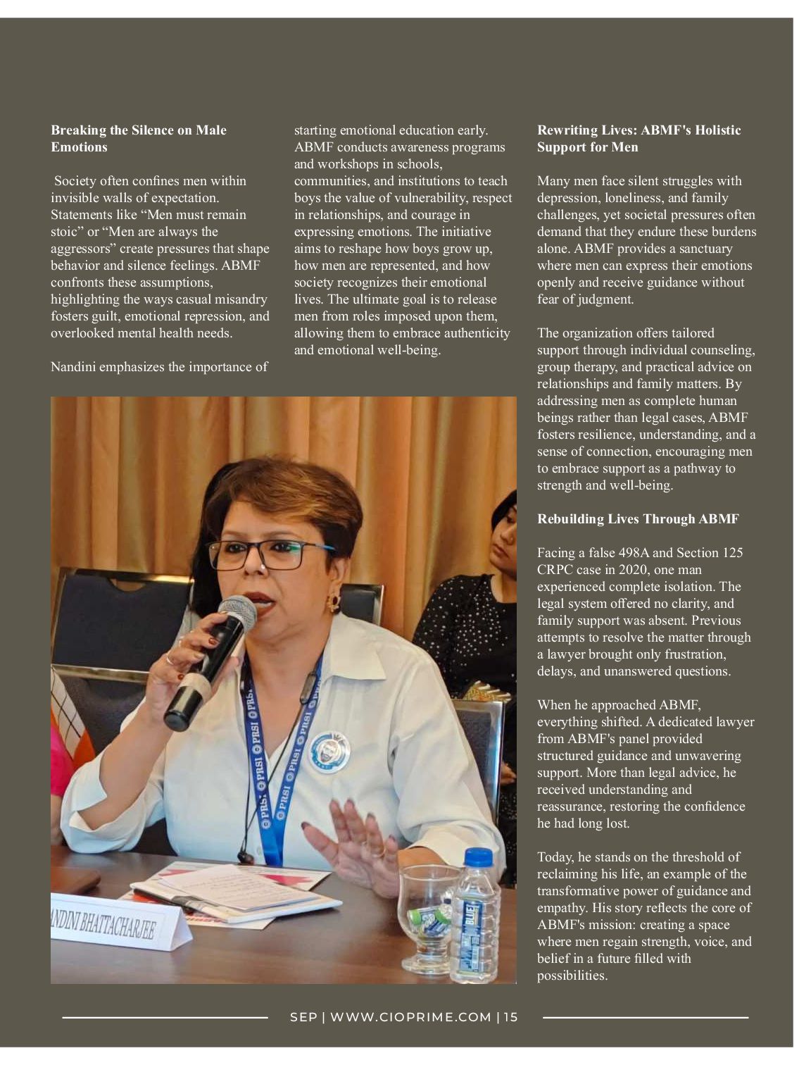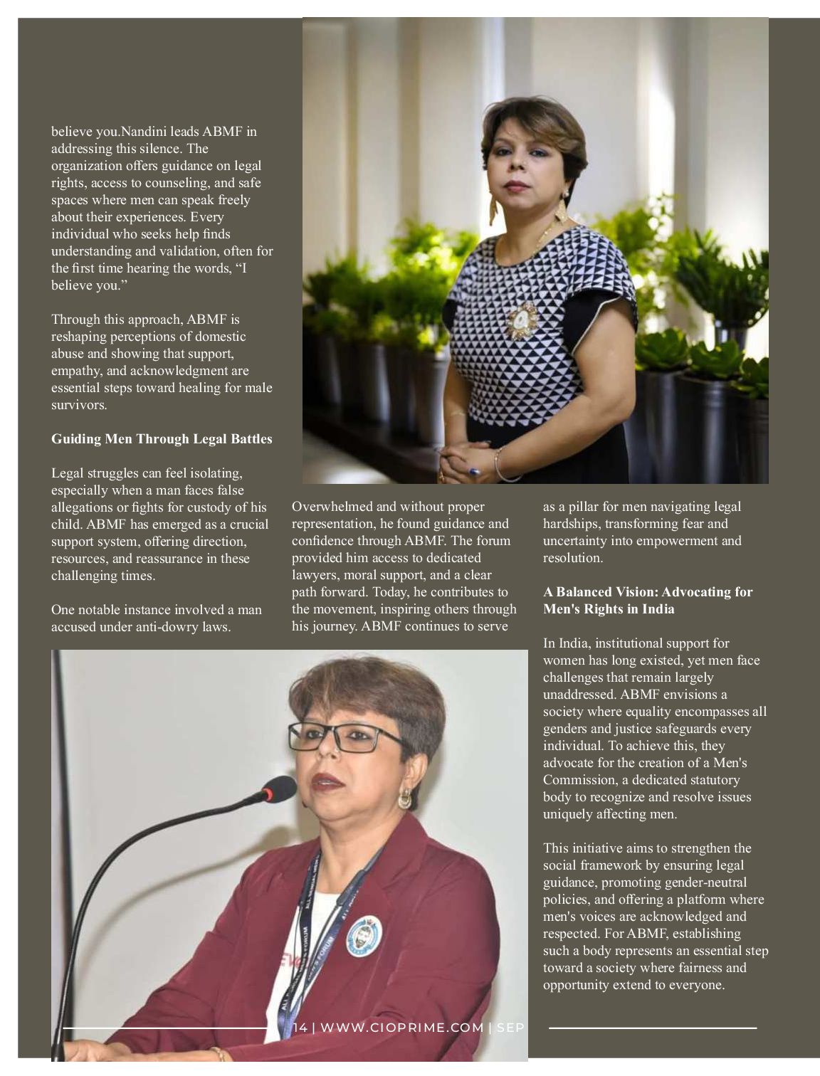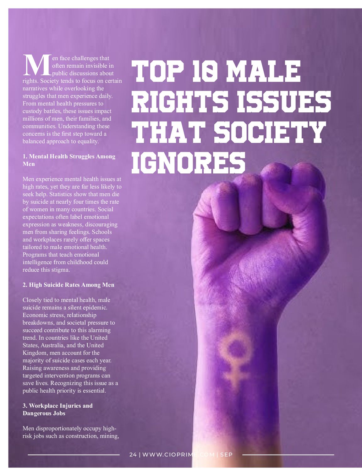 in school, dropping out earlier than girls. While girls' education remains a global priority, addressing boys' learning challenges is equally important. Policies that focus exclusively on girls' advancement without balancing attention to boys risk creating new forms of inequality. Achieving a Balanced Approach Striking the right balance requires recognizing that male rights and gender equality are interconnected rather than mutually exclusive. A few strategies demonstrate how this can work in practice. First, policies should be gender-sensitive without being gender-biased. Governments and organizations can create programs that simultaneously support women's empowerment and men's well-being. For example, parental leave policies that allow equal access for both parents promote involvement, reduce stereotypes, and benefit children. Second, mental health initiatives must address the unique pressures men face. Campaigns encouraging men to speak about stress, depression, or trauma help break harmful social norms. Workplace programs can include counseling, flexible schedules, and safety training to protect men in high-risk industries. Third, legal systems can be reformed to ensure fairness in family law, custody arrangements, and protection against domestic abuse. Courts that consider the best interest of the child while acknowledging the father's role create outcomes that respect men's rights and support equality. Education also plays a crucial role. Schools and universities can implement teaching methods and mentorship programs that support both boys and girls, bridging gaps in performance and engagement. Promoting emotional intelligence and life skills benefits all students and challenges outdated gender stereotypes. The Cultural Shift Required Policies alone will not achieve balance. Cultural attitudes toward gender must evolve. Societies often impose rigid expectations on men, limiting their emotional expression and defining their role narrowly as providers. Challenging these norms helps men pursue personal fulfillment, participate actively in families, and seek help when needed. Media and storytelling also shape perceptions. Highlighting male success stories, fathers who are active caregivers, and men advocating for equality changes the narrative. Communities that value both male and female contributions create a culture where respect and opportunity are universal. Real-World Examples Several countries demonstrate how balancing male rights and gender equality can work. Sweden, for instance, provides generous parental leave to both mothers and fathers, resulting in higher father involvement in childcare. Finland has focused on mental health support for men, including specialized programs for suicide prevention and workplace stress. In Canada, family courts increasingly consider joint custody arrangements, reflecting an understanding that fathers' rights are essential for children's well-being. Corporate initiatives can also make a difference. Organizations offering flexible work hours, mentoring programs for men, and mental health resources foster environments where employees thrive regardless of gender. These examples show that gender equality and male rights are not mutually exclusive goals but complementary ones. Conclusion Striking the right balance between male rights and gender equality requires thoughtful action across legal, social, and cultural domains. Ignoring men's challenges while advancing women's causes creates partial solutions. True equality recognizes the needs and rights of all genders. Addressing male rights through mental health support, workplace safety, parental involvement, and legal fairness complements efforts to empower women. Society benefits when men and women experience equal opportunity, respect, and protection. This balance fosters stronger families, healthier communities, and more productive workplaces. Achieving it requires deliberate policies, cultural awareness, and commitment from individuals and institutions alike. The conversation must shift from zero-sum thinking to inclusive thinking. Gender equality and male rights reinforce each other when approached together. The ultimate goal is a society where everyone, regardless of gender, can thrive without barriers, judgment, or bias. SEP | WWW.CIOPRIME.COM | 21