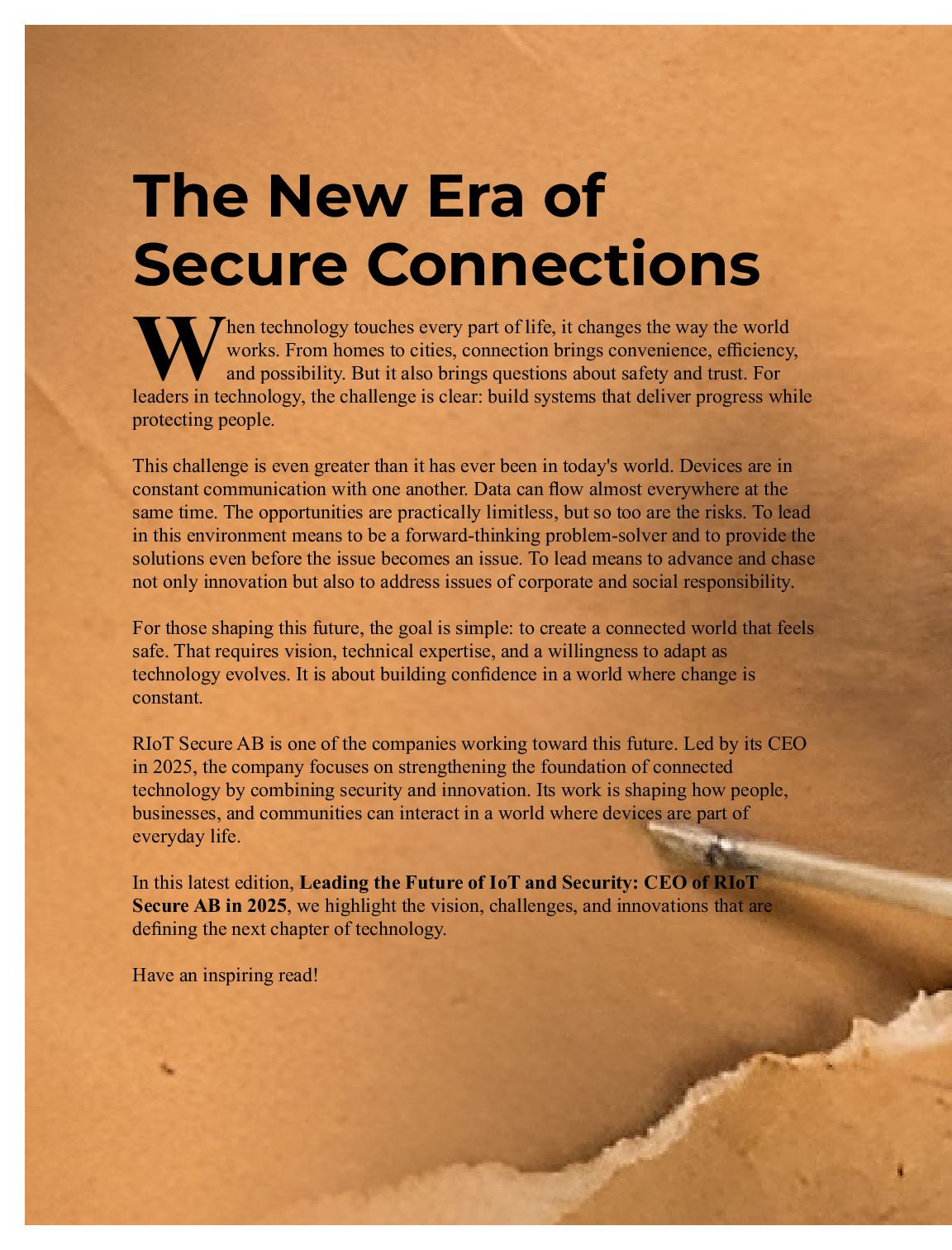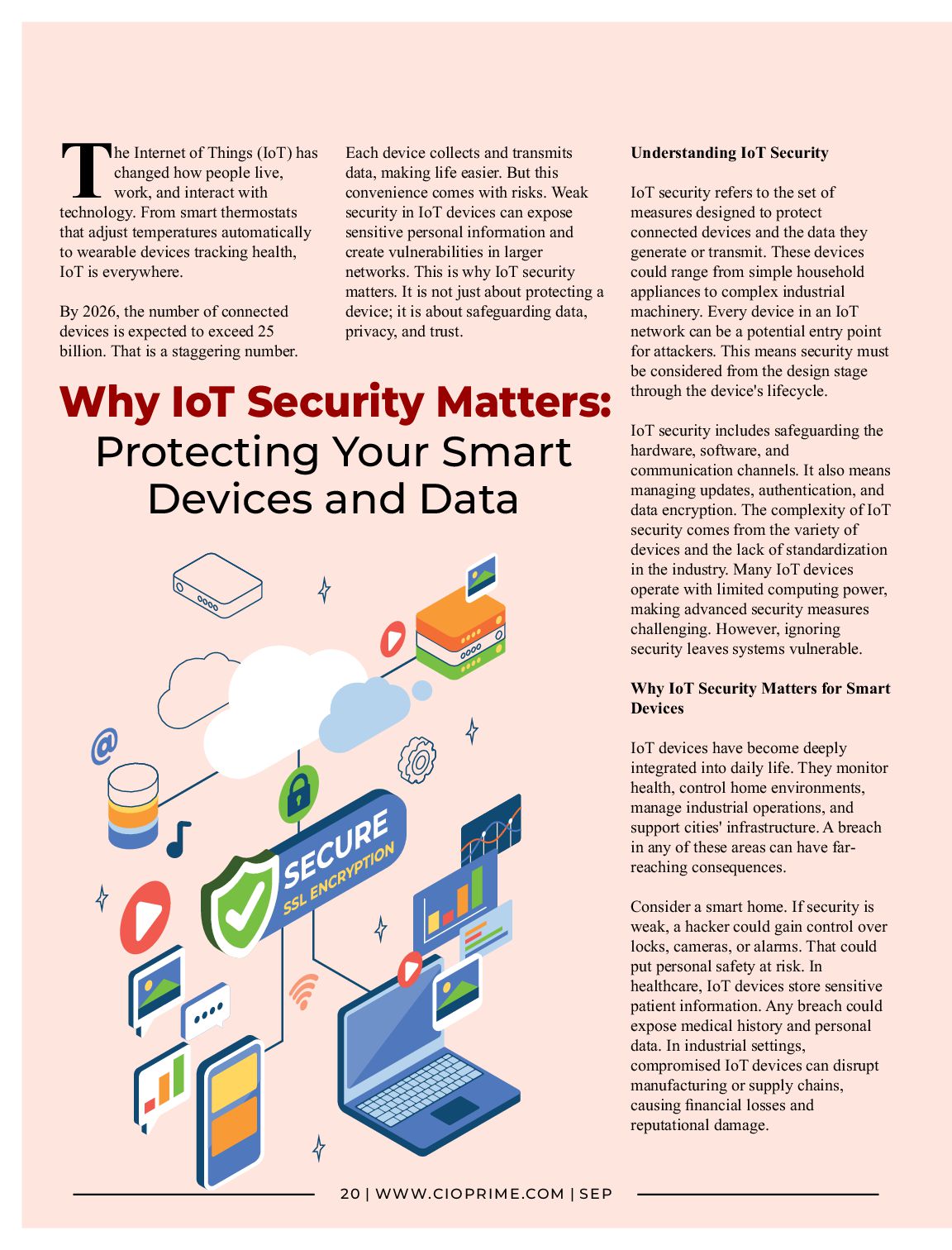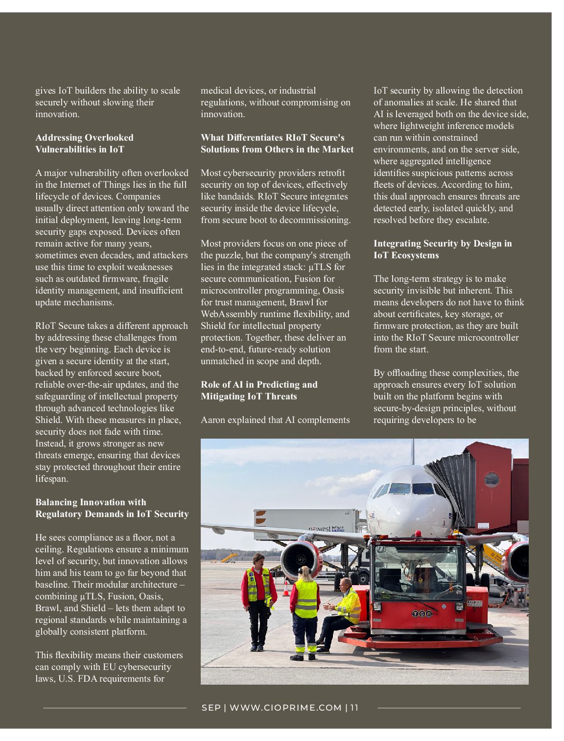 RIoT Secure's Future Aaron explained that partnerships are essential because IoT does not exist in isolation. By collaborating with larger enterprises, RIoT Secure integrates into their ecosystems; by working with governments and standards bodies, the company helps shape the frameworks that ensure safe, global adoption. He added that the goal is never only to comply with standards, but to help set them, so that device makers, regulators, and end-users all benefit from a consistent, trusted security foundation. Building a Culture of Innovation and Expertise at RIoT Secure RIoT Secure invests heavily in cultivating a learning-driven culture. Many of the engineers came from embedded backgrounds, and they have been trained to think like security architects. The company also creates opportunities for interns and researchers to explore advanced areas such as WASM runtimes for microcontrollers, a field where it has become a pioneer. This blend of mentorship, research, and real-world deployment fosters an environment where talent grows, stays, and thrives. Ethical and Safety Principles in IoT Leadership For him, the guiding principle is responsibility at scale. When devices control medical equipment, aircraft, or energy systems, failure is more than a data breach; it involves human lives. His leadership decisions always weigh innovation against resilience, prioritizing transparency, auditability, and trust. He believes IoT security must serve not only businesses, but society as a whole. Security Models in the Era of Edge, 5G, and Distributed Systems According to Aaron, these technologies shift intelligence closer to the edge, which increases both the attack surface and the value of each device. His team's response is to design lightweight runtimes and cryptographic stacks that allow even resource-constrained devices to operate securely in high-performance, low-latency environments. By leveraging 5G and edge processing, they also enable more distributed anomaly detection and policy enforcement, strengthening resilience at scale. Measuring Success in Delivering Trust and Resilience in IoT Networks Aaron explained that success is measured in three key ways. • The first is security integrity, which refers to how effectively devices resist tampering and breaches. • The second is lifecycle reliability, which reflects the ability to manage, update, and secure devices over the years in the field. • The third is developer efficiency, which indicates how quickly customers can move from prototype to secure deployment. According to him, when all three indicators are strong, it shows that trust and resilience are being delivered not only as a promise but also as a measurable outcome. RIoT Secure's Vision for Global IoT Security Projecting forward, five years, Aaron envisions RIoT Secure not just as a technology provider, but as a global benchmark for IoT security, making lifecycle protection as universal and unquestioned as HTTPS is for the web. He believes every connected device, from healthcare and aviation to smart cities and industrial automation, should be born with trust built in: authenticated, updatable, and resilient by design. The company is already taking steps to influence international standards, embed its architecture into communication modules and chipsets, and prove through large-scale deployments that security can be seamless without slowing innovation. The impact Aaron aims for is clear and measurable: devices that remain secure for a decade or more, developers who can bring solutions to market in half the time, and ecosystems that can update and evolve without fear of compromise. For him, success will be defined not by the number of devices secured, but by the fact that the global connected world is safer, more reliable, and more future-proof because RIoT Secure set the standard. 12 | WWW.CIOPRIME.COM | SEP