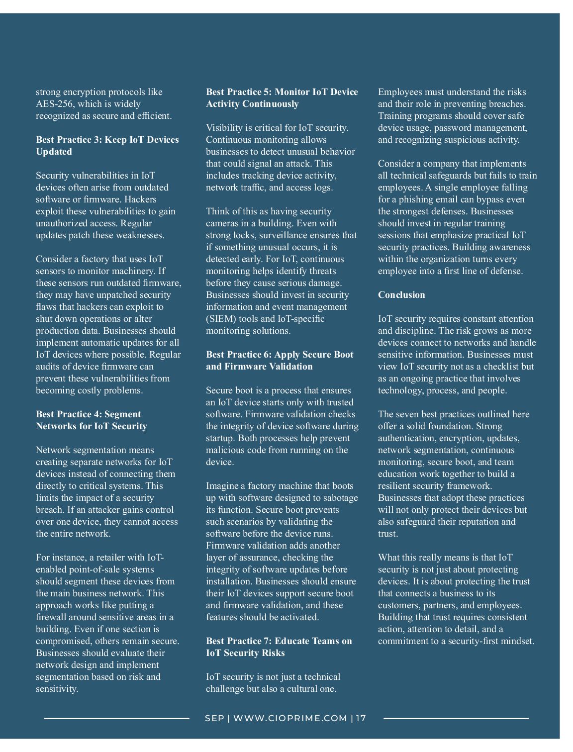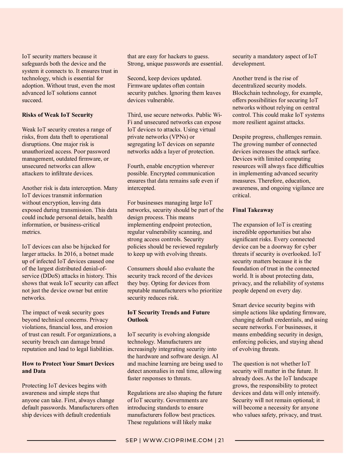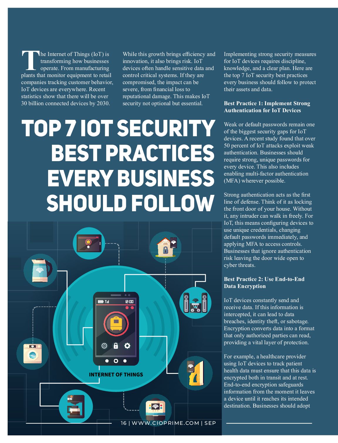 RIoT Secure's Future Aaron explained that partnerships are essential because IoT does not exist in isolation. By collaborating with larger enterprises, RIoT Secure integrates into their ecosystems; by working with governments and standards bodies, the company helps shape the frameworks that ensure safe, global adoption. He added that the goal is never only to comply with standards, but to help set them, so that device makers, regulators, and end-users all benefit from a consistent, trusted security foundation. Building a Culture of Innovation and Expertise at RIoT Secure RIoT Secure invests heavily in cultivating a learning-driven culture. Many of the engineers came from embedded backgrounds, and they have been trained to think like security architects. The company also creates opportunities for interns and researchers to explore advanced areas such as WASM runtimes for microcontrollers, a field where it has become a pioneer. This blend of mentorship, research, and real-world deployment fosters an environment where talent grows, stays, and thrives. Ethical and Safety Principles in IoT Leadership For him, the guiding principle is responsibility at scale. When devices control medical equipment, aircraft, or energy systems, failure is more than a data breach; it involves human lives. His leadership decisions always weigh innovation against resilience, prioritizing transparency, auditability, and trust. He believes IoT security must serve not only businesses, but society as a whole. Security Models in the Era of Edge, 5G, and Distributed Systems According to Aaron, these technologies shift intelligence closer to the edge, which increases both the attack surface and the value of each device. His team's response is to design lightweight runtimes and cryptographic stacks that allow even resource-constrained devices to operate securely in high-performance, low-latency environments. By leveraging 5G and edge processing, they also enable more distributed anomaly detection and policy enforcement, strengthening resilience at scale. Measuring Success in Delivering Trust and Resilience in IoT Networks Aaron explained that success is measured in three key ways. • The first is security integrity, which refers to how effectively devices resist tampering and breaches. • The second is lifecycle reliability, which reflects the ability to manage, update, and secure devices over the years in the field. • The third is developer efficiency, which indicates how quickly customers can move from prototype to secure deployment. According to him, when all three indicators are strong, it shows that trust and resilience are being delivered not only as a promise but also as a measurable outcome. RIoT Secure's Vision for Global IoT Security Projecting forward, five years, Aaron envisions RIoT Secure not just as a technology provider, but as a global benchmark for IoT security, making lifecycle protection as universal and unquestioned as HTTPS is for the web. He believes every connected device, from healthcare and aviation to smart cities and industrial automation, should be born with trust built in: authenticated, updatable, and resilient by design. The company is already taking steps to influence international standards, embed its architecture into communication modules and chipsets, and prove through large-scale deployments that security can be seamless without slowing innovation. The impact Aaron aims for is clear and measurable: devices that remain secure for a decade or more, developers who can bring solutions to market in half the time, and ecosystems that can update and evolve without fear of compromise. For him, success will be defined not by the number of devices secured, but by the fact that the global connected world is safer, more reliable, and more future-proof because RIoT Secure set the standard. 12 | WWW.CIOPRIME.COM | SEP