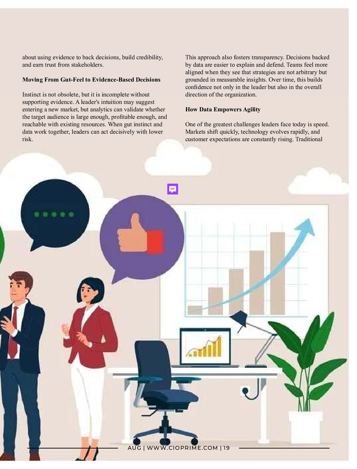 trust from stakeholders. Moving From Gut-Feel to Evidence-Based Decisions Instinct is not obsolete, but it is incomplete without supporting evidence. A leader's intuition may suggest entering a new market, but analytics can validate whether the target audience is large enough, profitable enough, and reachable with existing resources. When gut instinct and data work together, leaders can act decisively with lower risk. This approach also fosters transparency. Decisions backed by data are easier to explain and defend. Teams feel more aligned when they see that strategies are not arbitrary but grounded in measurable insights. Over time, this builds confidence not only in the leader but also in the overall direction of the organization. How Data Empowers Agility One of the greatest challenges leaders face today is speed. Markets shift quickly, technology evolves rapidly, and customer expectations are constantly rising. Traditional AUG | WWW.CIOPRIME.COM | 19