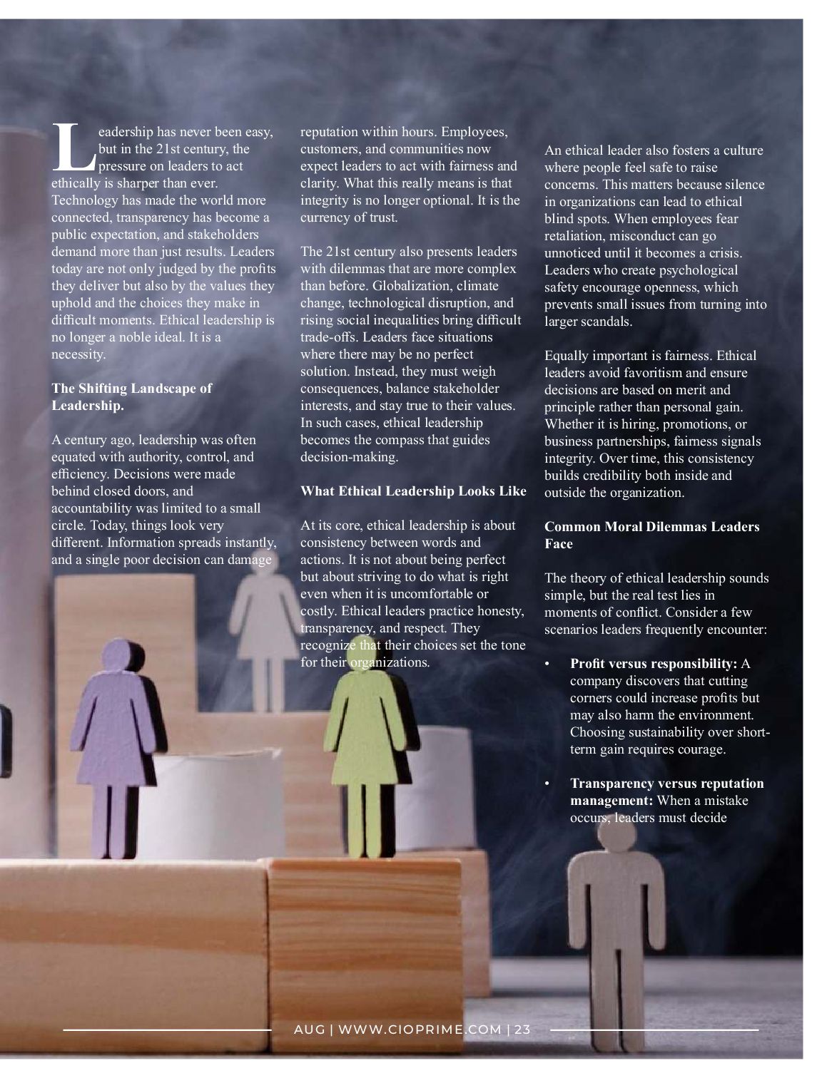image. Honesty may bring temporary backlash but fosters long-term trust. • Loyalty versus justice: A senior executive contributes greatly to the company but engages in misconduct. Protecting them may seem convenient, but accountability demands action. • Innovation versus privacy: With advances in data and AI, leaders must decide how to innovate without exploiting customer information. Respect for privacy is often the ethical line. In each of these dilemmas, there is no easy answer. Ethical leadership is about finding a path that aligns with principles while considering broader consequences. The Role of Integrity in Decision-Making Integrity is the foundation that allows leaders to navigate uncertainty. It means acting in line with one's values regardless of external pressure. In practice, integrity often requires slowing down decision-making to ask tough questions: Will this action harm people? Is it consistent with our values? Would I be comfortable if this decision was made public? Leaders who consistently apply integrity earn trust, and trust is the most valuable asset in today's interconnected world. Without it, relationships with employees, customers, and partners break down quickly. With it, organizations can withstand crises because stakeholders believe in the sincerity of their leaders. Developing Ethical Leaders The good news is that ethical leadership is not limited to a chosen few. It can be cultivated. Organizations can develop ethical leaders by prioritizing values in hiring and promotion, offering training on moral reasoning, and establishing clear codes of conduct. Mentorship also plays a role, as younger leaders often model the behaviors they see in their seniors. Beyond organizational systems, self-awareness is critical. Leaders must reflect on their motivations and biases. Those who are willing to examine their own blind spots are better equipped to lead with fairness. Humility is also key. Ethical leaders admit mistakes, learn from them, and demonstrate accountability. This humility strengthens their credibility and sets a powerful example for others. Why Ethical Leadership Matters Now More Than Ever The challenges of the 21st century will not ease. Artificial intelligence will raise new questions about accountability. Climate change will intensify debates about responsibility and resource use. Social movements will continue to demand inclusion and fairness. In this environment, leaders who prioritize ethics will not only survive but thrive. Ethical leadership is not about avoiding mistakes but about how leaders respond to them. It is about having the courage to stand by principles when the easier option is to compromise. When leaders act with integrity, they do more than protect their own reputation. They build stronger organizations, contribute to healthier societies, and inspire others to lead with conscience. Closing Thoughts The 21st century demands leaders who can navigate complexity with moral clarity. Ethical leadership is not a luxury or a public relations strategy. It is the anchor that holds organizations steady when storms hit. By practicing honesty, fairness, and integrity, leaders can face dilemmas with confidence and guide their organizations toward a future where success is measured not just by profit, but by the values that shaped the journey. 24 | WWW.CIOPRIME.COM | AUG