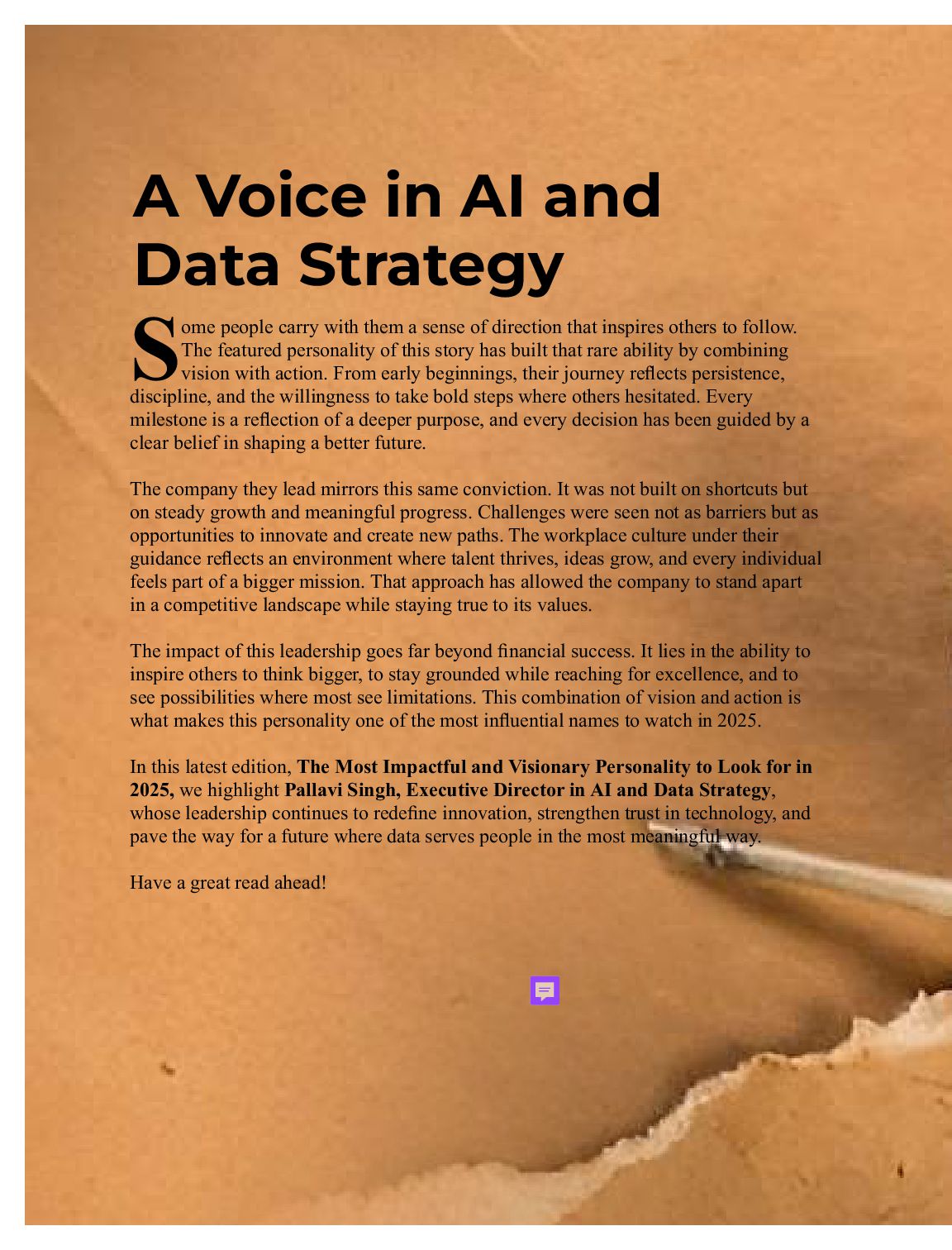 inspires others to follow. SThe featured personality of this story has built that rare ability by combining vision with action. From early beginnings, their journey reflects persistence, discipline, and the willingness to take bold steps where others hesitated. Every milestone is a reflection of a deeper purpose, and every decision has been guided by a clear belief in shaping a better future. The company they lead mirrors this same conviction. It was not built on shortcuts but on steady growth and meaningful progress. Challenges were seen not as barriers but as opportunities to innovate and create new paths. The workplace culture under their guidance reflects an environment where talent thrives, ideas grow, and every individual feels part of a bigger mission. That approach has allowed the company to stand apart in a competitive landscape while staying true to its values. The impact of this leadership goes far beyond financial success. It lies in the ability to inspire others to think bigger, to stay grounded while reaching for excellence, and to see possibilities where most see limitations. This combination of vision and action is what makes this personality one of the most influential names to watch in 2025. In this latest edition, The Most Impactful and Visionary Personality to Look for in 2025, we highlight Pallavi Singh, Executive Director in AI and Data Strategy, whose leadership continues to redefine innovation, strengthen trust in technology, and pave the way for a future where data serves people in the most meaningful way. Have a great read ahead! A Voice in AI and Data Strategy
