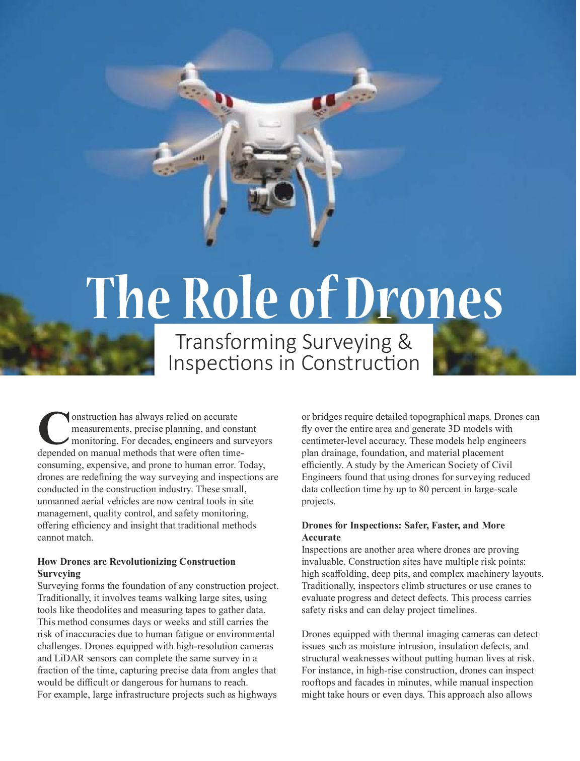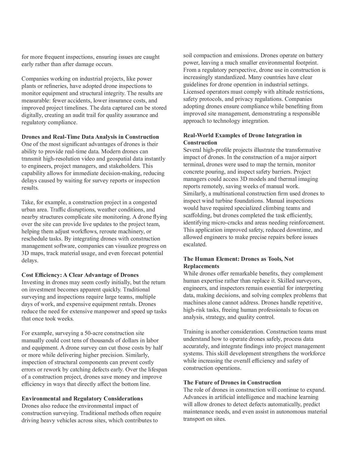 than after damage occurs. Companies working on industrial projects, like power plants or refineries, have adopted drone inspections to monitor equipment and structural integrity. The results are measurable: fewer accidents, lower insurance costs, and improved project timelines. The data captured can be stored digitally, creating an audit trail for quality assurance and regulatory compliance. Drones and Real-Time Data Analysis in Construction One of the most significant advantages of drones is their ability to provide real-time data. Modern drones can transmit high-resolution video and geospatial data instantly to engineers, project managers, and stakeholders. This capability allows for immediate decision-making, reducing delays caused by waiting for survey reports or inspection results. Take, for example, a construction project in a congested urban area. Traffic disruptions, weather conditions, and nearby structures complicate site monitoring. A drone flying over the site can provide live updates to the project team, helping them adjust workflows, reroute machinery, or reschedule tasks. By integrating drones with construction management software, companies can visualize progress on 3D maps, track material usage, and even forecast potential delays. Cost Efficiency: A Clear Advantage of Drones Investing in drones may seem costly initially, but the return on investment becomes apparent quickly. Traditional surveying and inspections require large teams, multiple days of work, and expensive equipment rentals. Drones reduce the need for extensive manpower and speed up tasks that once took weeks. For example, surveying a 50-acre construction site manually could cost tens of thousands of dollars in labor and equipment. A drone survey can cut those costs by half or more while delivering higher precision. Similarly, inspection of structural components can prevent costly errors or rework by catching defects early. Over the lifespan of a construction project, drones save money and improve efficiency in ways that directly affect the bottom line. Environmental and Regulatory Considerations Drones also reduce the environmental impact of construction surveying. Traditional methods often require driving heavy vehicles across sites, which contributes to soil compaction and emissions. Drones operate on battery power, leaving a much smaller environmental footprint. From a regulatory perspective, drone use in construction is increasingly standardized. Many countries have clear guidelines for drone operation in industrial settings. Licensed operators must comply with altitude restrictions, safety protocols, and privacy regulations. Companies adopting drones ensure compliance while benefiting from improved site management, demonstrating a responsible approach to technology integration. Real-World Examples of Drone Integration in Construction Several high-profile projects illustrate the transformative impact of drones. In the construction of a major airport terminal, drones were used to map the terrain, monitor concrete pouring, and inspect safety barriers. Project managers could access 3D models and thermal imaging reports remotely, saving weeks of manual work. Similarly, a multinational construction firm used drones to inspect wind turbine foundations. Manual inspections would have required specialized climbing teams and scaffolding, but drones completed the task efficiently, identifying micro-cracks and areas needing reinforcement. This application improved safety, reduced downtime, and allowed engineers to make precise repairs before issues escalated. The Human Element: Drones as Tools, Not Replacements While drones offer remarkable benefits, they complement human expertise rather than replace it. Skilled surveyors, engineers, and inspectors remain essential for interpreting data, making decisions, and solving complex problems that machines alone cannot address. Drones handle repetitive, high-risk tasks, freeing human professionals to focus on analysis, strategy, and quality control. Training is another consideration. Construction teams must understand how to operate drones safely, process data accurately, and integrate findings into project management systems. This skill development strengthens the workforce while increasing the overall efficiency and safety of construction operations. The Future of Drones in Construction The role of drones in construction will continue to expand. Advances in artificial intelligence and machine learning will allow drones to detect defects automatically, predict maintenance needs, and even assist in autonomous material transport on sites.