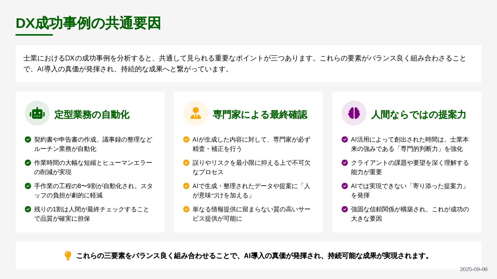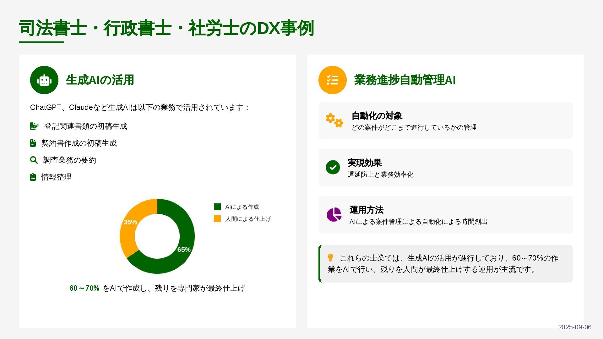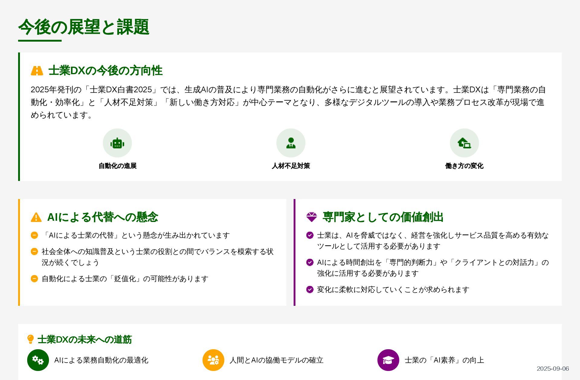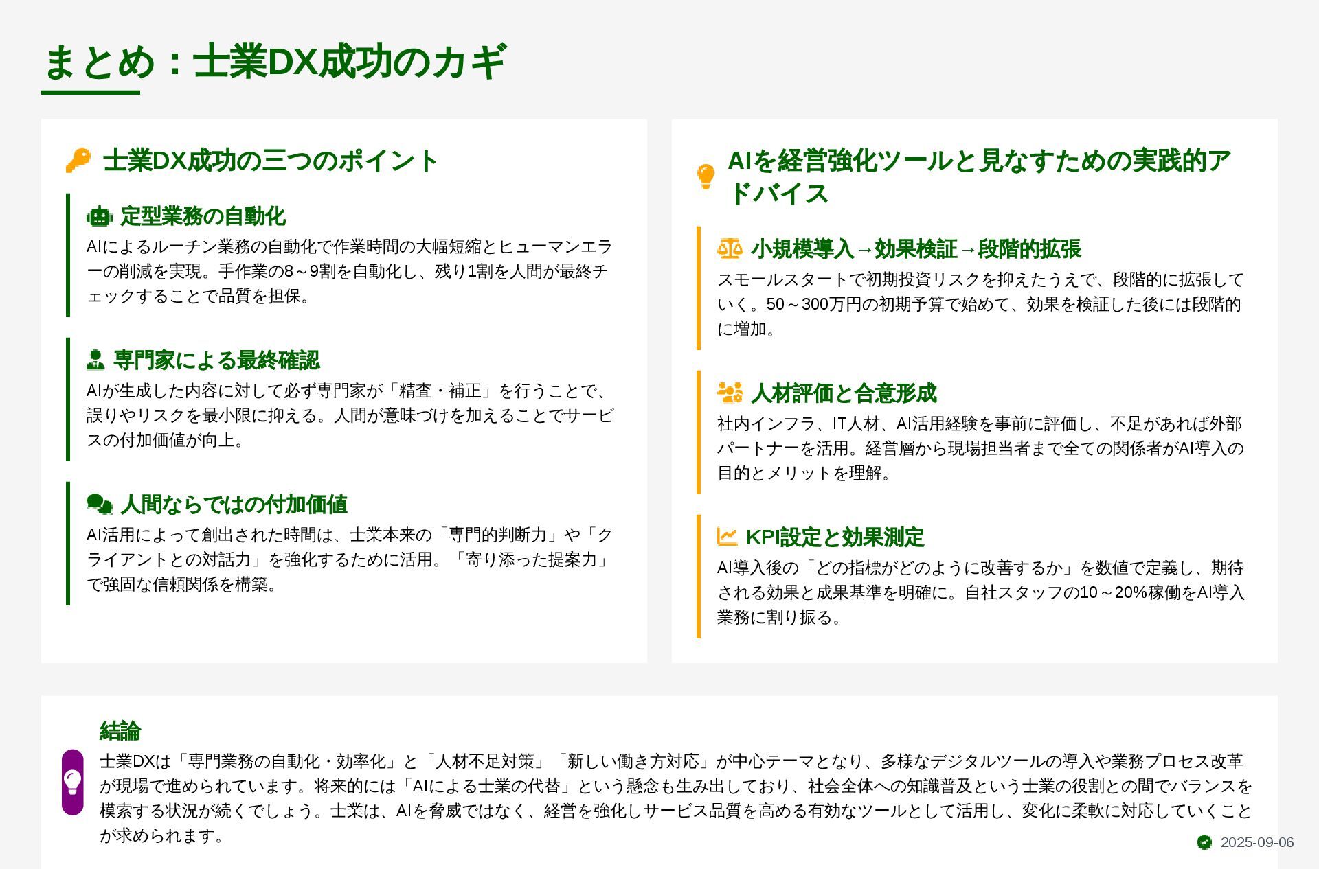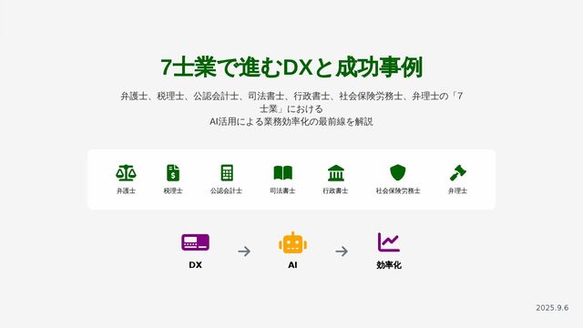 人間ならではの付加価値 AI活用によって創出された時間は、士業本来の「専門的判断力」や「ク ライアントとの対話力」を強化するために活用。「寄り添った提案力」 で強固な信頼関係を構築。 AIを経営強化ツールと見なすための実践的ア ドバイス 小規模導入→効果検証→段階的拡張 スモールスタートで初期投資リスクを抑えたうえで、段階的に拡張して いく。50~300万円の初期予算で始めて、効果を検証した後には段階的 に増加。 人材評価と合意形成 社内インフラ、IT人材、AI活用経験を事前に評価し、不足があれば外部 パートナーを活用。経営層から現場担当者まで全ての関係者がAI導入の 目的とメリットを理解。 KPI設定と効果測定 AI導入後の「どの指標がどのように改善するか」を数値で定義し、期待 される効果と成果基準を明確に。自社スタッフの10~20%稼働をAI導入 業務に割り振る。 結論 士業DXは「専門業務の自動化・効率化」と「人材不足対策」「新しい働き方対応」が中心テーマとなり、多様なデジタルツールの導入や業務プロセス改革 が現場で進められています。将来的には「AIによる士業の代替」という懸念も生み出しており、社会全体への知識普及という士業の役割との間でバランスを 模索する状況が続くでしょう。士業は、AIを脅威ではなく、経営を強化しサービス品質を高める有効なツールとして活用し、変化に柔軟に対応していくこと が求められます。 2025-09-06