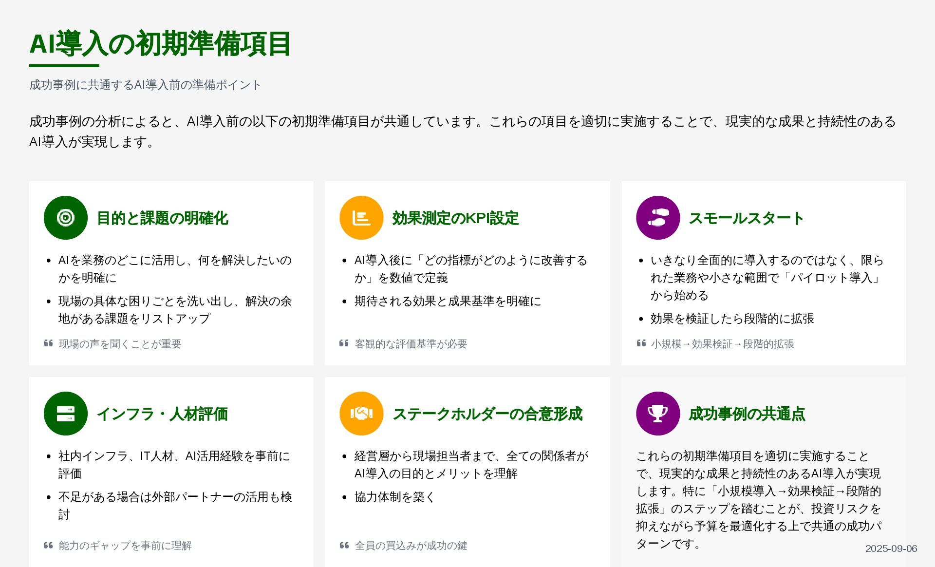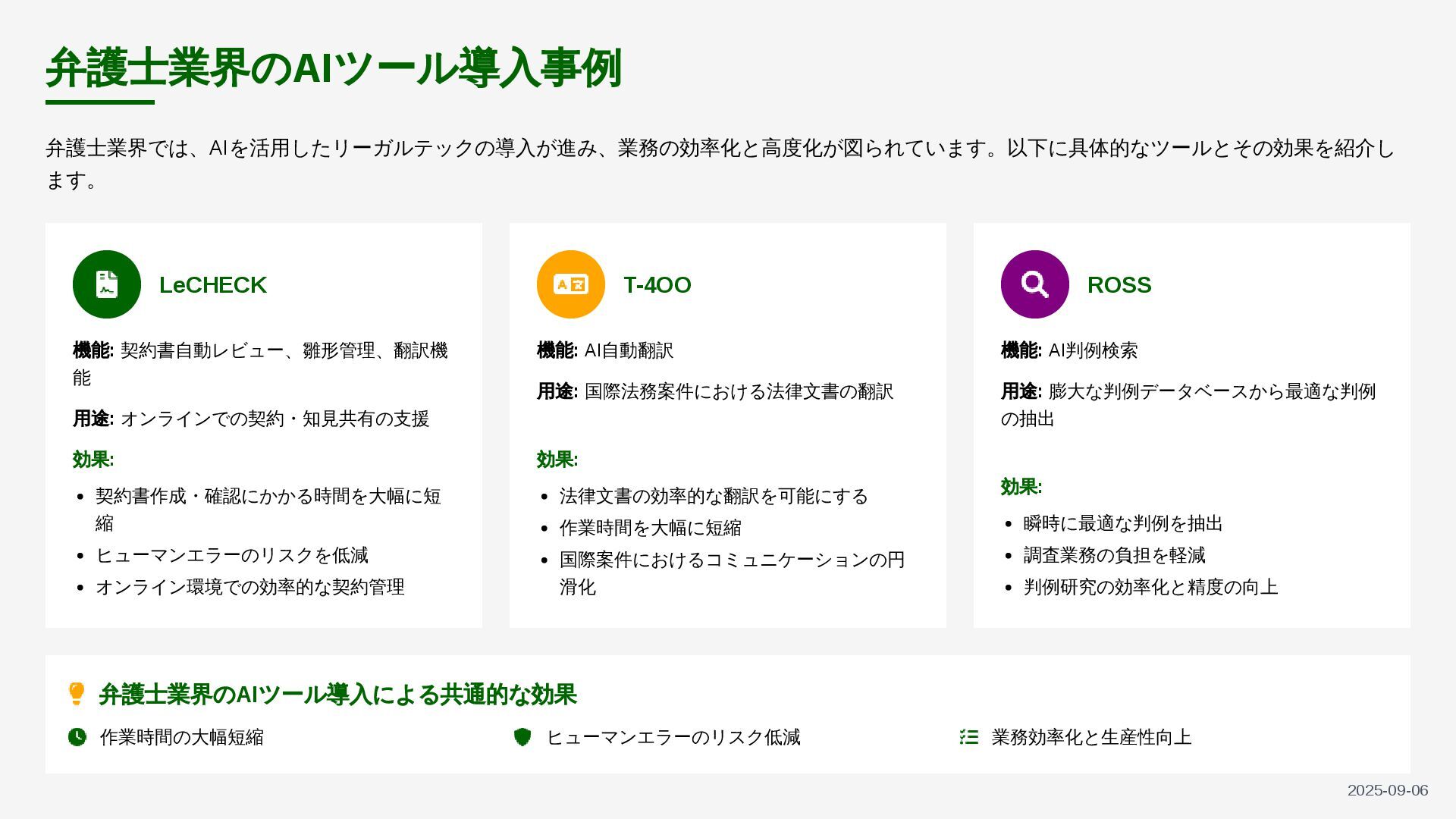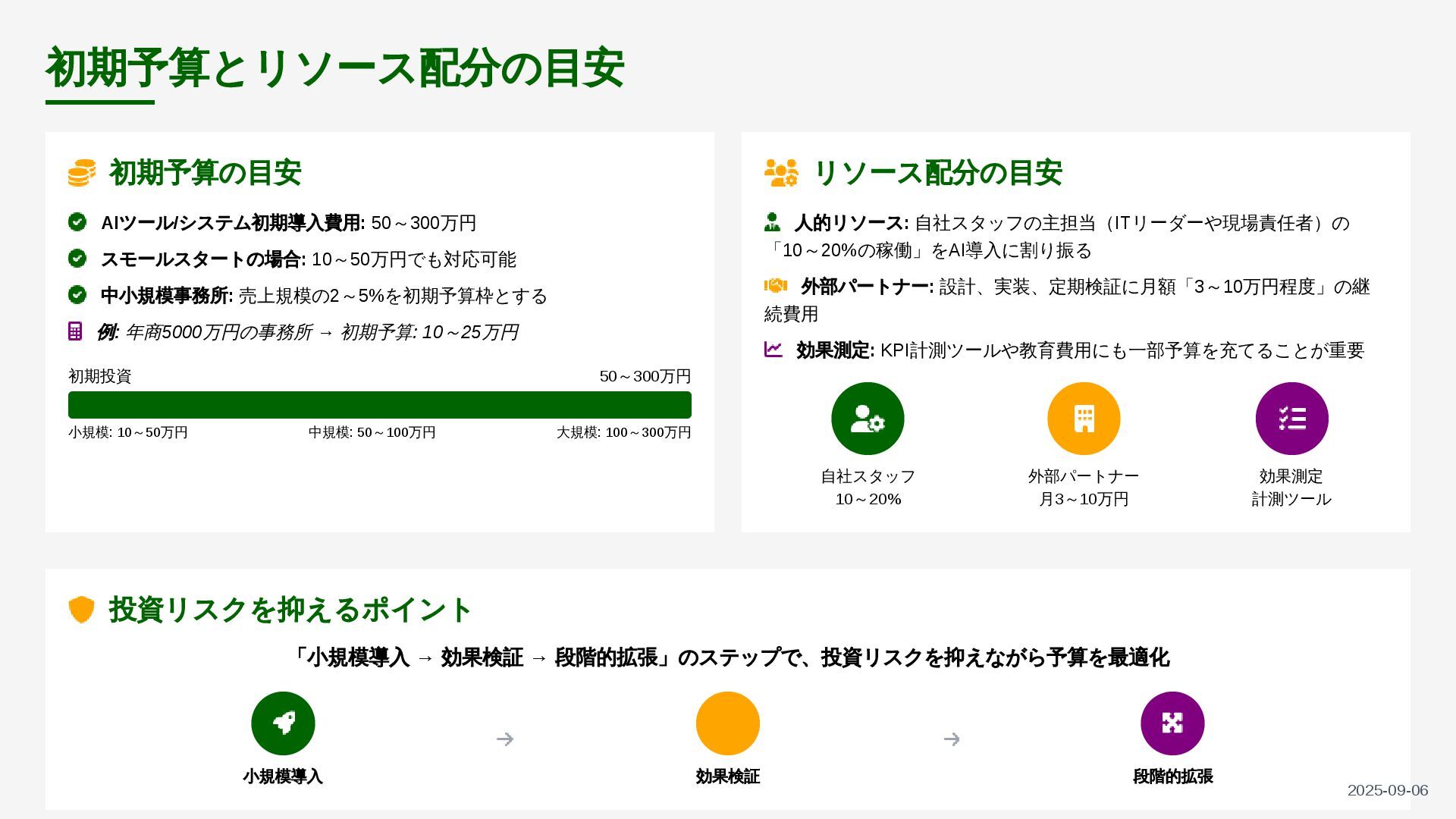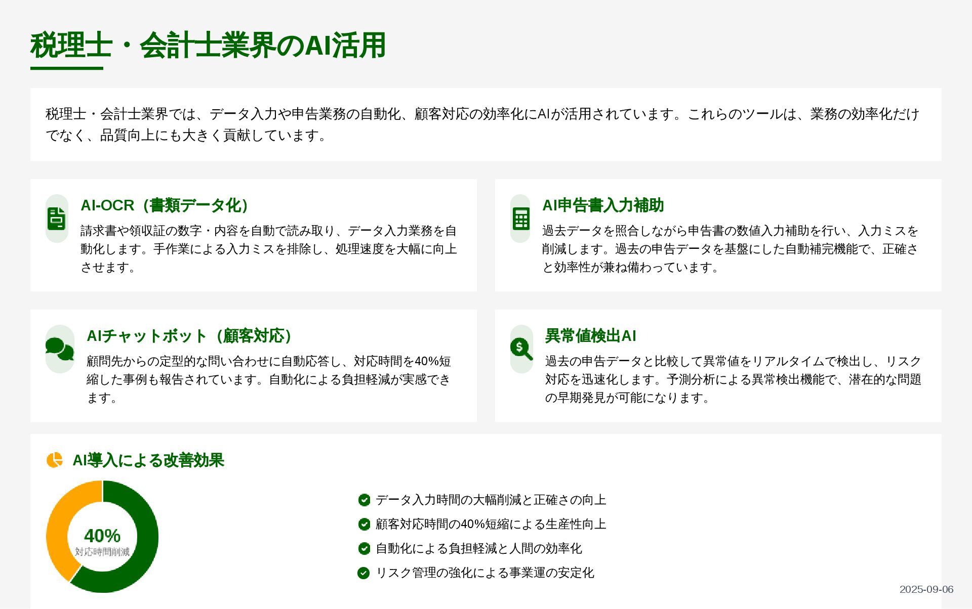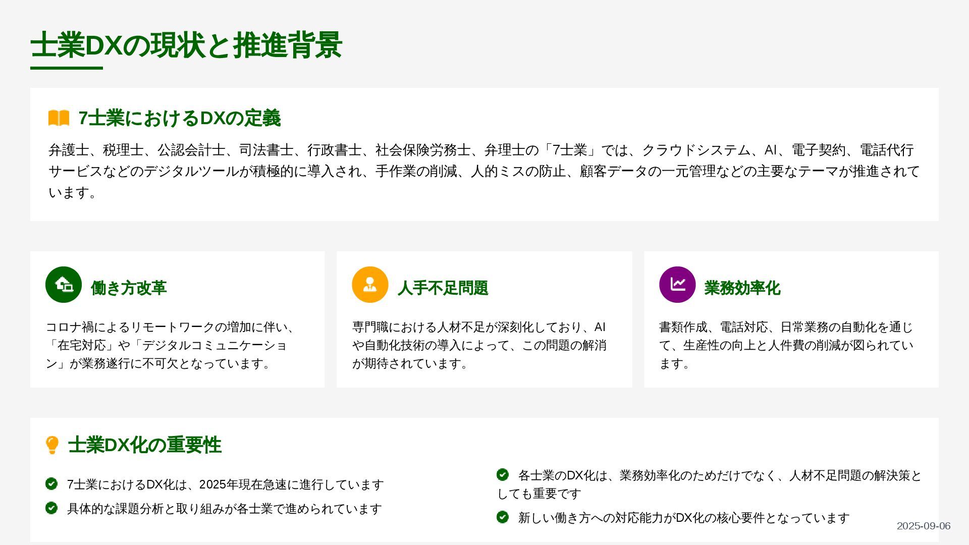 人間ならではの付加価値 AI活用によって創出された時間は、士業本来の「専門的判断力」や「ク ライアントとの対話力」を強化するために活用。「寄り添った提案力」 で強固な信頼関係を構築。 AIを経営強化ツールと見なすための実践的ア ドバイス 小規模導入→効果検証→段階的拡張 スモールスタートで初期投資リスクを抑えたうえで、段階的に拡張して いく。50~300万円の初期予算で始めて、効果を検証した後には段階的 に増加。 人材評価と合意形成 社内インフラ、IT人材、AI活用経験を事前に評価し、不足があれば外部 パートナーを活用。経営層から現場担当者まで全ての関係者がAI導入の 目的とメリットを理解。 KPI設定と効果測定 AI導入後の「どの指標がどのように改善するか」を数値で定義し、期待 される効果と成果基準を明確に。自社スタッフの10~20%稼働をAI導入 業務に割り振る。 結論 士業DXは「専門業務の自動化・効率化」と「人材不足対策」「新しい働き方対応」が中心テーマとなり、多様なデジタルツールの導入や業務プロセス改革 が現場で進められています。将来的には「AIによる士業の代替」という懸念も生み出しており、社会全体への知識普及という士業の役割との間でバランスを 模索する状況が続くでしょう。士業は、AIを脅威ではなく、経営を強化しサービス品質を高める有効なツールとして活用し、変化に柔軟に対応していくこと が求められます。 2025-09-06