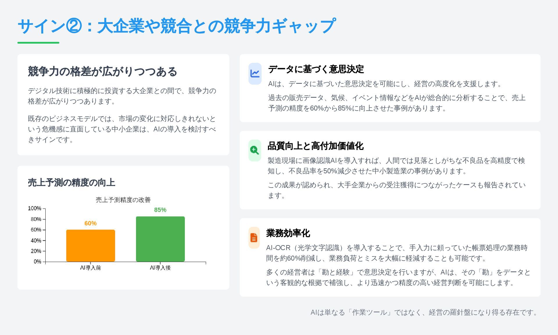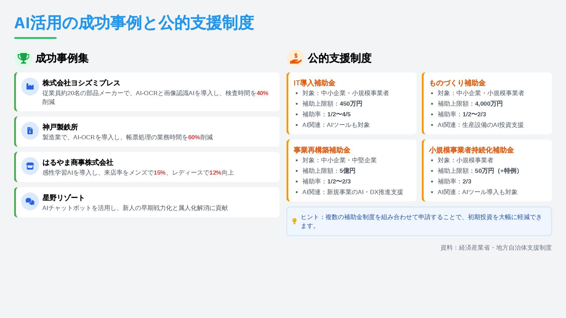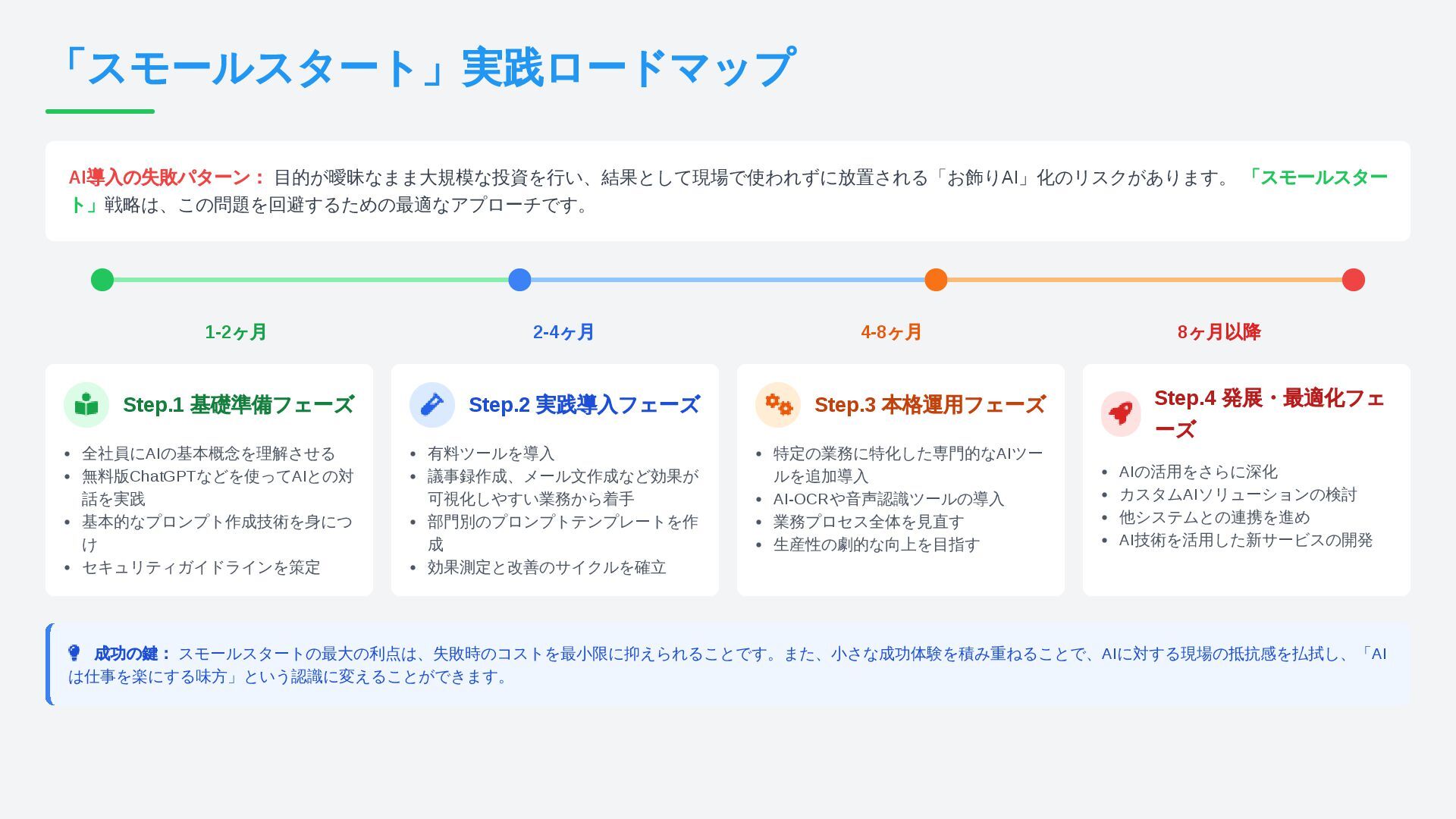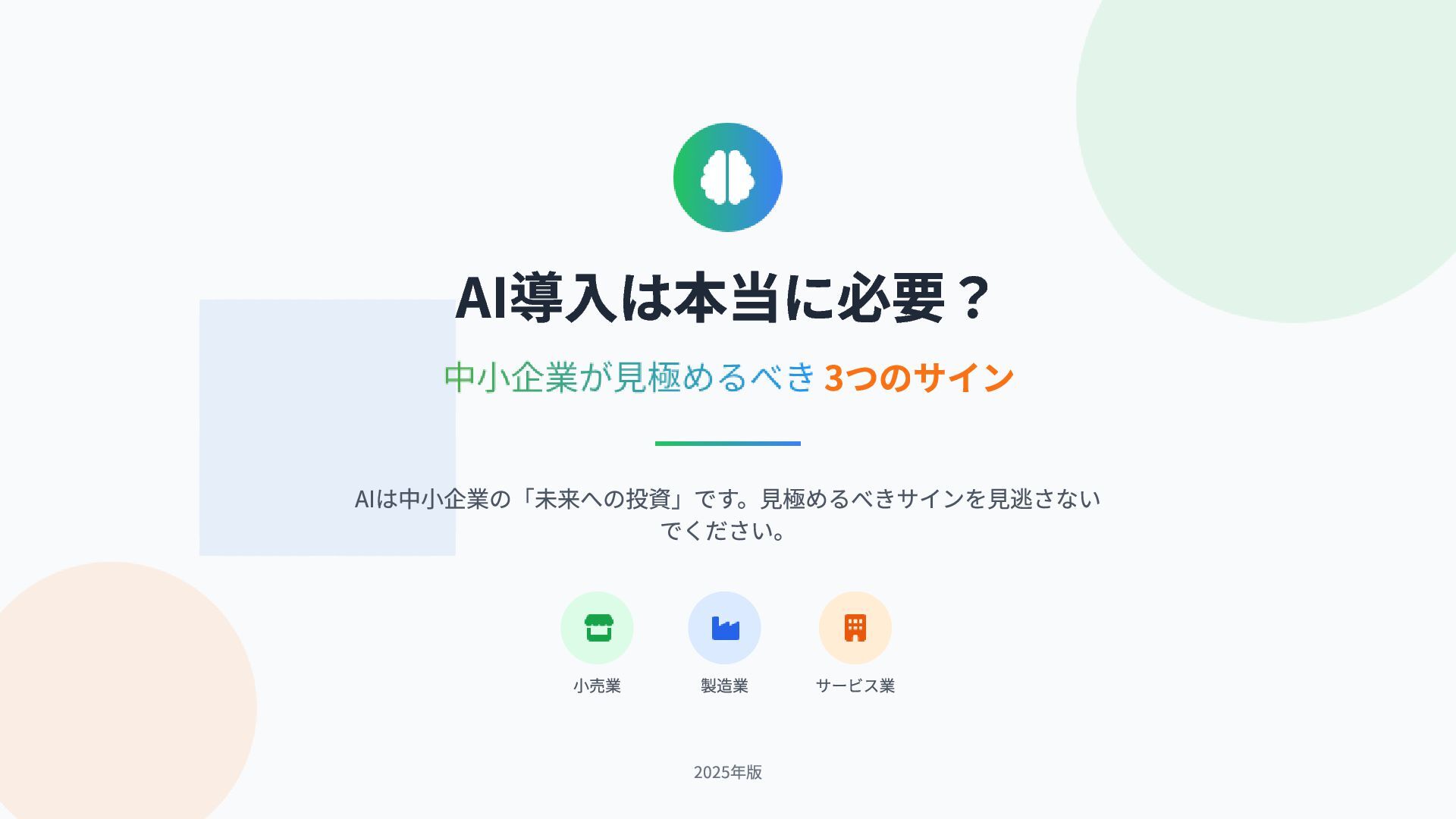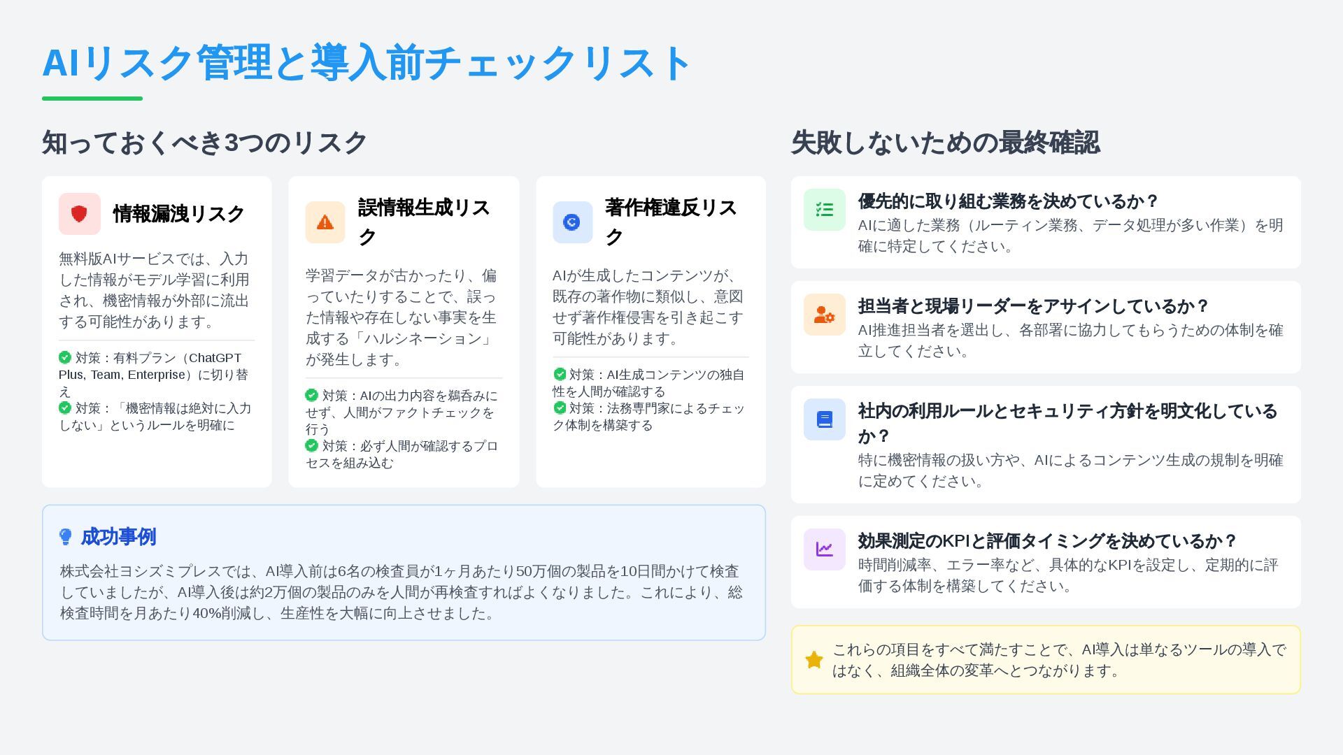 Enterprise)に切り替 え 対策:「機密情報は絶対に入力 しない」というルールを明確に 誤情報生成リス ク 学習データが古かったり、偏 っていたりすることで、誤っ た情報や存在しない事実を生 成する「ハルシネーション」 が発生します。 対策:AIの出力内容を鵜呑みに せず、人間がファクトチェックを 行う 対策:必ず人間が確認するプロ セスを組み込む 著作権違反リス ク AIが生成したコンテンツが、 既存の著作物に類似し、意図 せず著作権侵害を引き起こす 可能性があります。 対策:AI生成コンテンツの独自 性を人間が確認する 対策:法務専門家によるチェッ ク体制を構築する 成功事例 株式会社ヨシズミプレスでは、AI導入前は6名の検査員が1ヶ月あたり50万個の製品を10日間かけて検査 していましたが、AI導入後は約2万個の製品のみを人間が再検査すればよくなりました。これにより、総 検査時間を月あたり40%削減し、生産性を大幅に向上させました。 失敗しないための最終確認 優先的に取り組む業務を決めているか? AIに適した業務(ルーティン業務、データ処理が多い作業)を明 確に特定してください。 担当者と現場リーダーをアサインしているか? AI推進担当者を選出し、各部署に協力してもらうための体制を確 立してください。 社内の利用ルールとセキュリティ方針を明文化している か? 特に機密情報の扱い方や、AIによるコンテンツ生成の規制を明確 に定めてください。 効果測定のKPIと評価タイミングを決めているか? 時間削減率、エラー率など、具体的なKPIを設定し、定期的に評 価する体制を構築してください。 これらの項目をすべて満たすことで、AI導入は単なるツールの導入で はなく、組織全体の変革へとつながります。