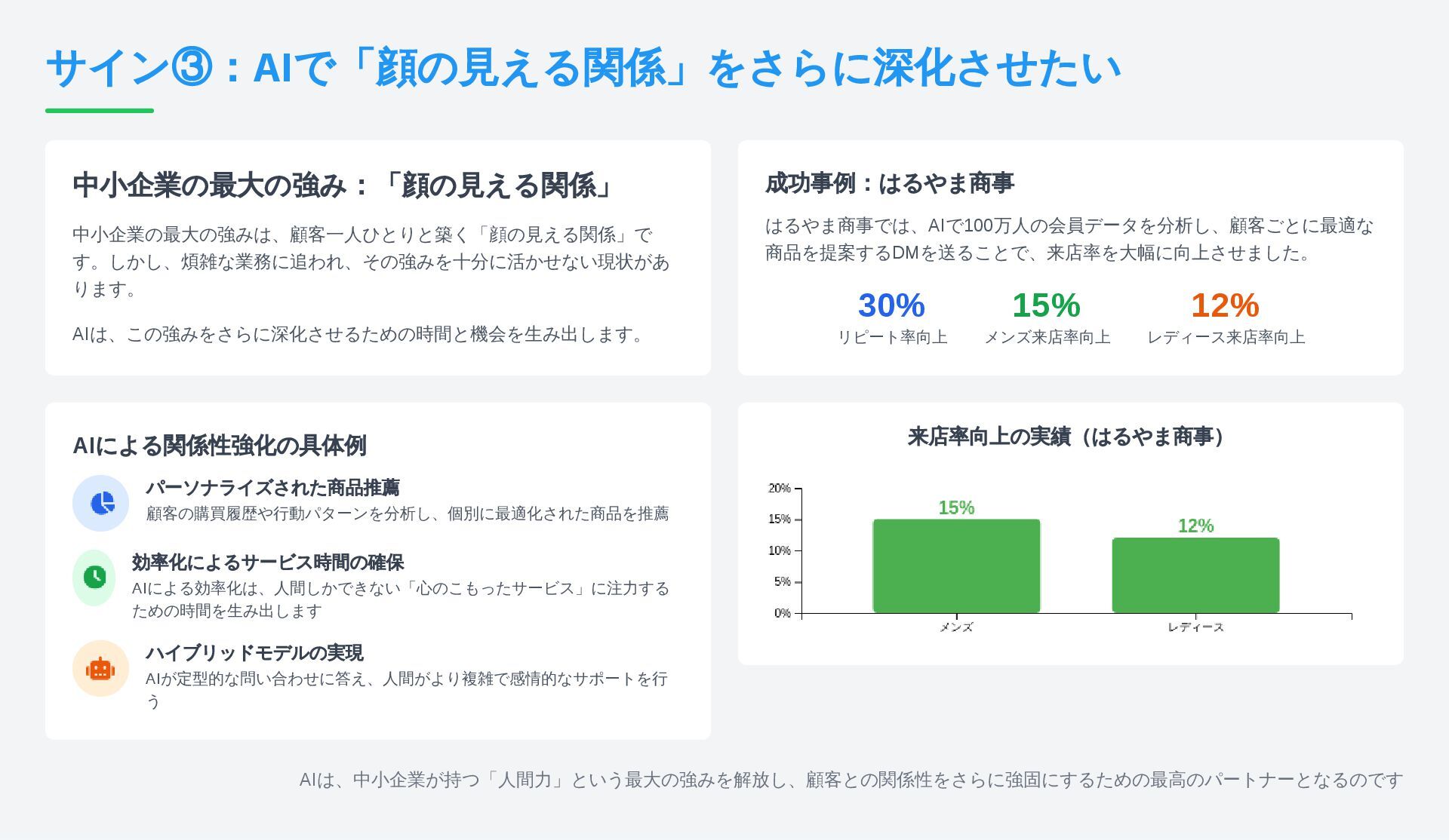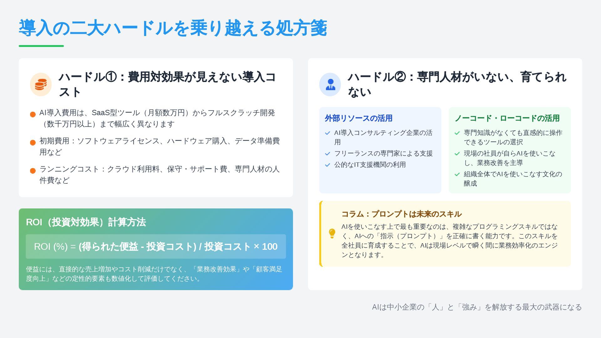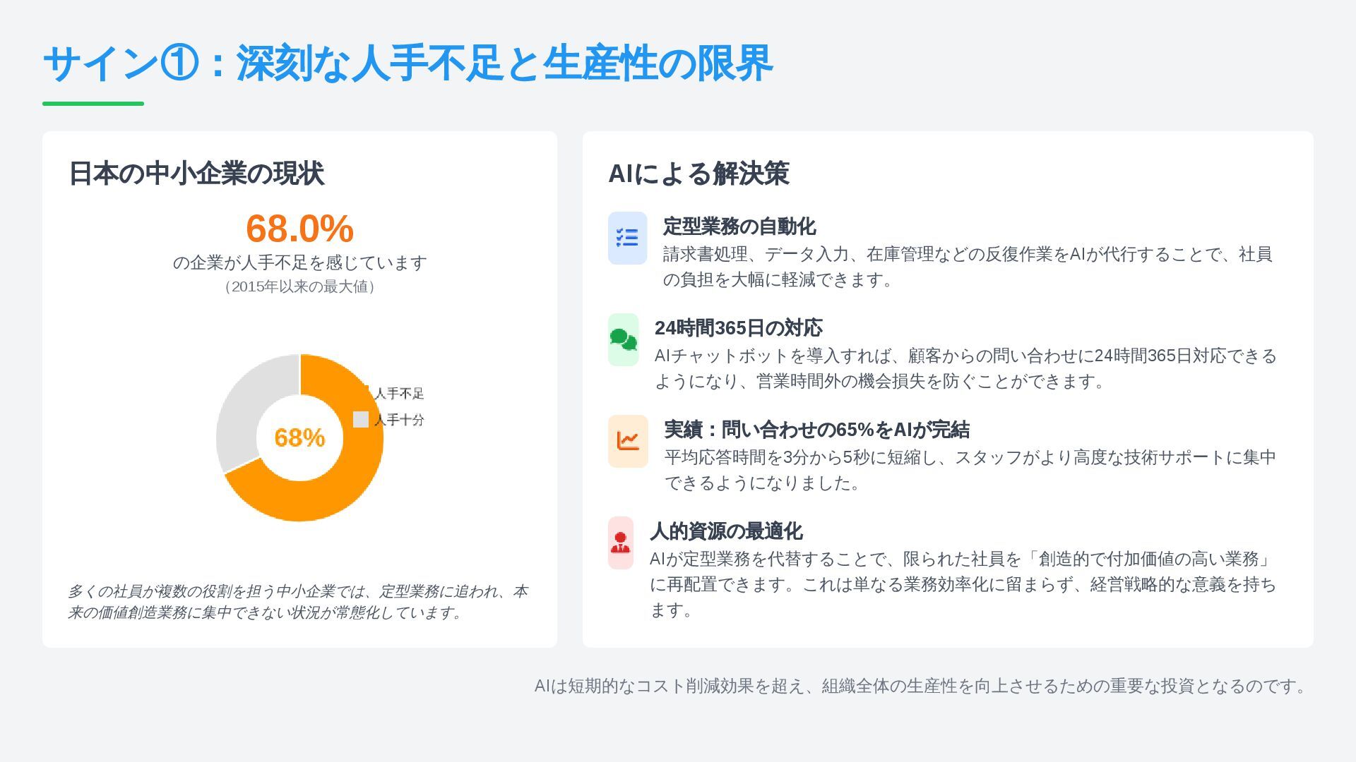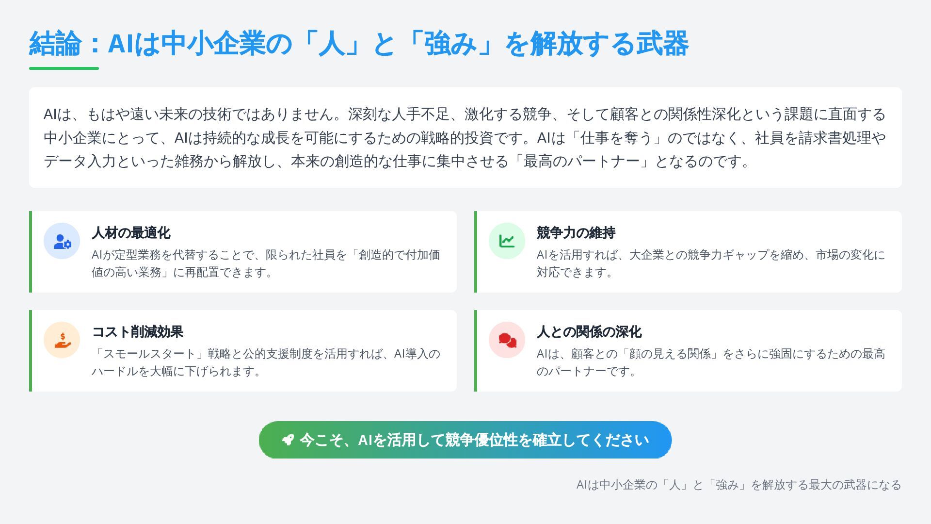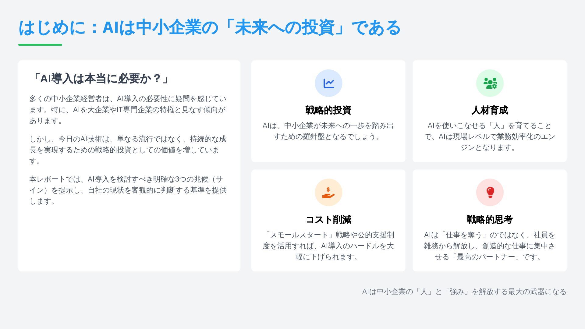 Enterprise)に切り替 え 対策:「機密情報は絶対に入力 しない」というルールを明確に 誤情報生成リス ク 学習データが古かったり、偏 っていたりすることで、誤っ た情報や存在しない事実を生 成する「ハルシネーション」 が発生します。 対策:AIの出力内容を鵜呑みに せず、人間がファクトチェックを 行う 対策:必ず人間が確認するプロ セスを組み込む 著作権違反リス ク AIが生成したコンテンツが、 既存の著作物に類似し、意図 せず著作権侵害を引き起こす 可能性があります。 対策:AI生成コンテンツの独自 性を人間が確認する 対策:法務専門家によるチェッ ク体制を構築する 成功事例 株式会社ヨシズミプレスでは、AI導入前は6名の検査員が1ヶ月あたり50万個の製品を10日間かけて検査 していましたが、AI導入後は約2万個の製品のみを人間が再検査すればよくなりました。これにより、総 検査時間を月あたり40%削減し、生産性を大幅に向上させました。 失敗しないための最終確認 優先的に取り組む業務を決めているか? AIに適した業務(ルーティン業務、データ処理が多い作業)を明 確に特定してください。 担当者と現場リーダーをアサインしているか? AI推進担当者を選出し、各部署に協力してもらうための体制を確 立してください。 社内の利用ルールとセキュリティ方針を明文化している か? 特に機密情報の扱い方や、AIによるコンテンツ生成の規制を明確 に定めてください。 効果測定のKPIと評価タイミングを決めているか? 時間削減率、エラー率など、具体的なKPIを設定し、定期的に評 価する体制を構築してください。 これらの項目をすべて満たすことで、AI導入は単なるツールの導入で はなく、組織全体の変革へとつながります。