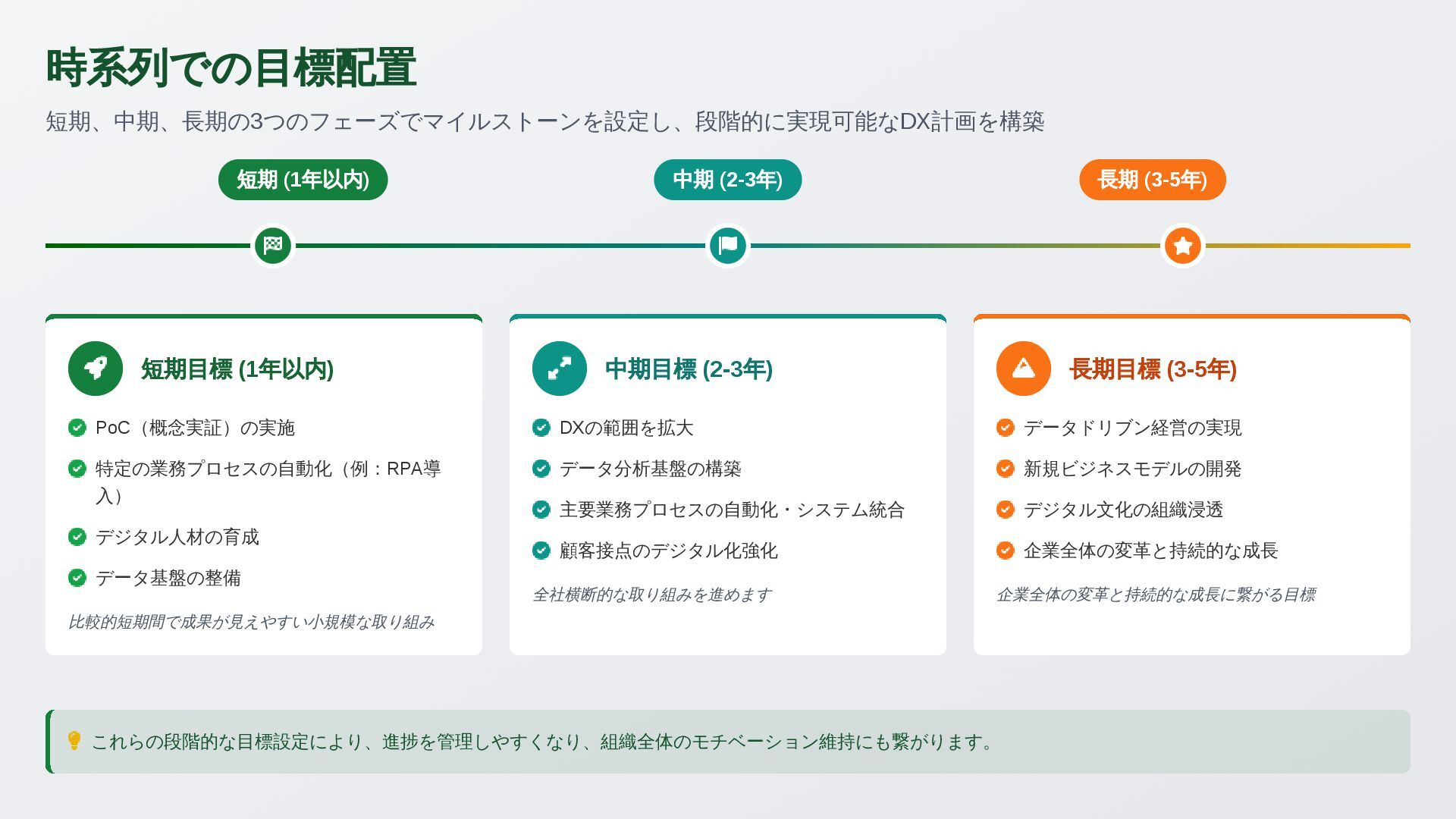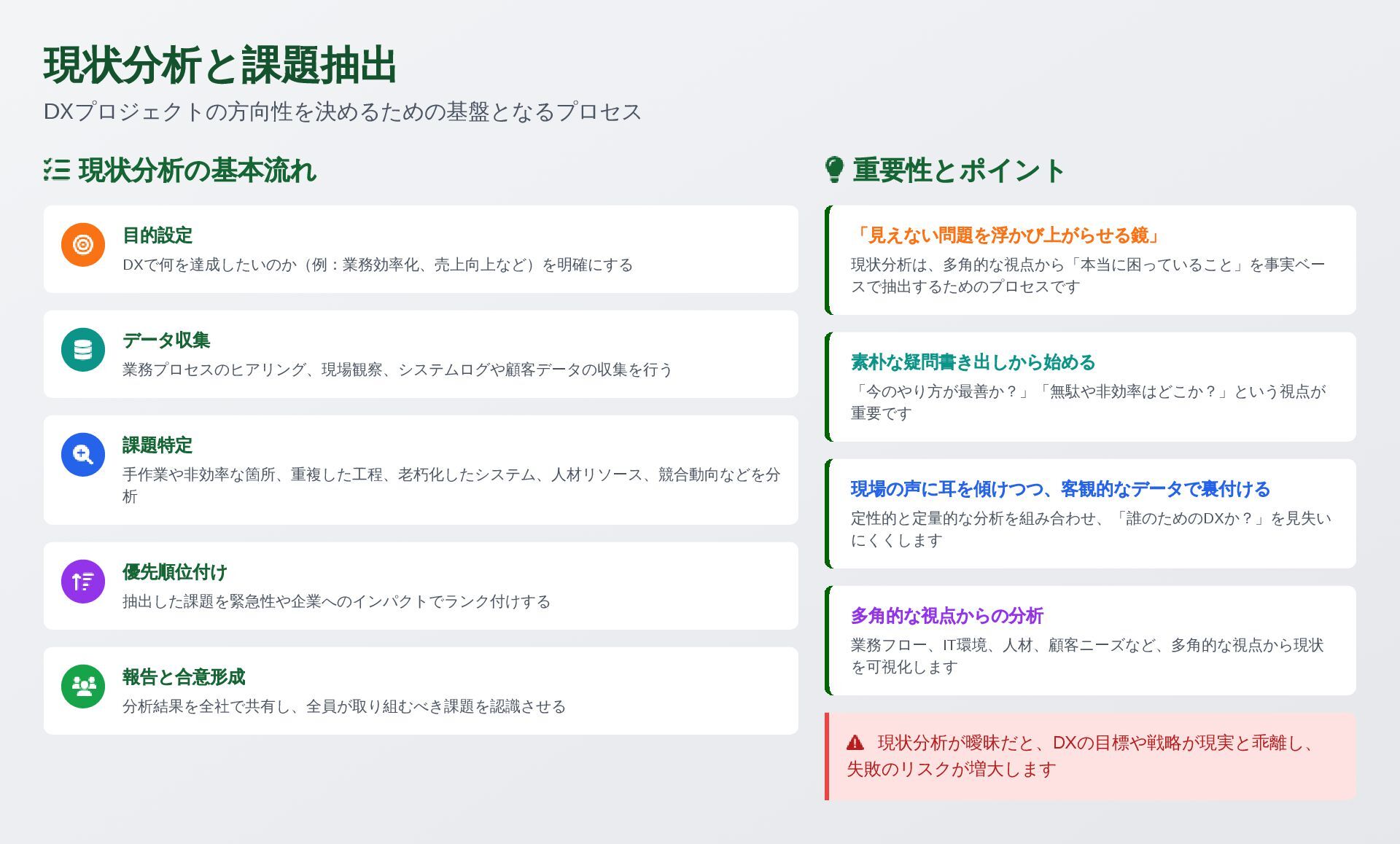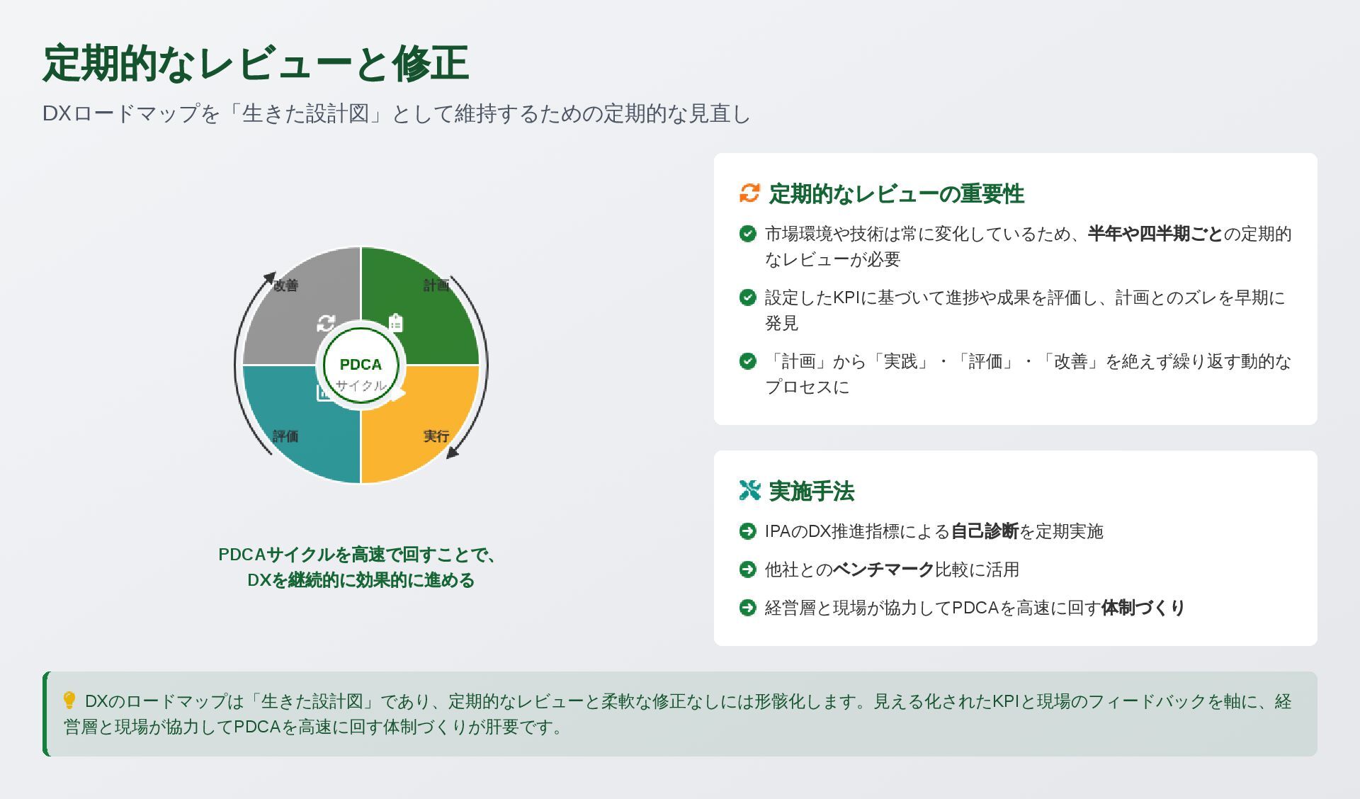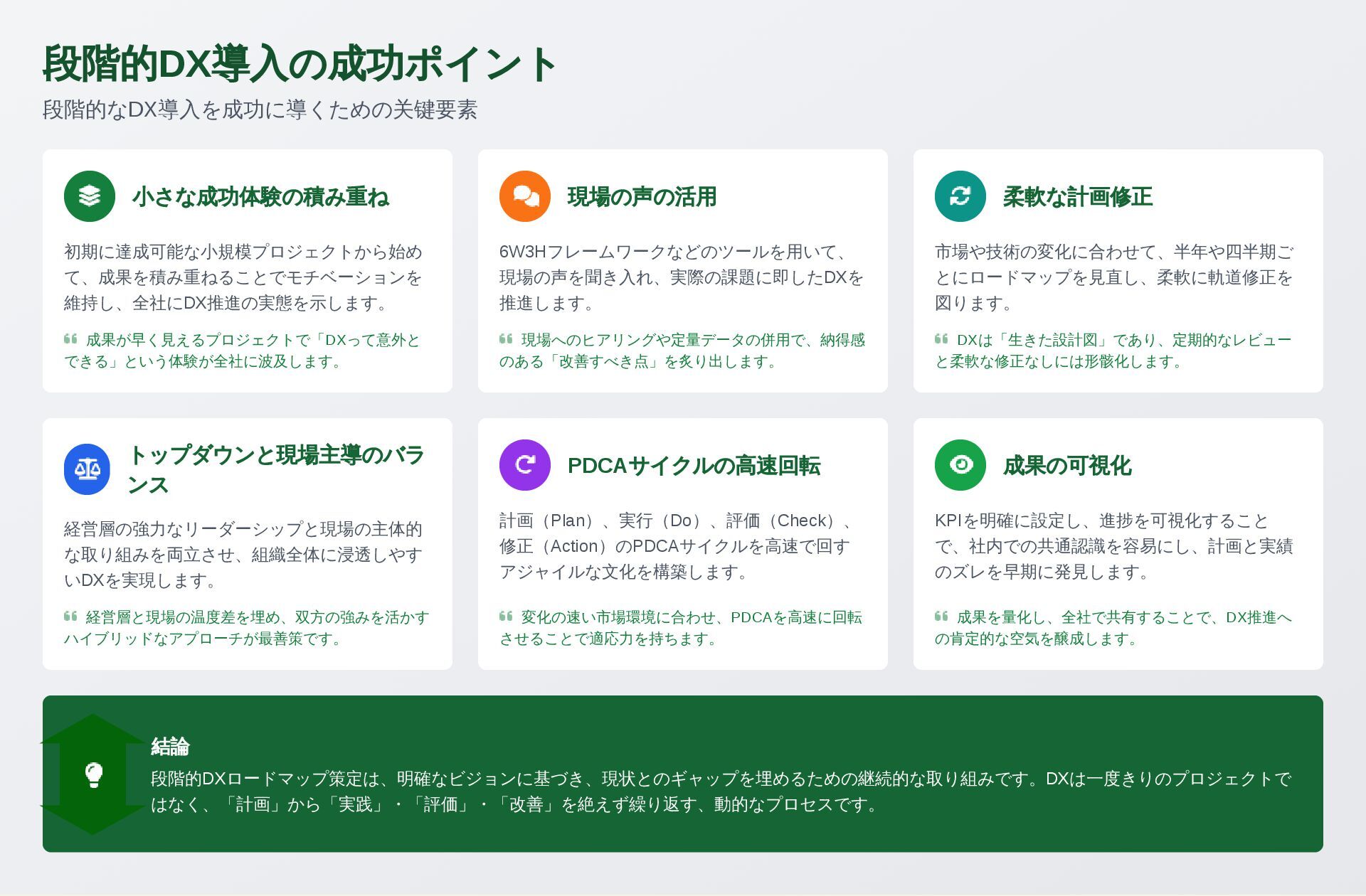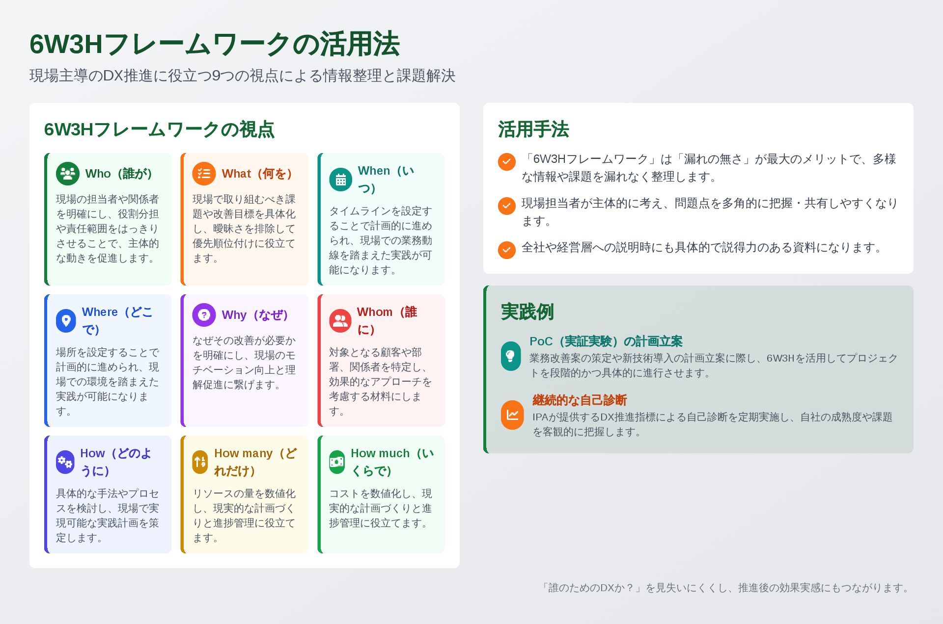現場で取り組むべき課 題や改善目標を具体化 し、曖昧さを排除して 優先順位付けに役立て ます。 When(い つ) タイムラインを設定す ることで計画的に進め られ、現場での業務動 線を踏まえた実践が可 能になります。 Where(どこ で) 場所を設定することで 計画的に進められ、現 場での環境を踏まえた 実践が可能になりま す。 Why(なぜ) なぜその改善が必要か を明確にし、現場のモ チベーション向上と理 解促進に繋げます。 Whom(誰 に) 対象となる顧客や部 署、関係者を特定し、 効果的なアプローチを 考慮する材料にしま す。 How(どのよ うに) 具体的な手法やプロセ スを検討し、現場で実 現可能な実践計画を策 定します。 How many(ど れだけ) リソースの量を数値化 し、現実的な計画づく りと進捗管理に役立て ます。 How much(い くらで) コストを数値化し、現 実的な計画づくりと進 捗管理に役立てます。 活用手法 「6W3Hフレームワーク」は「漏れの無さ」が最大のメリットで、多様 な情報や課題を漏れなく整理します。 現場担当者が主体的に考え、問題点を多角的に把握・共有しやすくなり ます。 全社や経営層への説明時にも具体的で説得力のある資料になります。 実践例 PoC(実証実験)の計画立案 業務改善案の策定や新技術導入の計画立案に際し、6W3Hを活用してプロジェク トを段階的かつ具体的に進行させます。 継続的な自己診断 IPAが提供するDX推進指標による自己診断を定期実施し、自社の成熟度や課題 を客観的に把握します。 「誰のためのDXか?」を見失いにくくし、推進後の効果実感にもつながります。