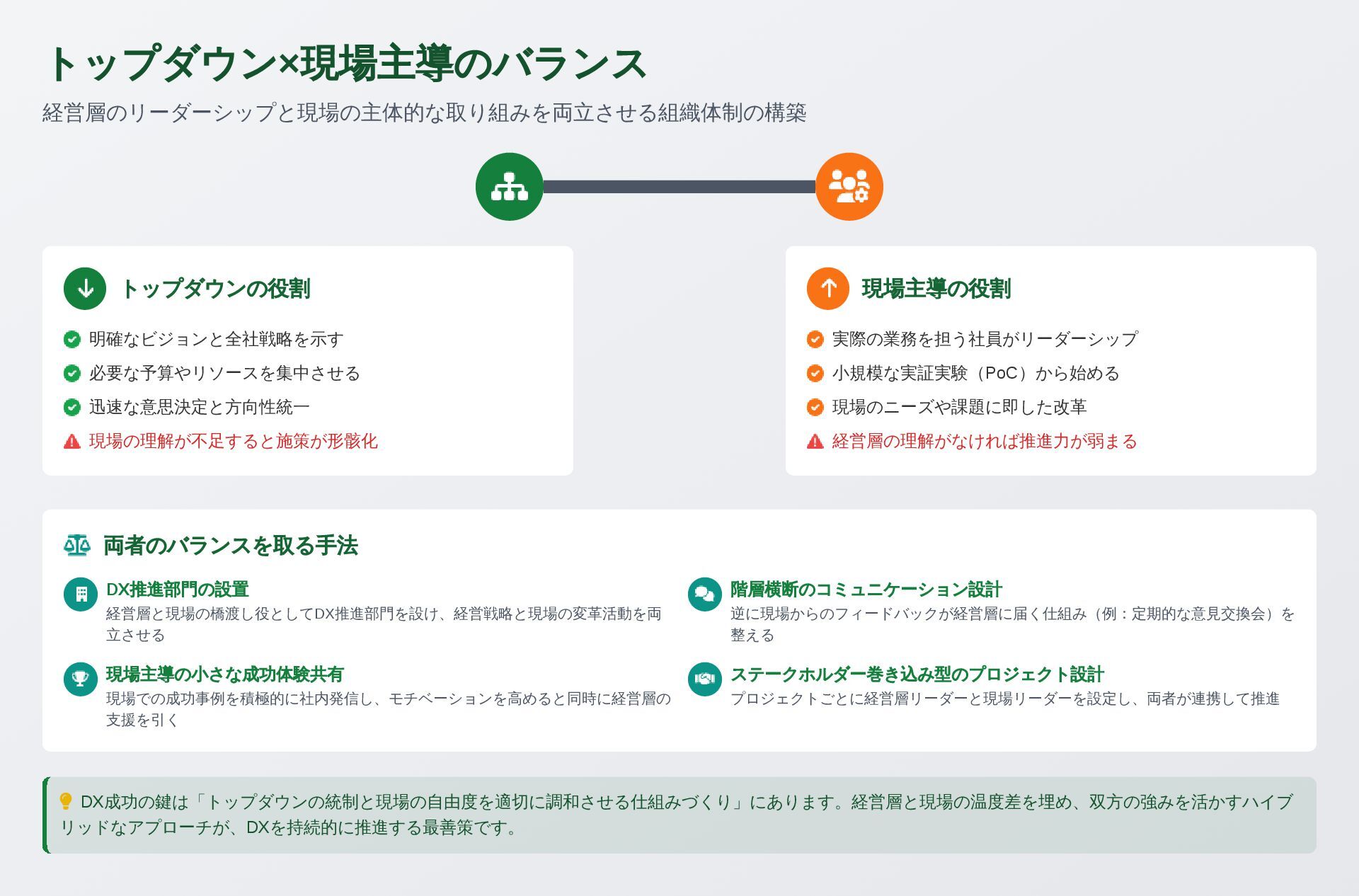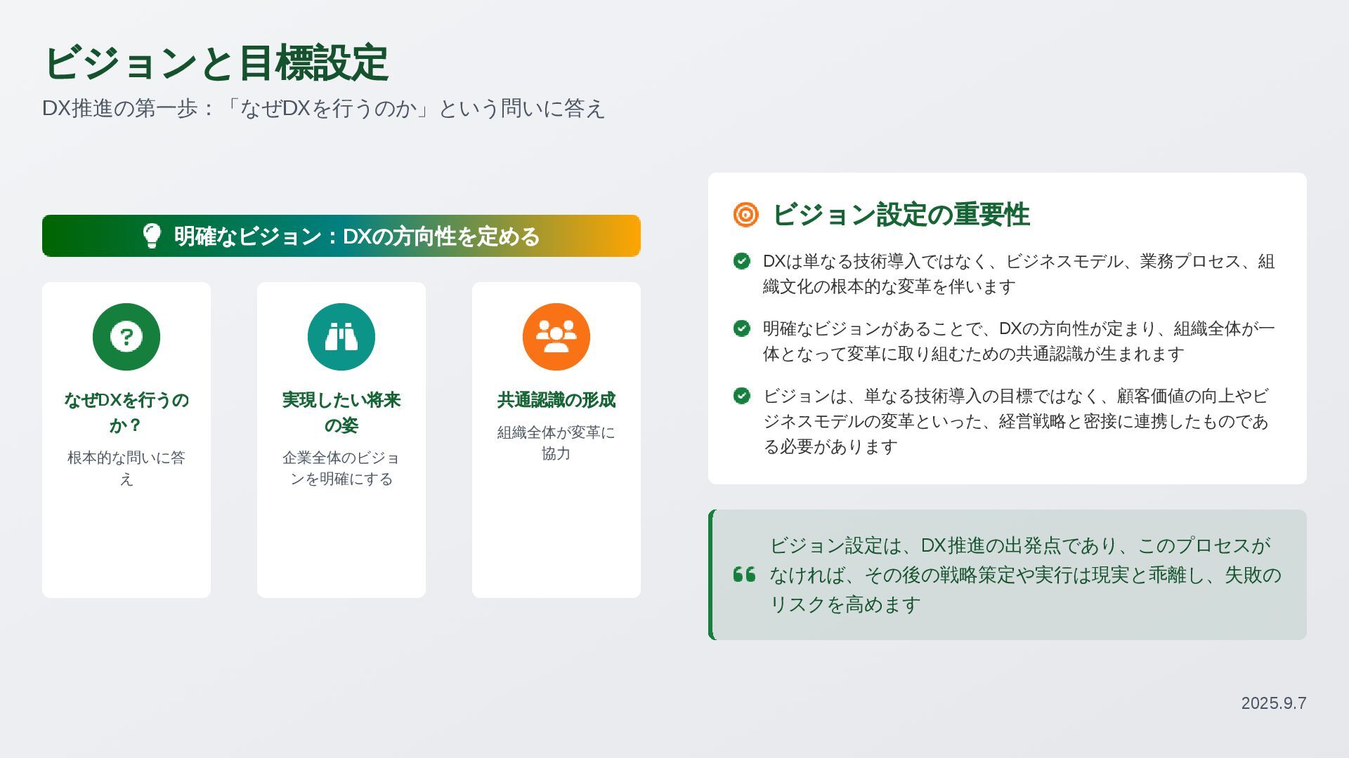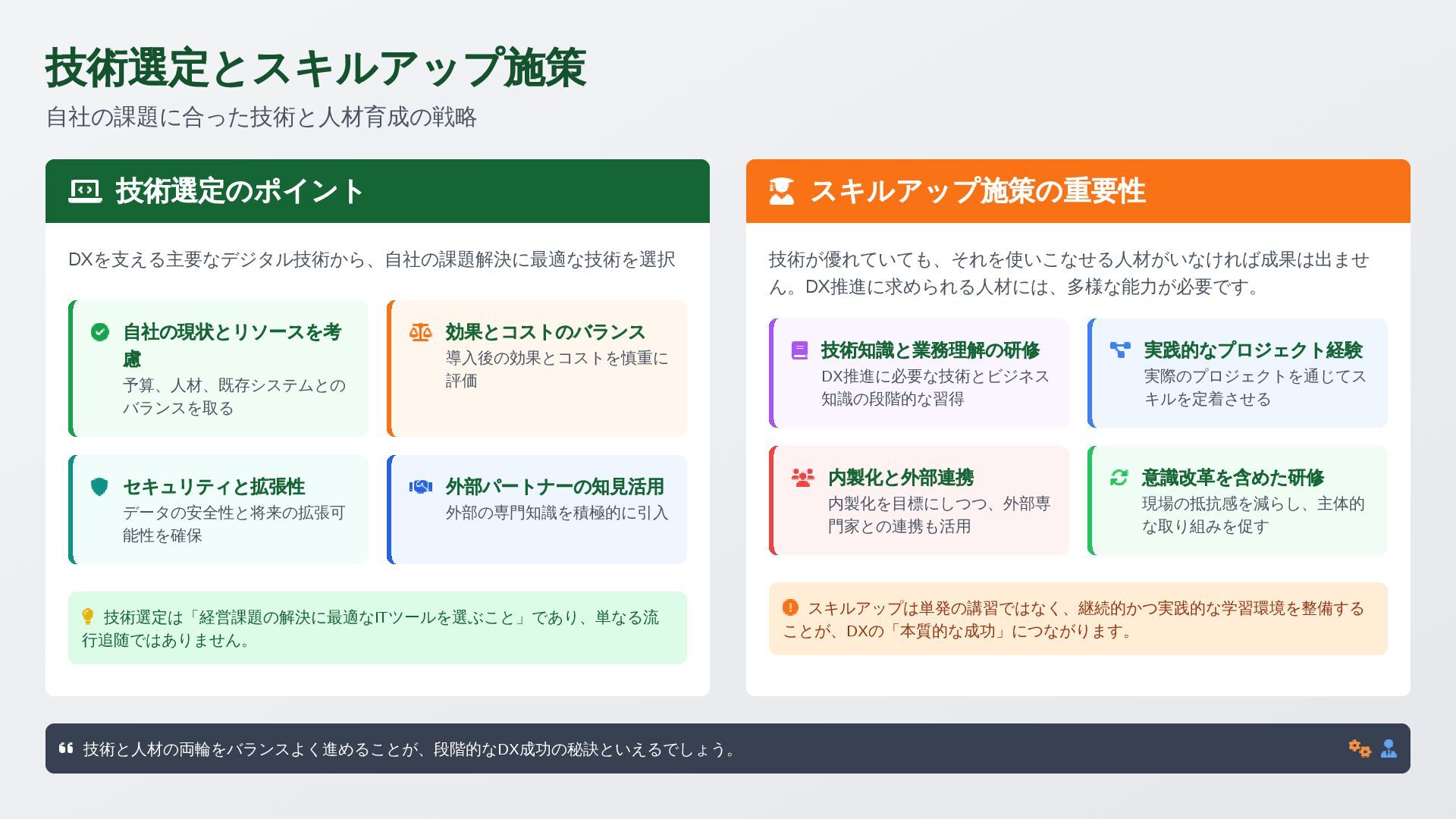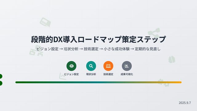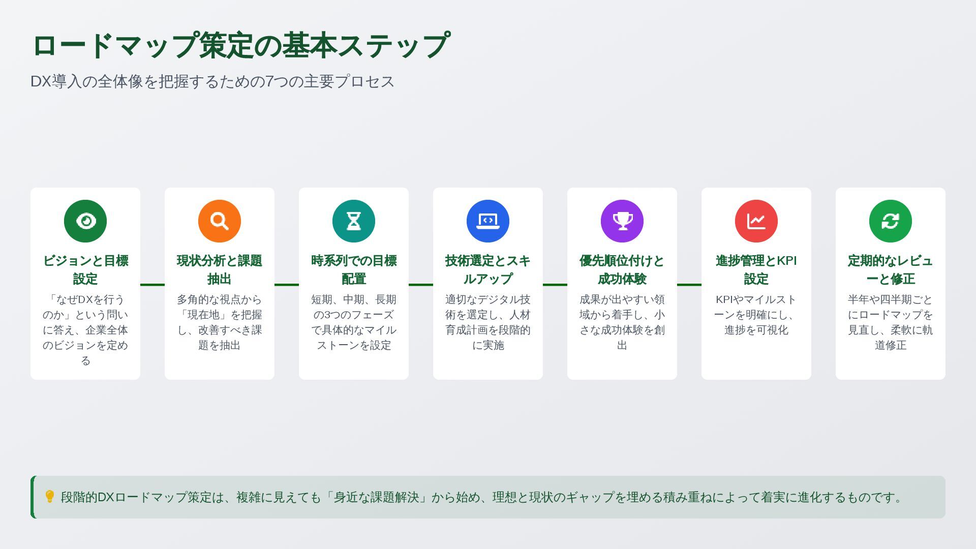 現場で取り組むべき課 題や改善目標を具体化 し、曖昧さを排除して 優先順位付けに役立て ます。 When(い つ) タイムラインを設定す ることで計画的に進め られ、現場での業務動 線を踏まえた実践が可 能になります。 Where(どこ で) 場所を設定することで 計画的に進められ、現 場での環境を踏まえた 実践が可能になりま す。 Why(なぜ) なぜその改善が必要か を明確にし、現場のモ チベーション向上と理 解促進に繋げます。 Whom(誰 に) 対象となる顧客や部 署、関係者を特定し、 効果的なアプローチを 考慮する材料にしま す。 How(どのよ うに) 具体的な手法やプロセ スを検討し、現場で実 現可能な実践計画を策 定します。 How many(ど れだけ) リソースの量を数値化 し、現実的な計画づく りと進捗管理に役立て ます。 How much(い くらで) コストを数値化し、現 実的な計画づくりと進 捗管理に役立てます。 活用手法 「6W3Hフレームワーク」は「漏れの無さ」が最大のメリットで、多様 な情報や課題を漏れなく整理します。 現場担当者が主体的に考え、問題点を多角的に把握・共有しやすくなり ます。 全社や経営層への説明時にも具体的で説得力のある資料になります。 実践例 PoC(実証実験)の計画立案 業務改善案の策定や新技術導入の計画立案に際し、6W3Hを活用してプロジェク トを段階的かつ具体的に進行させます。 継続的な自己診断 IPAが提供するDX推進指標による自己診断を定期実施し、自社の成熟度や課題 を客観的に把握します。 「誰のためのDXか?」を見失いにくくし、推進後の効果実感にもつながります。