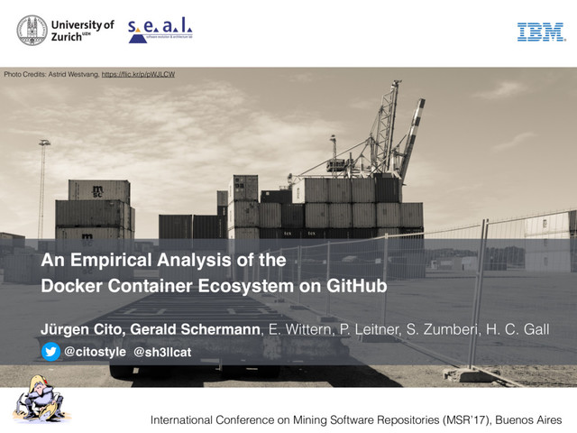 Credits: Astrid Westvang, https://flic.kr/p/pWJLCW An Empirical Analysis of the Docker Container Ecosystem on GitHub Jürgen Cito, Gerald Schermann, E. Wittern, P. Leitner, S. Zumberi, H. C. Gall @citostyle @sh3llcat