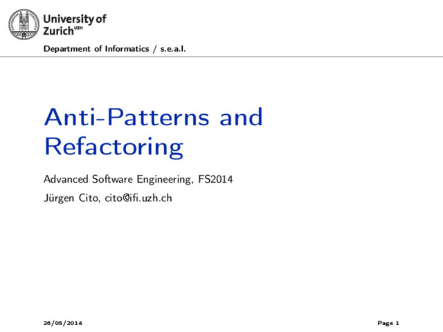 Causes – No communication and technology transfer between projects – Assumption that the system needs to be built from scratch – Pride, Not Invented Here (NIH) "Syndrome" . – Refactoring – Architecture Mining: – Valuable information on successful existing designs is buried in pre-existing designs – Extracting information in existing object-oriented architectures – Incorporation of market research and "Make-Or-Buy" decision into software engineering process 26/05/2014 Anti-Patterns and Refactoring Page 14