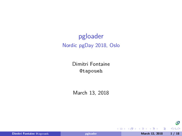 a, b, c, d) INTO postgresql:///pgloader?csv (a, b, d, c) WITH truncate, skip header = 1, fields optionally enclosed by '"', fields escaped by double-quote, fields terminated by ',' SET work_mem to '12MB', standard_conforming_strings to 'on' Dimitri Fontaine @tapoueh pgloader March 13, 2018 8 / 18