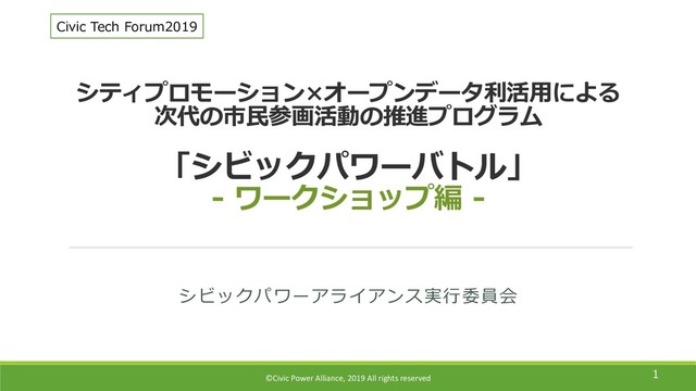 2017年9月に東京で開かれた「シビックパワーバトル」。その後も千葉市6区、大阪、オープンガバメント推進協議会、川崎市などで行われていますが、参戦するための準備であるプレゼン資料作りについて解説をします。 地域の魅力を発掘し、オープンデータで証明した上でのプロモーション。実際に良いものを作るためには繰り返しブラッシュアップをする必要がありますが、5時間程度で一通りの手順を学べるコンテンツとなっています。 このメソッドを使って各地でシビックパワーバトルを行っていただけると嬉しく思います。