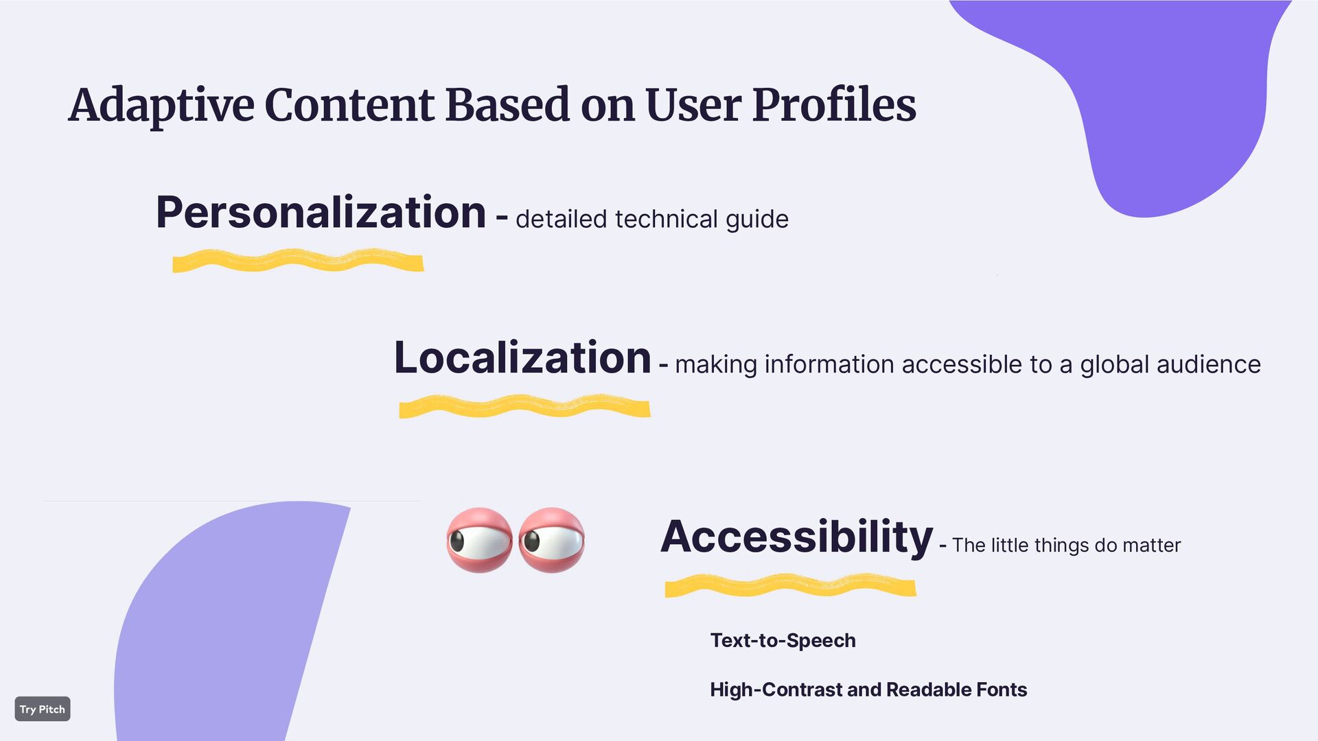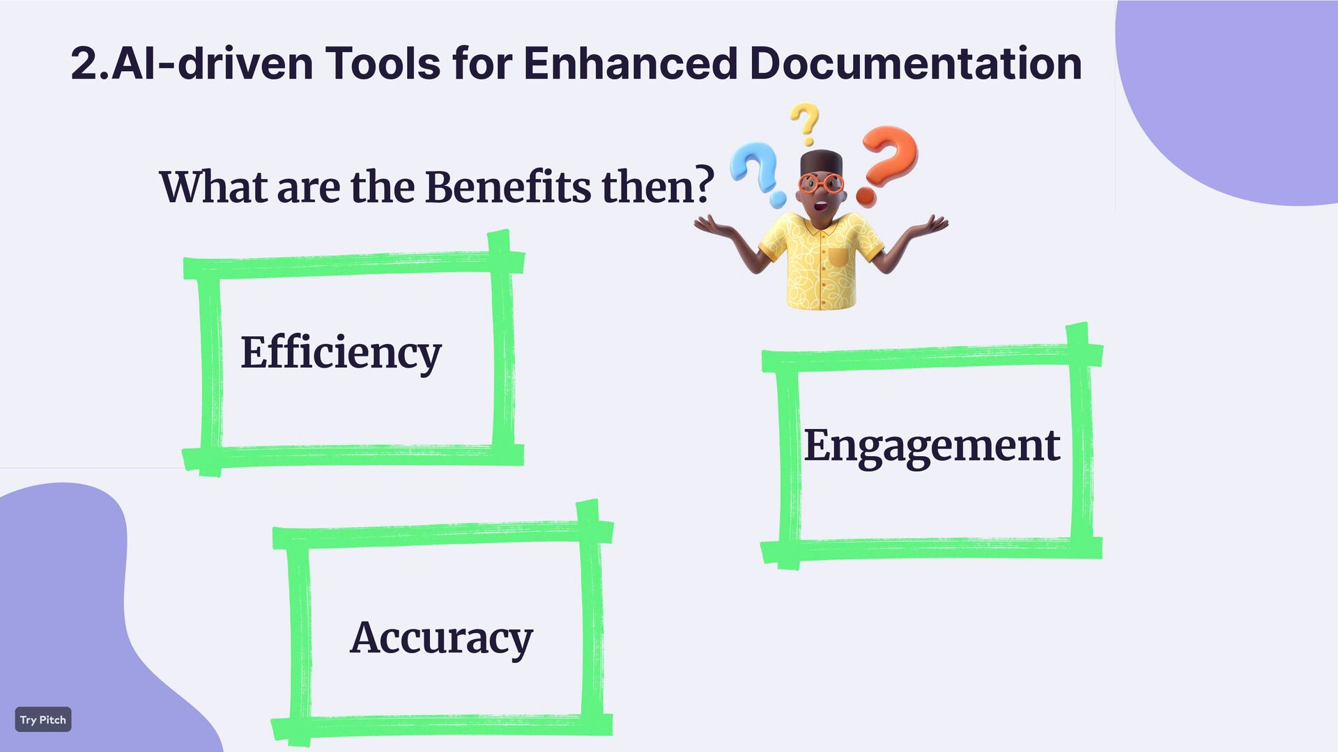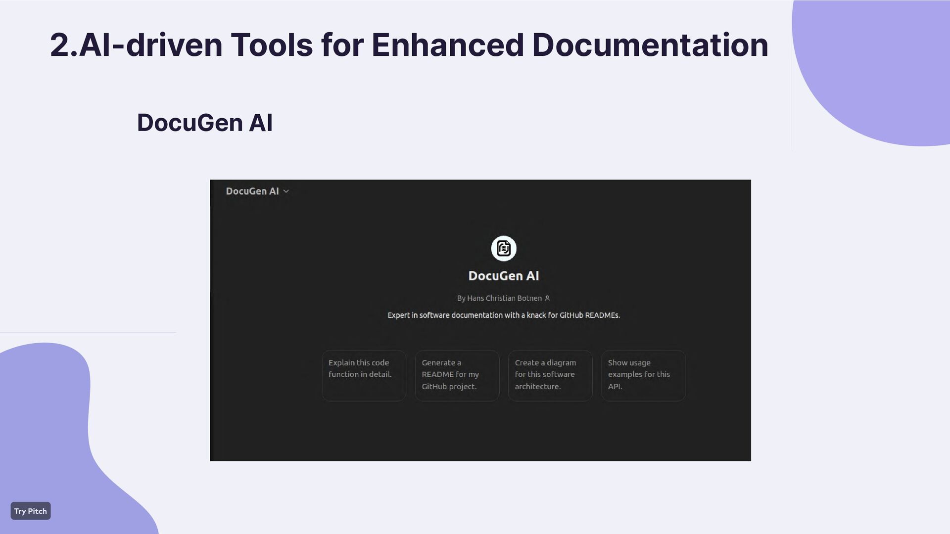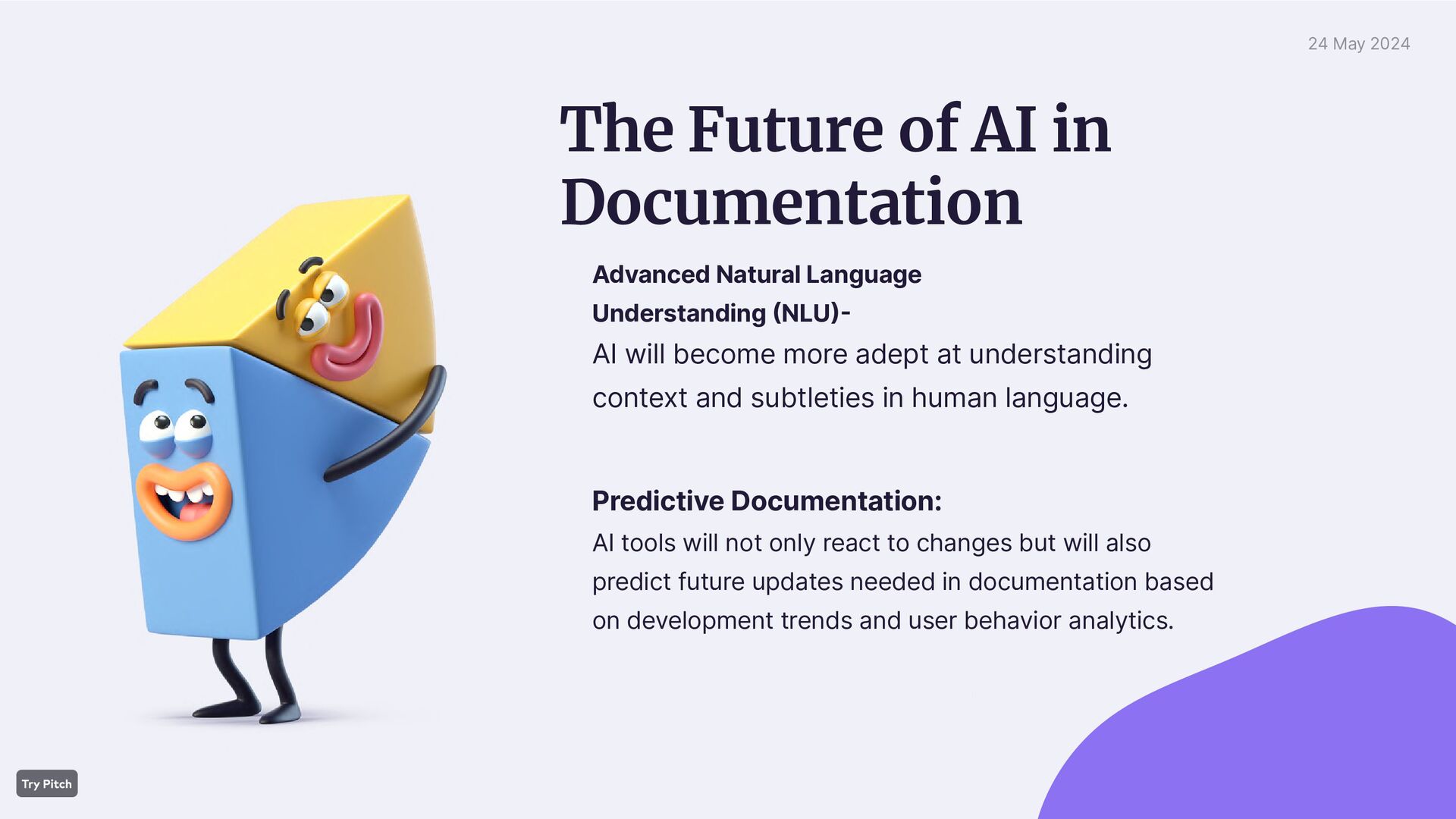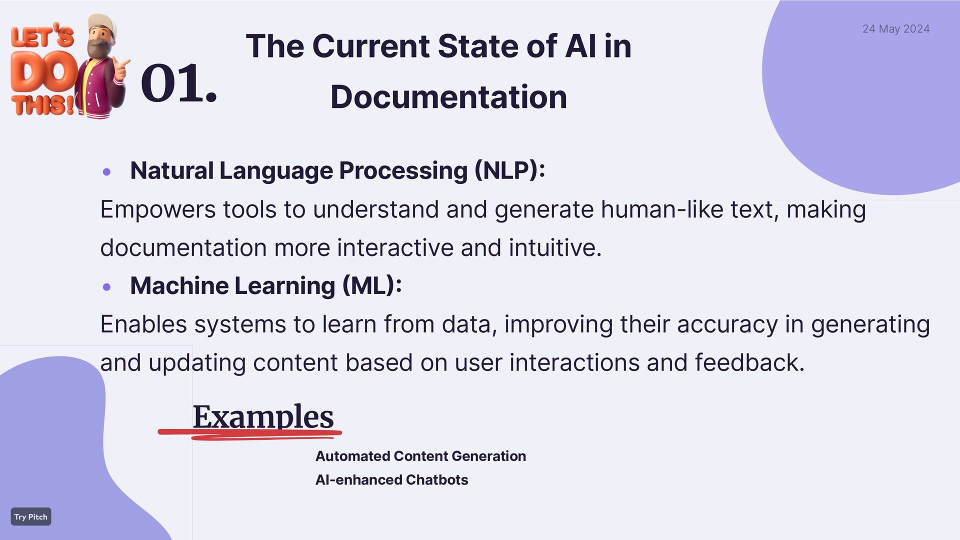 • • Natural Language Processing (NLP): Empowers tools to understand and generate human-like text, making documentation more interactive and intuitive. Machine Learning (ML): Enables systems to learn from data, improving their accuracy in generating and updating content based on user interactions and feedback. Examples Automated Content Generation AI-enhanced Chatbots 01.