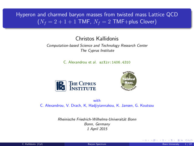 (Nf = 2 + 1 + 1 TMF, Nf = 2 TMF+plus Clover) Christos Kallidonis Computation-based Science and Technology Research Center The Cyprus Institute C. Alexandrou et al. arXiv:1406.4310 with C. Alexandrou, V. Drach, K, Hadjiyiannakou, K. Jansen, G. Koutsou Rheinische Friedrich-Wilhelms-Universit¨ at Bonn Bonn, Germany 1 April 2015 C. Kallidonis (CyI) Baryon Spectrum Bonn University 1 / 27