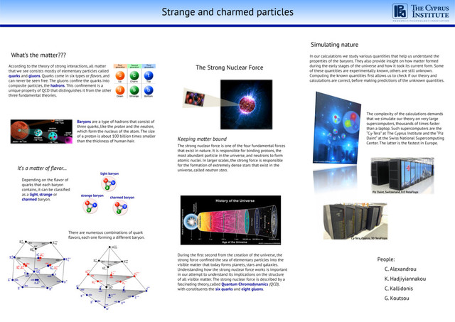 quantities that help us understand the properties of the baryons. They also provide insight on how matter formed during the early stages of the universe and how it took its current form. Some of these quantities are experimentally known, others are still unknown. Computing the known quantities first allows us to check if our theory and calculations are correct, before making predictions of the unknown quantities. Piz Daint, Switzerland, 8.0 PetaFlops Simulating nature Image courtesy of BMW Collaboration The complexity of the calculations demands that we simulate our theory on very large supercomputers, thousands of times faster than a laptop. Such supercomputers are the “Cy-Tera” at The Cyprus Institute and the “Piz Daint” at the Swiss National Supercomputing Center. The latter is the fastest in Europe. The Strong Nuclear Force The strong nuclear force is one of the four fundamental forces that exist in nature. It is responsible for binding protons, the most abundant particle in the universe, and neutrons to form atomic nuclei. In larger scales, the strong force is responsible for the formation of extremely dense stars that exist in the universe, called neutron stars. Keeping matter bound There are numerous combinations of quark flavors, each one forming a different baryon. According to the theory of strong interactions, all matter that we see consists mostly of elementary particles called quarks and gluons. Quarks come in six types or flavors, and can never be seen free. The gluons confine the quarks into composite particles, the hadrons. This confinement is a unique property of QCD that distinguishes it from the other three fundamental theories. People: C. Alexandrou K. Hadjiyiannakou C. Kallidonis G. Koutsou What’s the matter??? Depending on the flavor of quarks that each baryon contains, it can be classified as a light, strange or charmed baryon. It’s a matter of flavor… Baryons are a type of hadrons that consist of three quarks, like the proton and the neutron, which form the nucleus of the atom. The size of a proton is about 100 billion times smaller than the thickness of human hair. During the first second from the creation of the universe, the strong force confined the sea of elementary particles into the visible matter that today forms planets, stars and galaxies. Understanding how the strong nuclear force works is important in our attempt to understand its implications on the structure of all visible matter. The strong nuclear force is described by a fascinating theory, called Quantum Chromodynamics (QCD), with constituents the six quarks and eight gluons. light baryon u u d strange baryon u s d charmed baryon c d c Cy-Tera, Cyprus, 30 TeraFlops