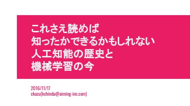 should eventually eliminate the need for much of this detailed programming effort" Samuel, A. L. (1959), “Some Studies in Machine Learning Using the Game of Checkers” • input に対して何らかの output をするような機構を持つ • 人間がアルゴリズムを変更することなく、 output を修正できること くらいに考えれば良さそう?