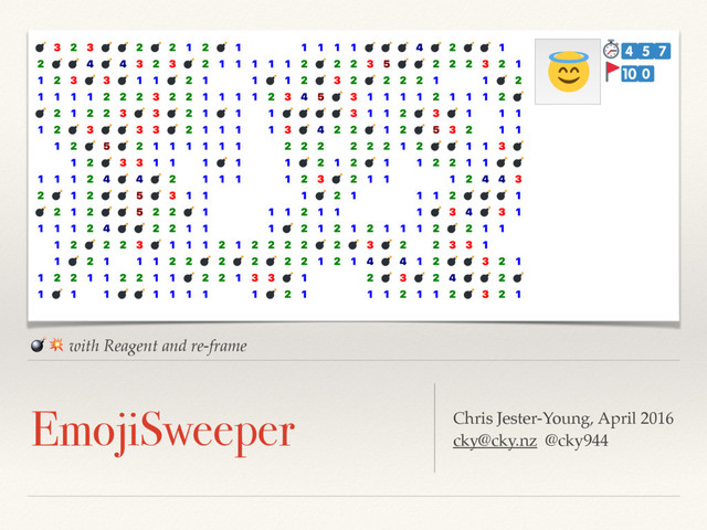 EmojiSweeper is a web-based Minesweeper that uses emoji to present a pleasant game interface. Coded in ClojureScript using Reagent and re-frame, it was designed to be the kind of game that a serious Minesweeper player would want to play.