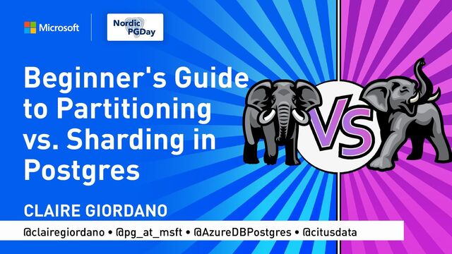 These slides are from Claire Giordano's talk at Nordic PGDay 2024 about Partitioning and Sharding in Postgres. Partitioning has come a long way in Postgres since the Postgres 10 days, as has sharding via the Citus extension. If you need to scale your Postgres, your friends may recommend you look into partitioning and/or sharding. But what’s the difference between these two approaches?