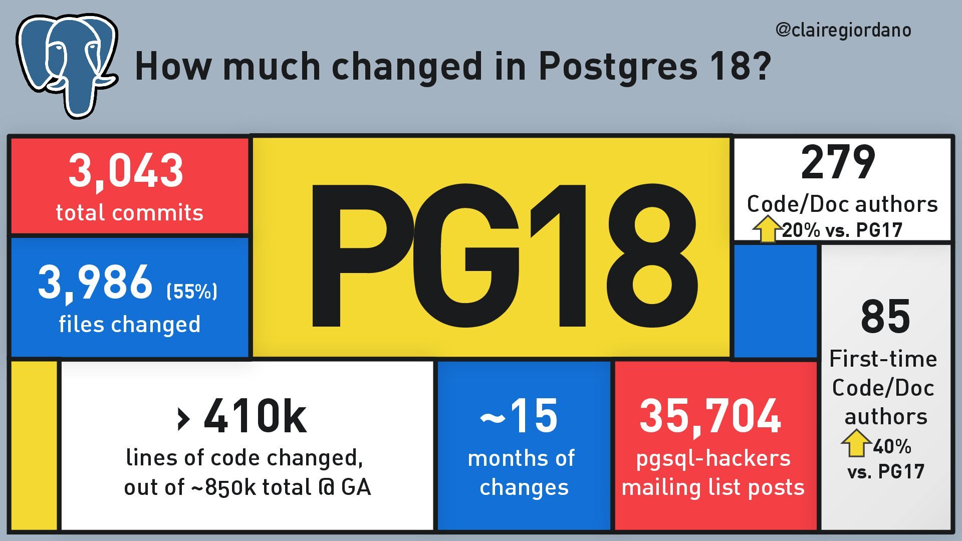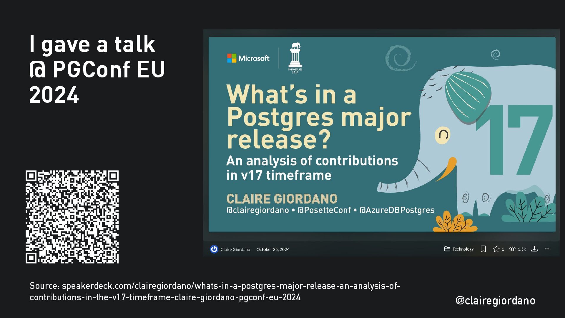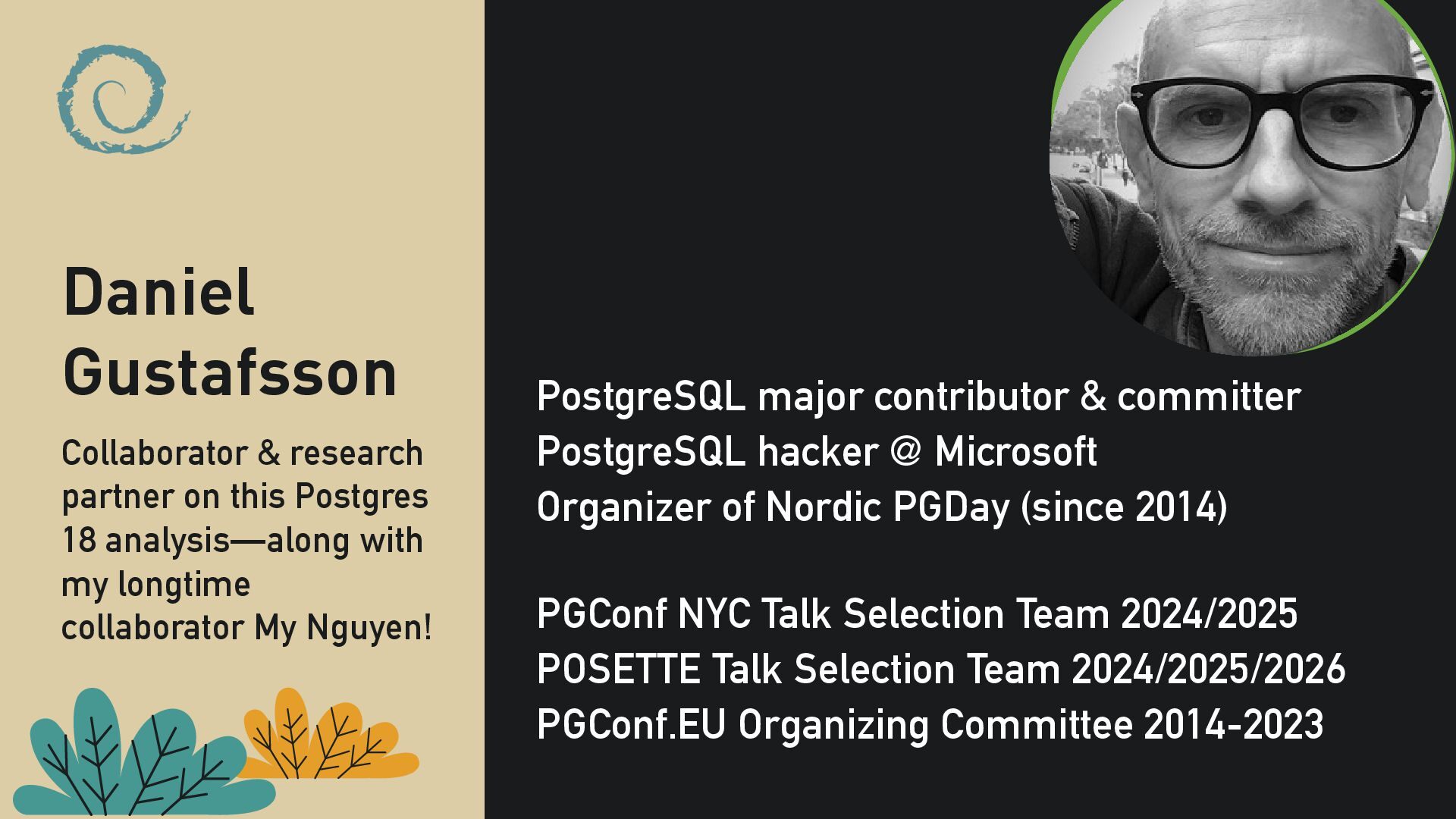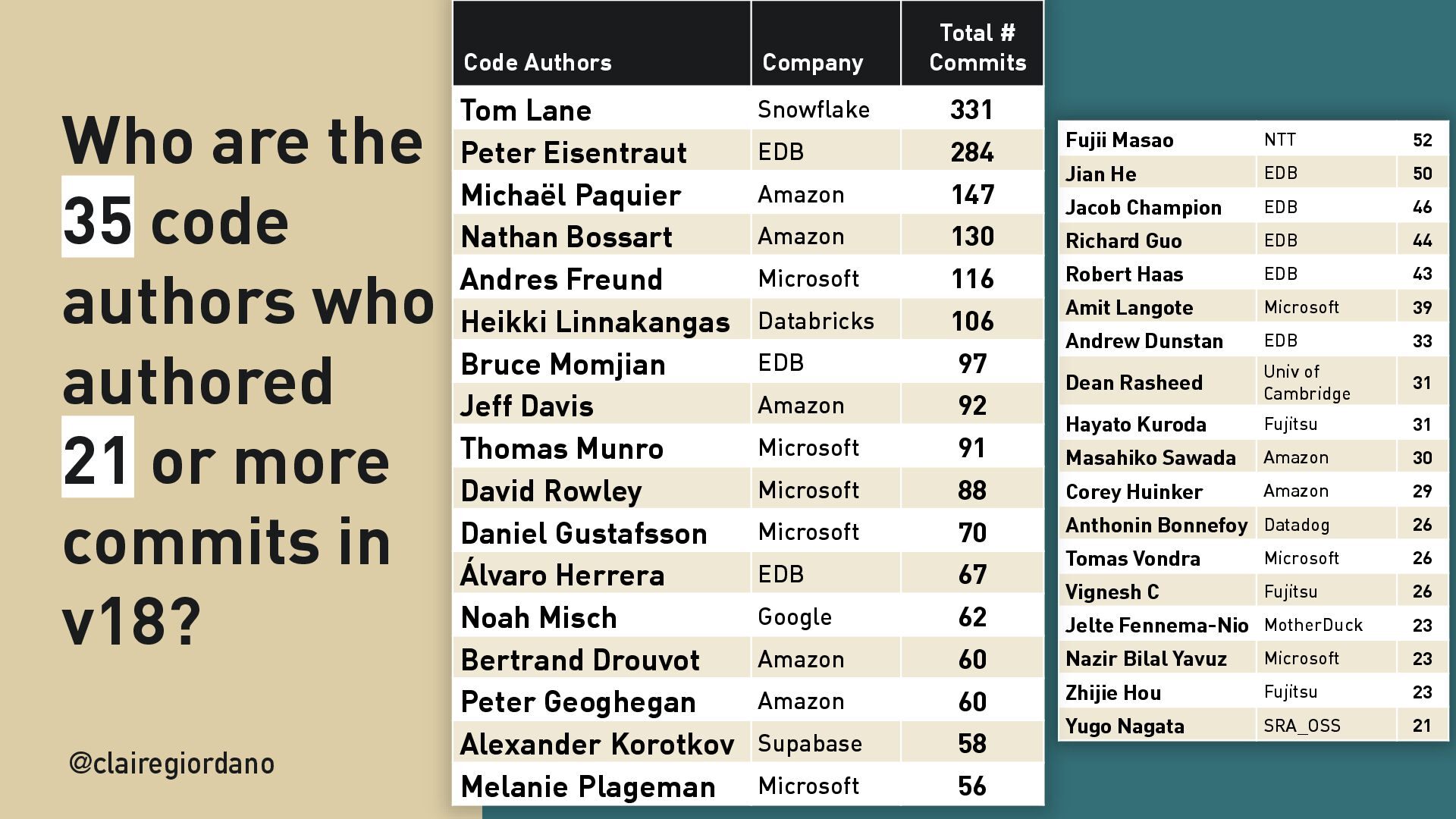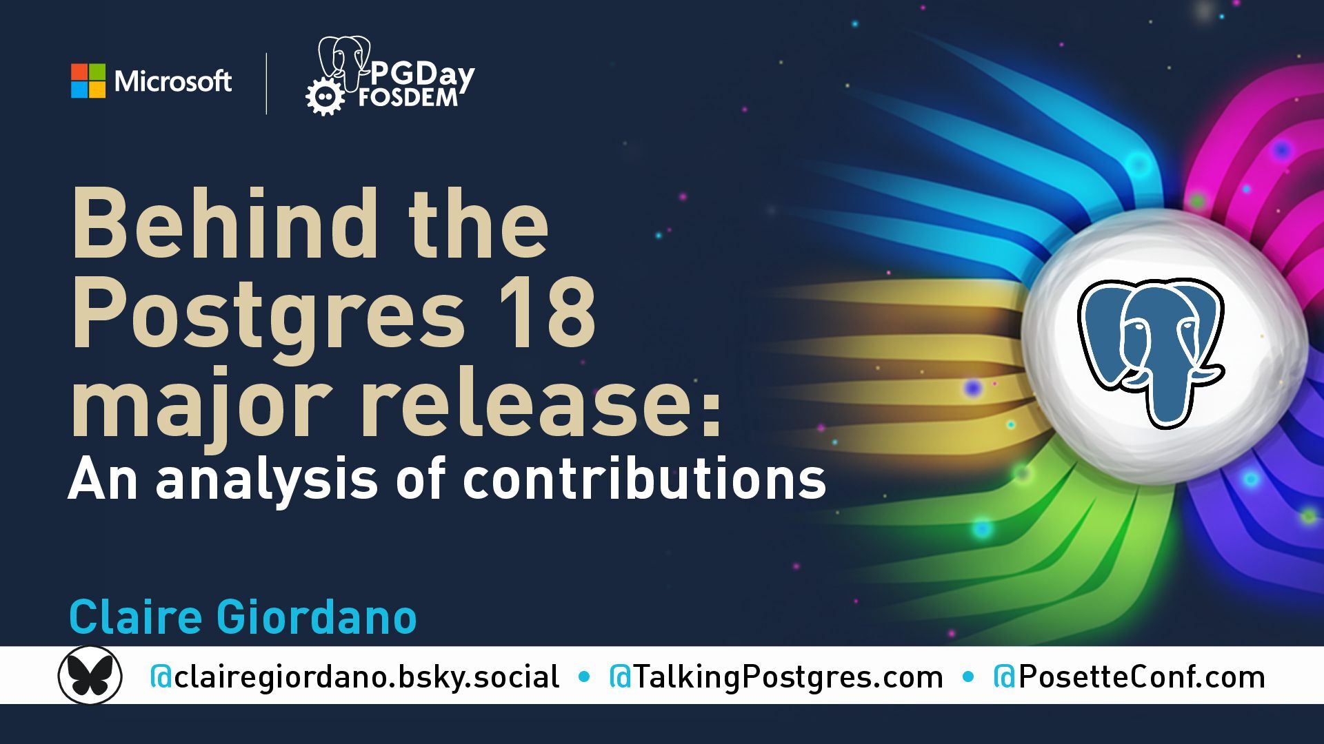 This talk shares an analysis of contributions to Postgres in the v18 timeframe. The research is done by Postgres committer Daniel Gustafsson and Claire Giordano—and leverages data from public sources like commit logs, mailing lists, and PostgreSQL.org. You’ll see maps and charts as you learn about the people behind governance, conferences, meetups, infrastructure, and the code.