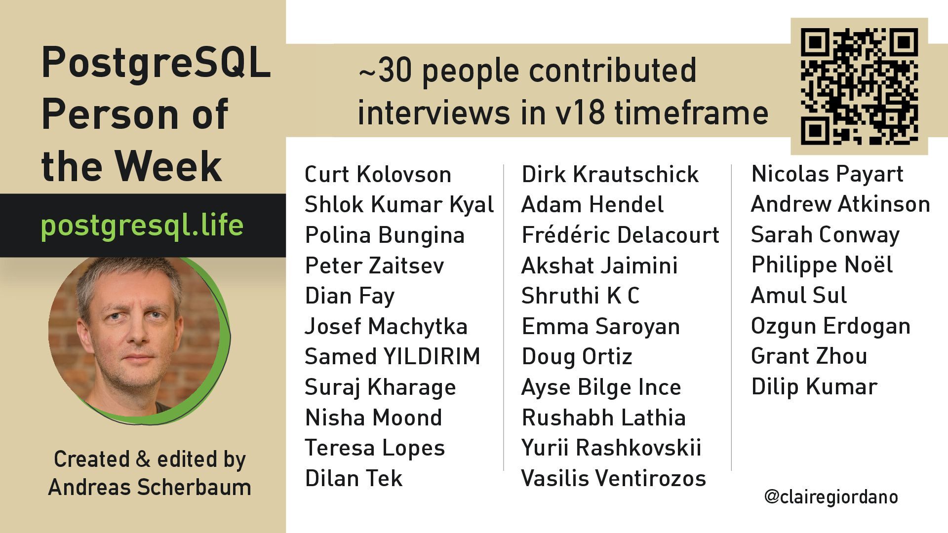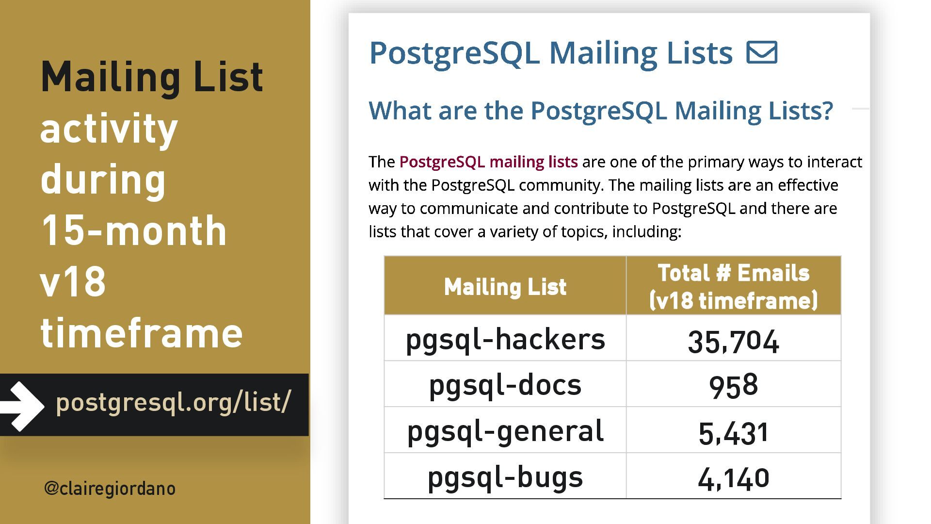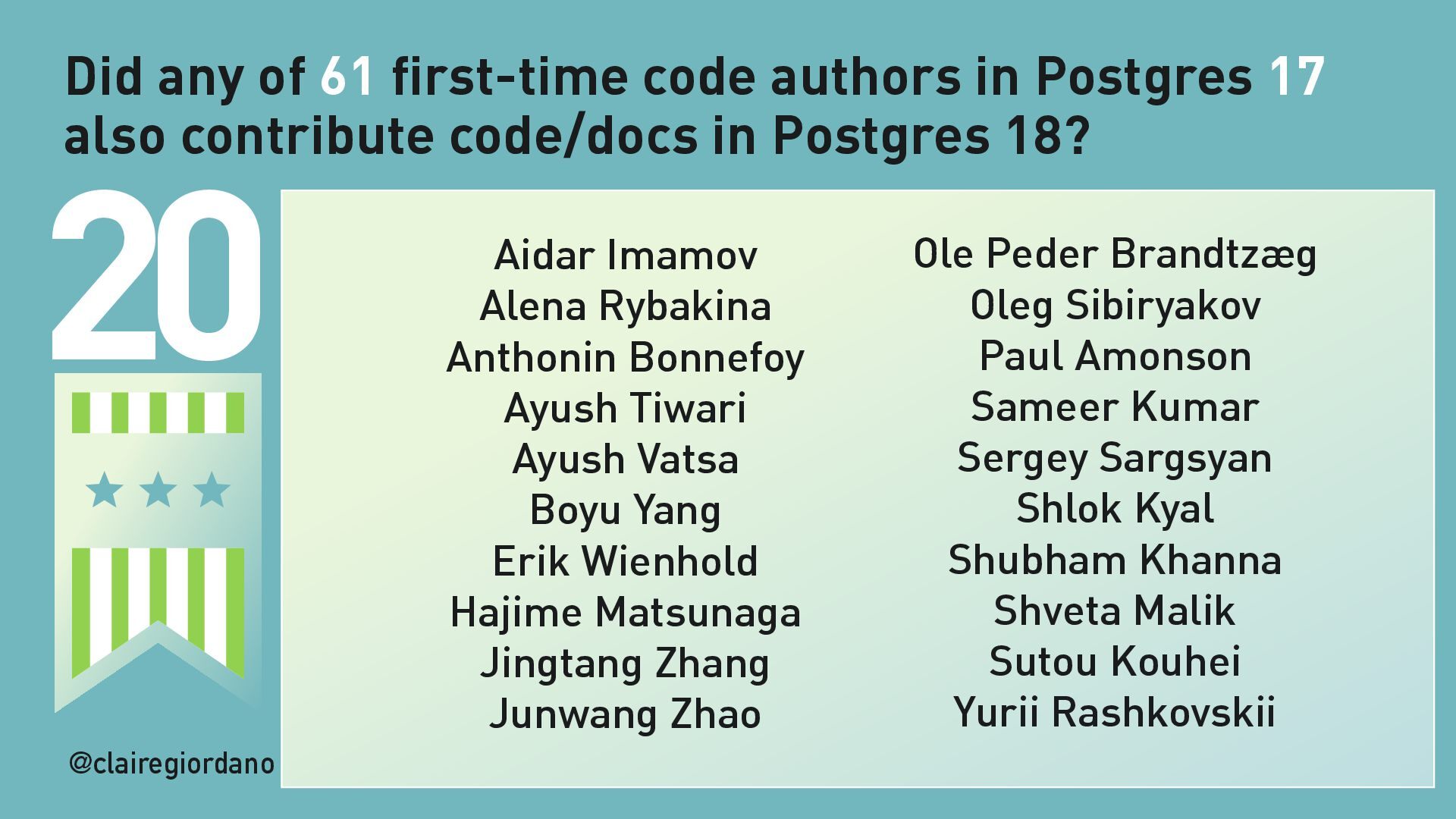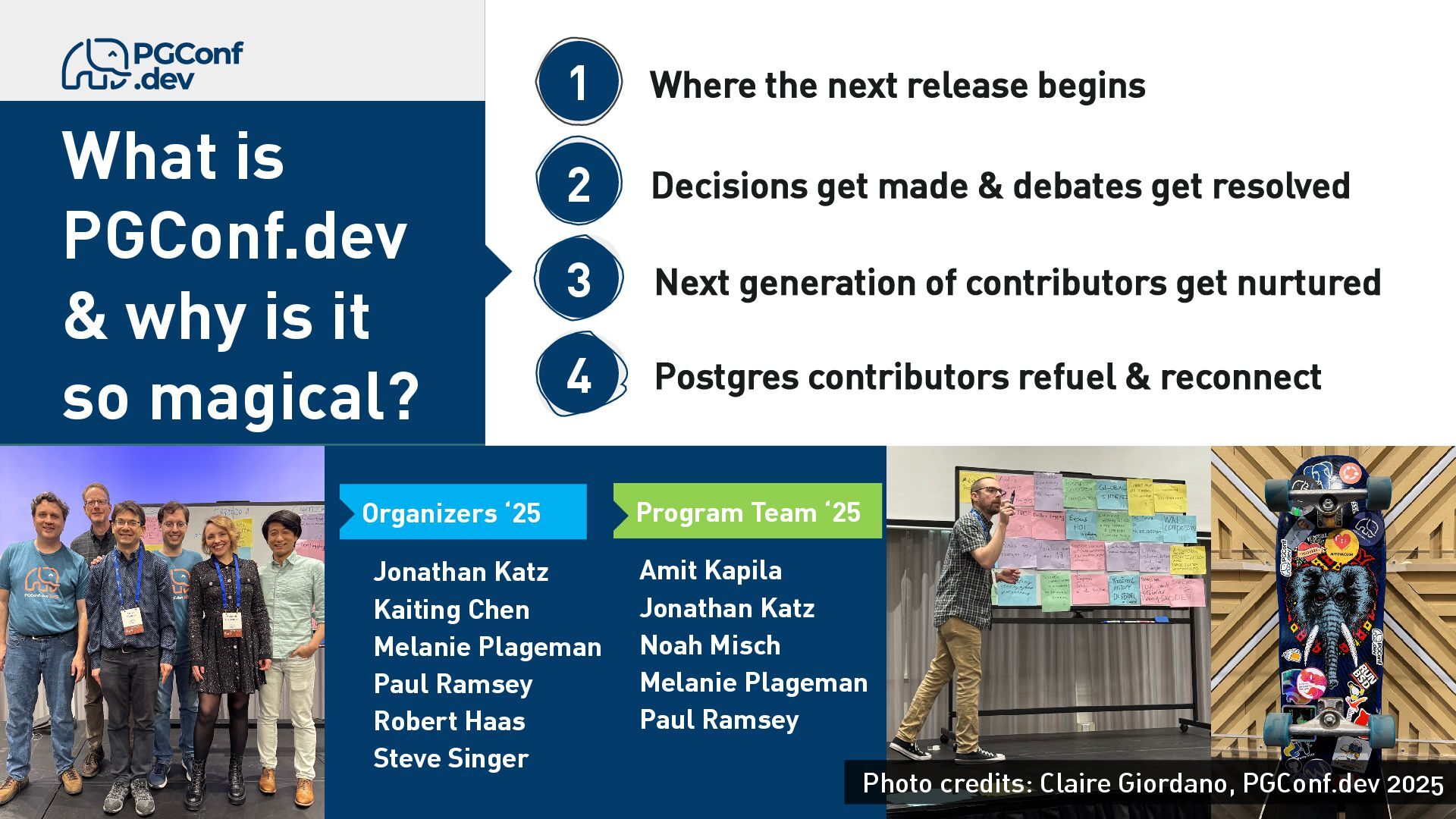 This talk shares an analysis of contributions to Postgres in the v18 timeframe. The research is done by Postgres committer Daniel Gustafsson and Claire Giordano—and leverages data from public sources like commit logs, mailing lists, and PostgreSQL.org. You’ll see maps and charts as you learn about the people behind governance, conferences, meetups, infrastructure, and the code.