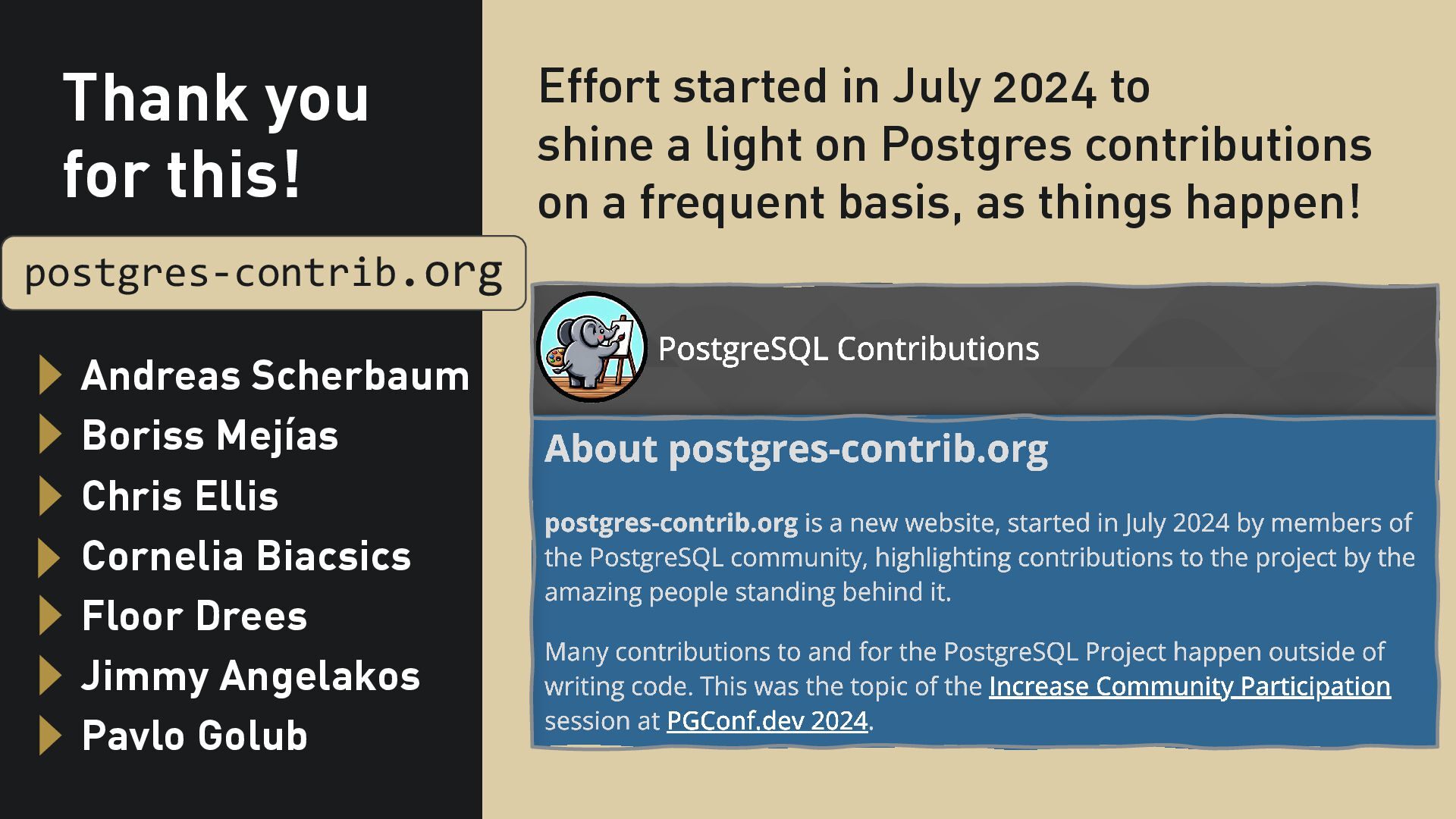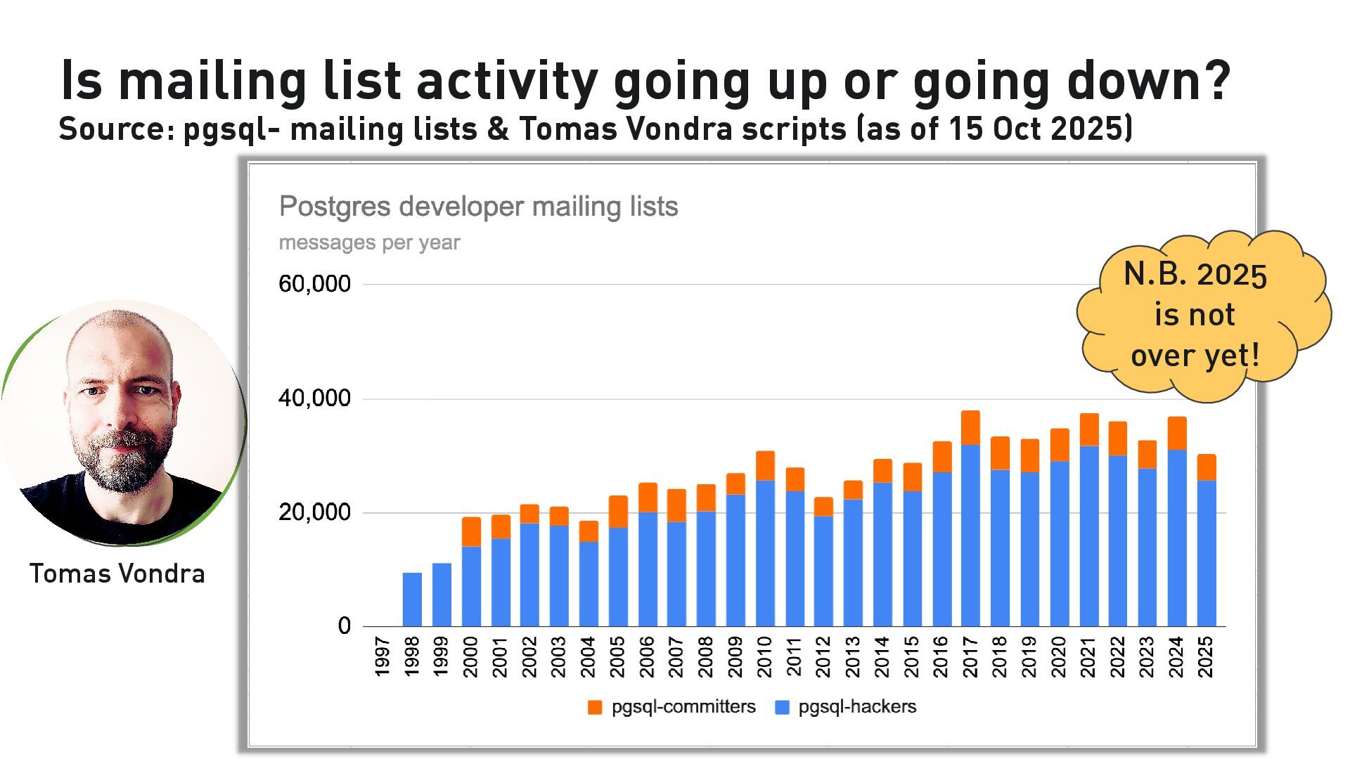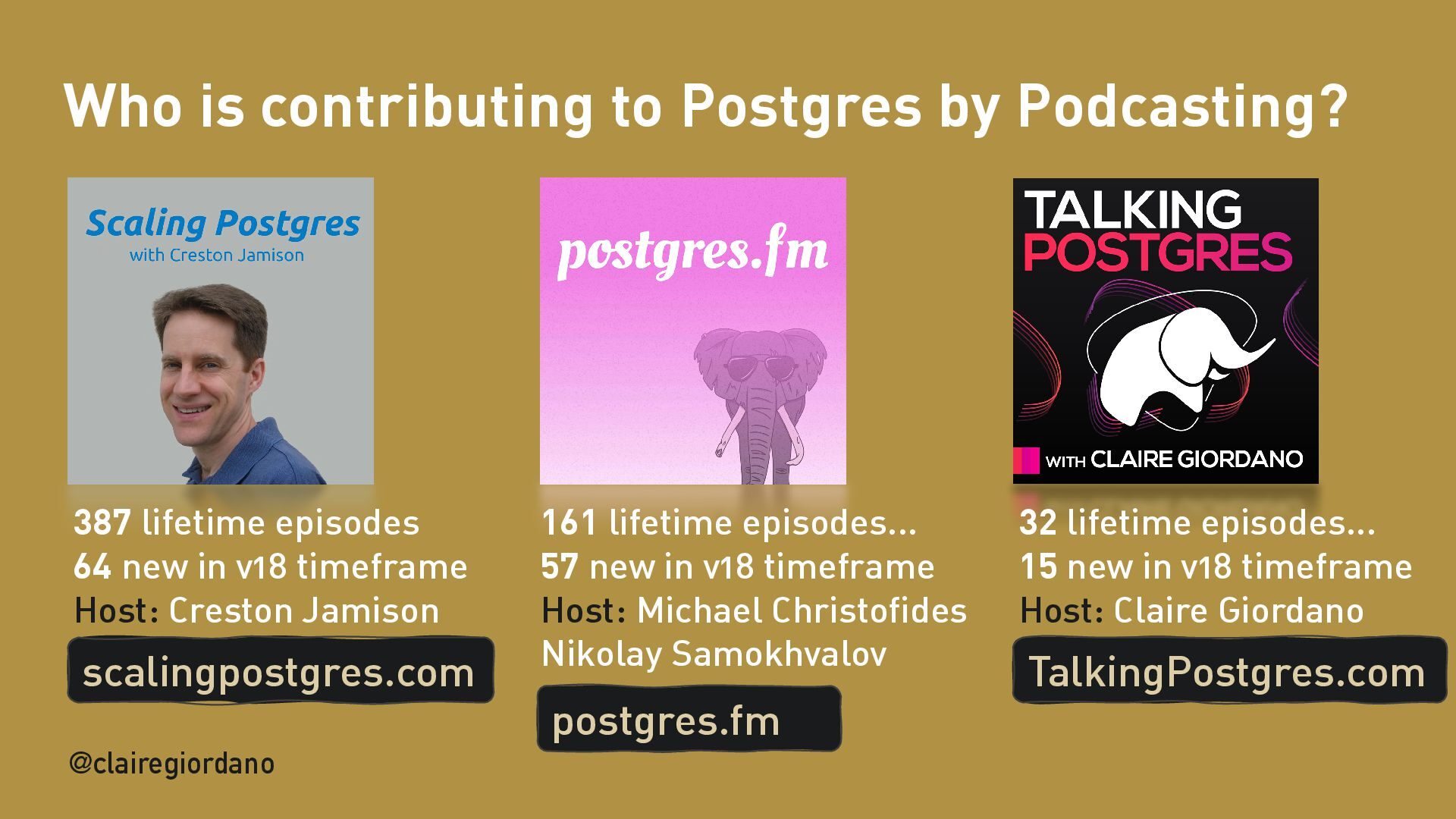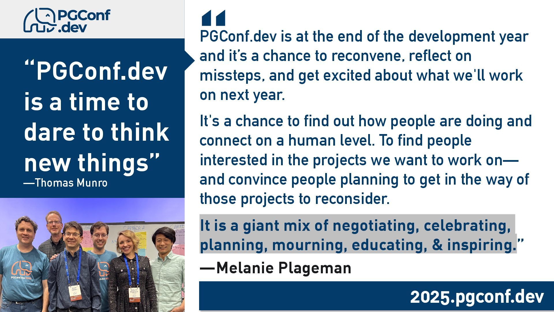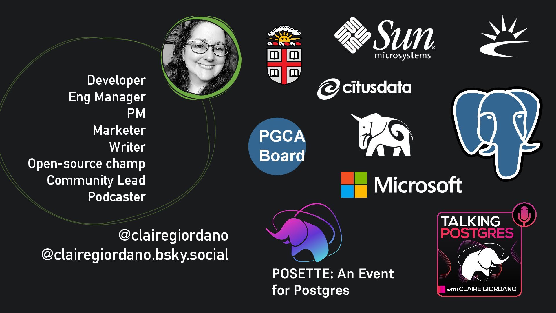 This talk shares an analysis of contributions to Postgres in the v18 timeframe. The research is done by Postgres committer Daniel Gustafsson and Claire Giordano—and leverages data from public sources like commit logs, mailing lists, and PostgreSQL.org. You’ll see maps and charts as you learn about the people behind governance, conferences, meetups, infrastructure, and the code.