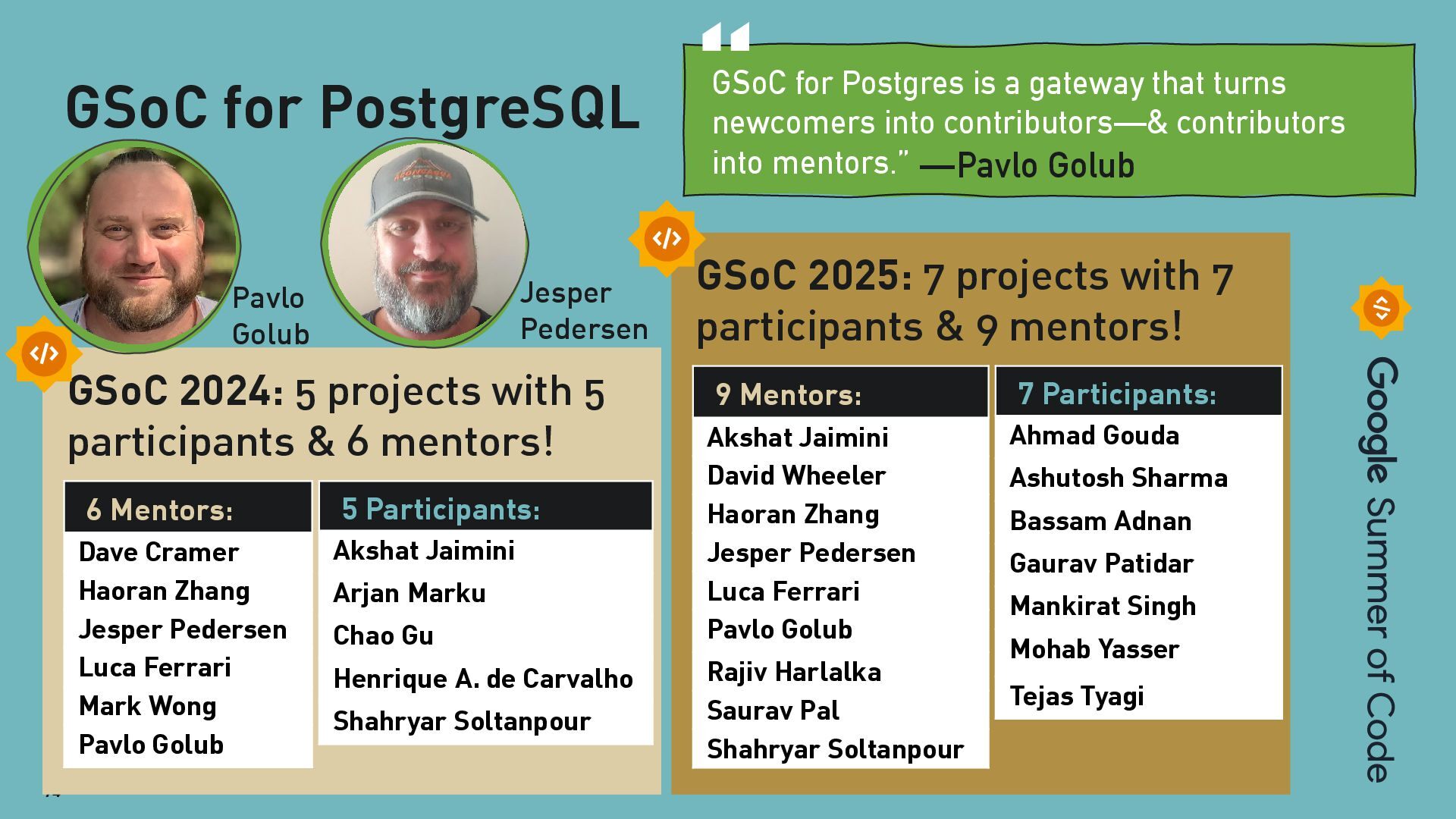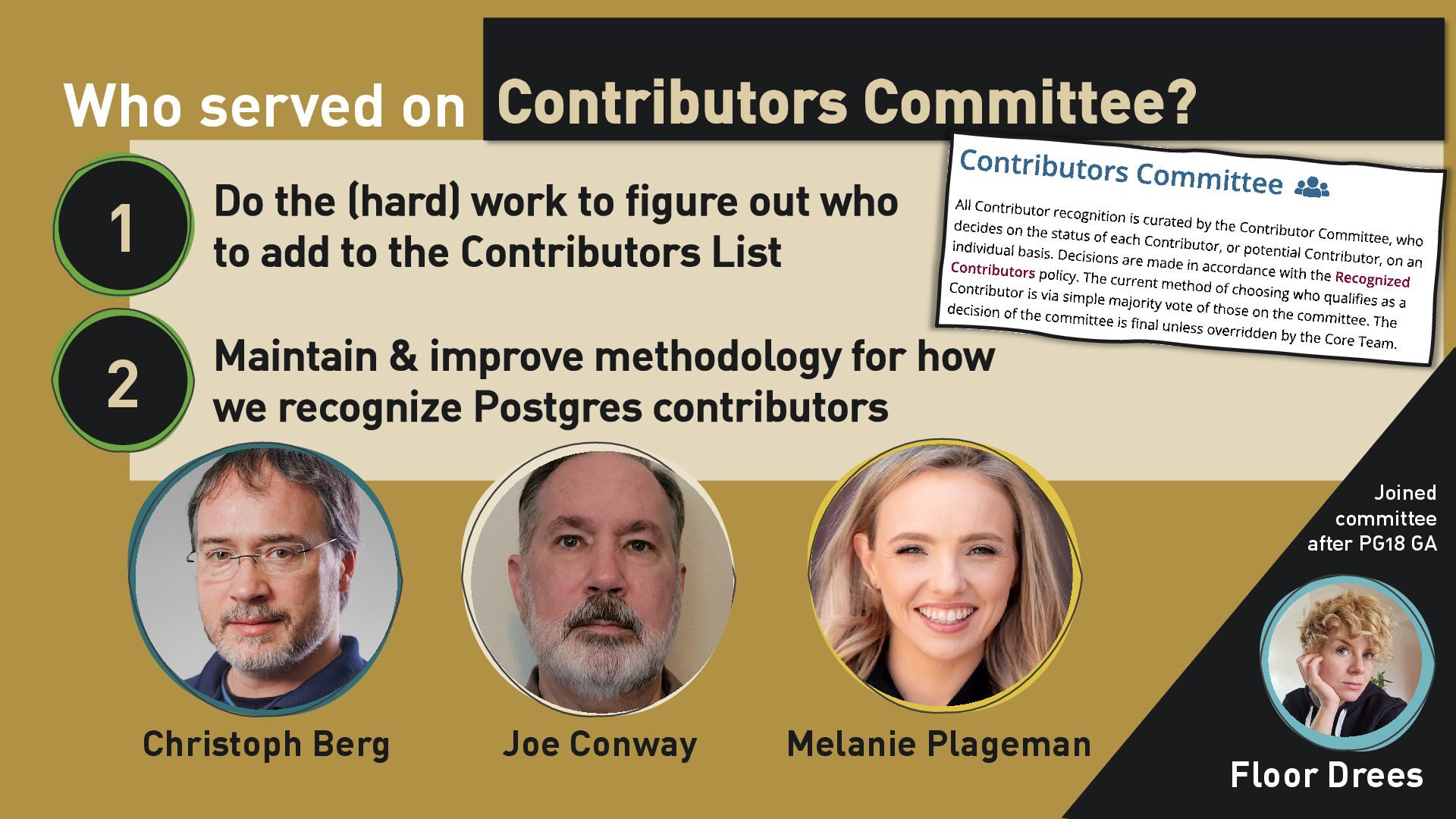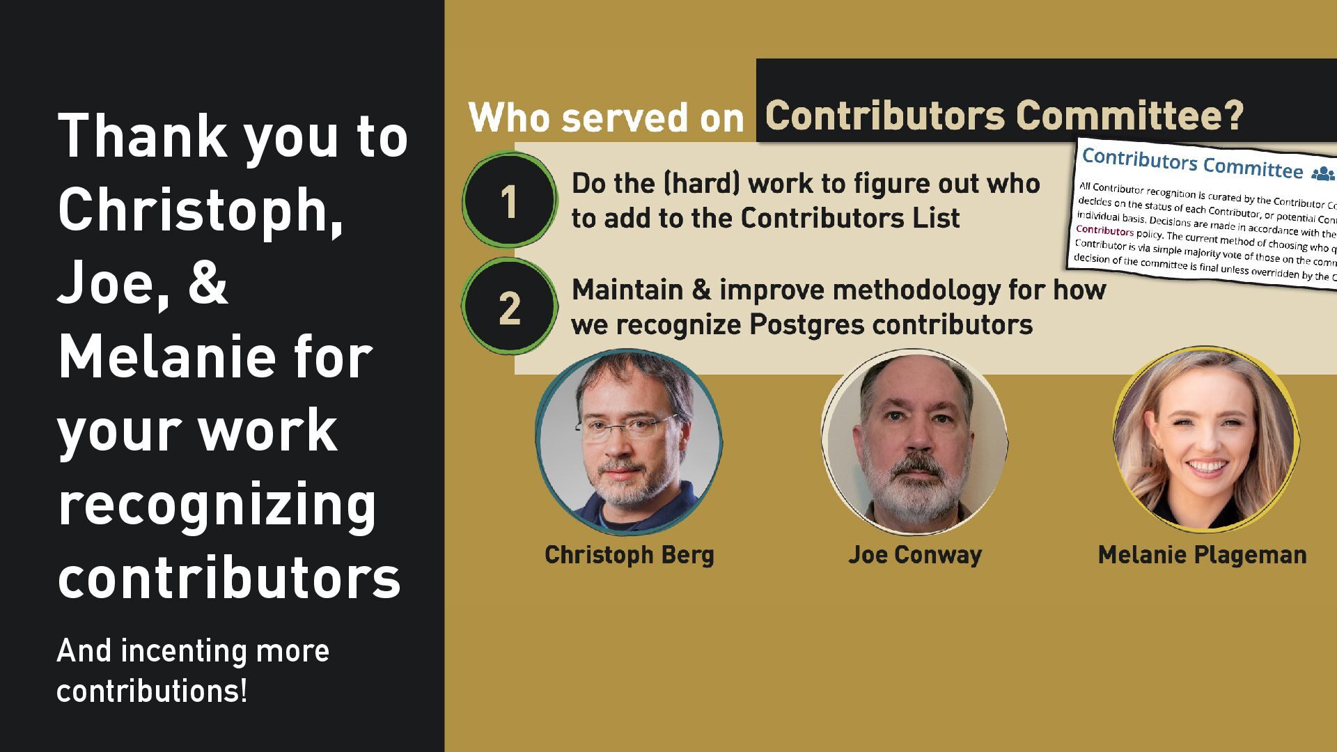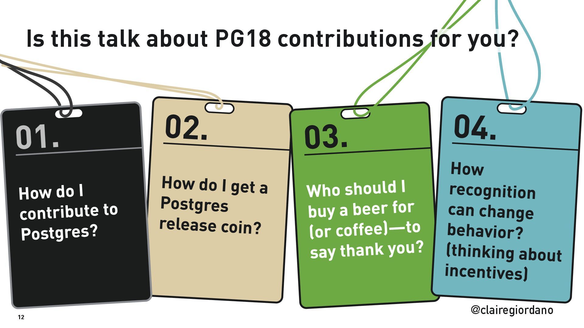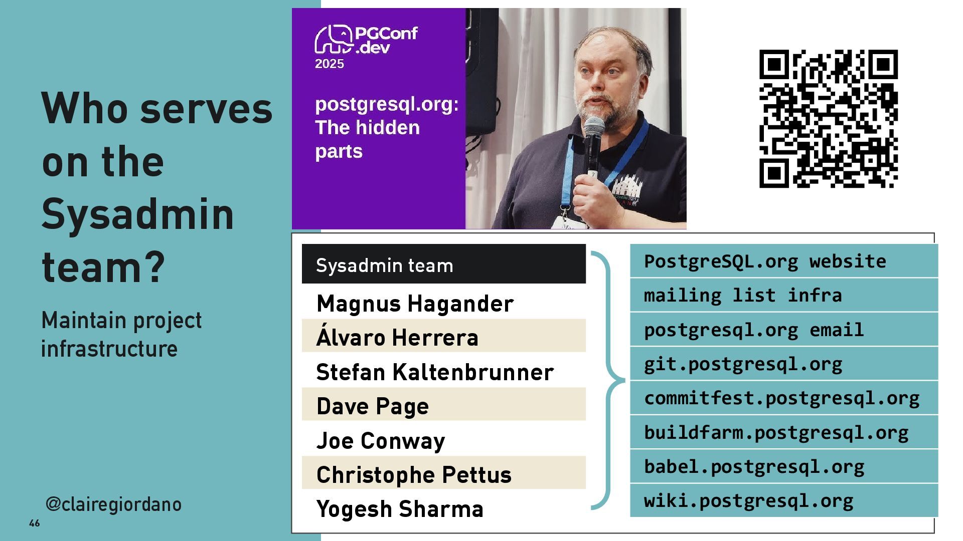 This talk shares an analysis of contributions to Postgres in the v18 timeframe. The research is done by Postgres committer Daniel Gustafsson and Claire Giordano—and leverages data from public sources like commit logs, mailing lists, and PostgreSQL.org. You’ll see maps and charts as you learn about the people behind governance, conferences, meetups, infrastructure, and the code.