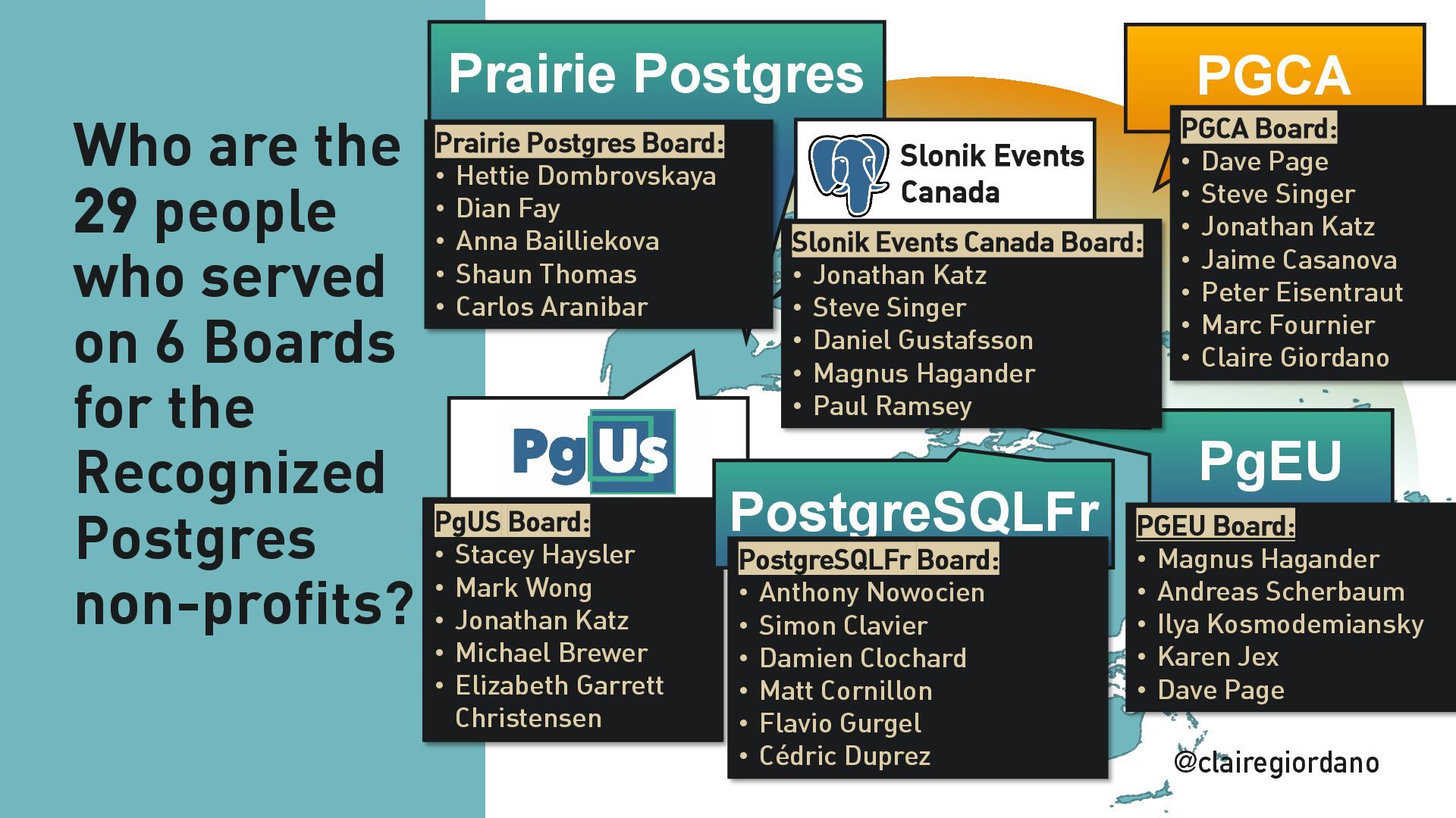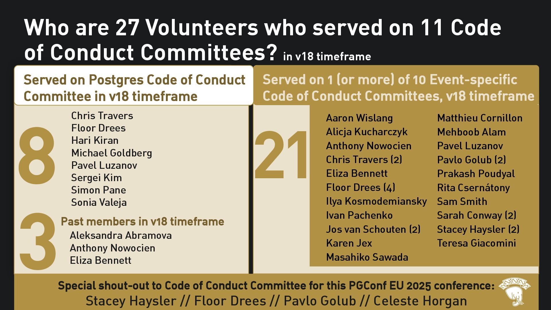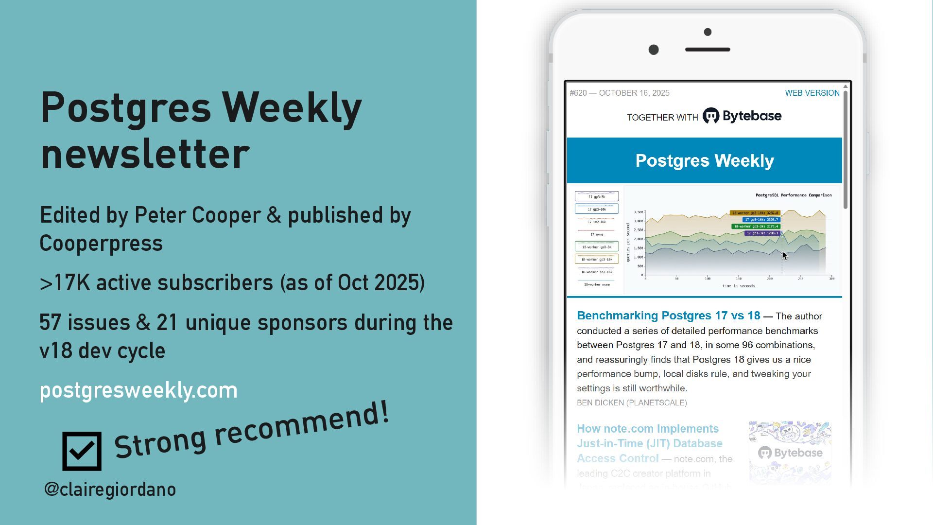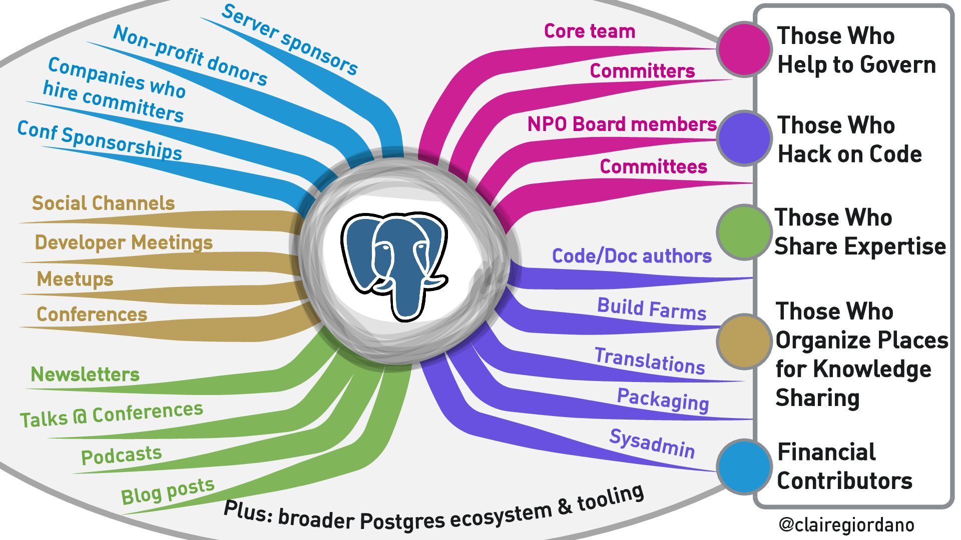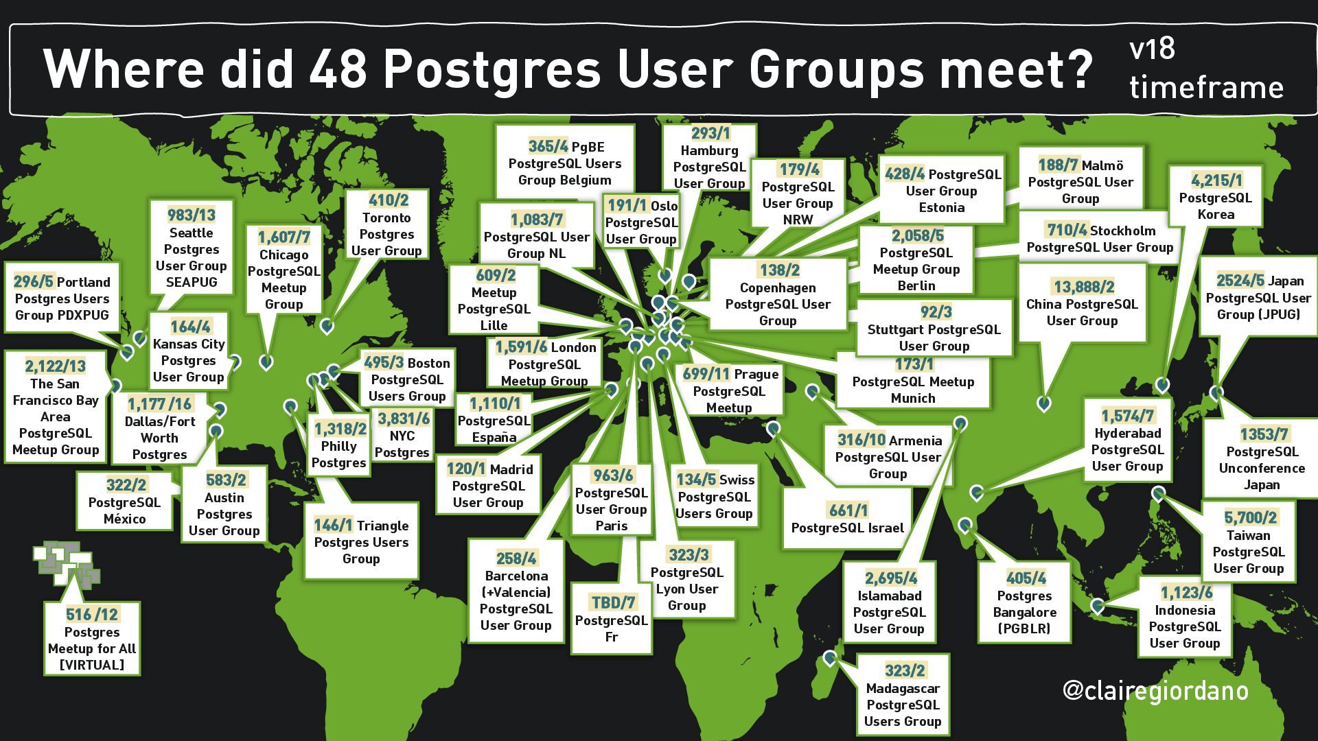 This talk shares an analysis of contributions to Postgres in the v18 timeframe. The research is done by Postgres committer Daniel Gustafsson and Claire Giordano—and leverages data from public sources like commit logs, mailing lists, and PostgreSQL.org. You’ll see maps and charts as you learn about the people behind governance, conferences, meetups, infrastructure, and the code.