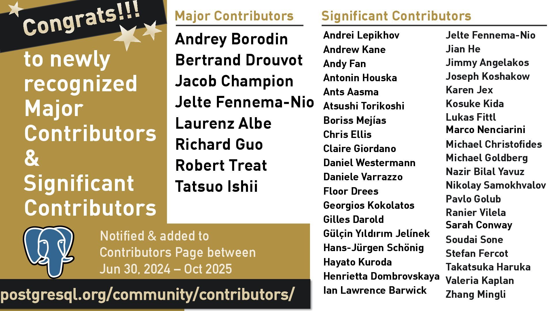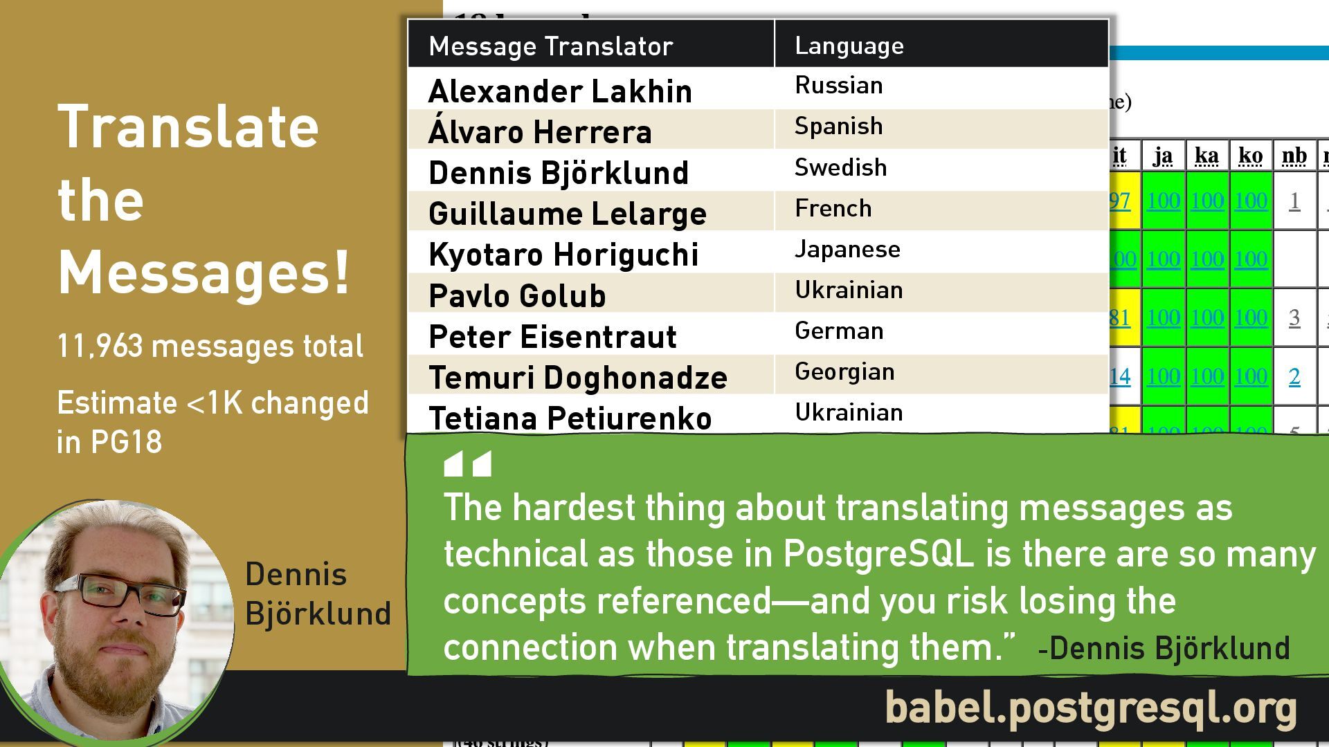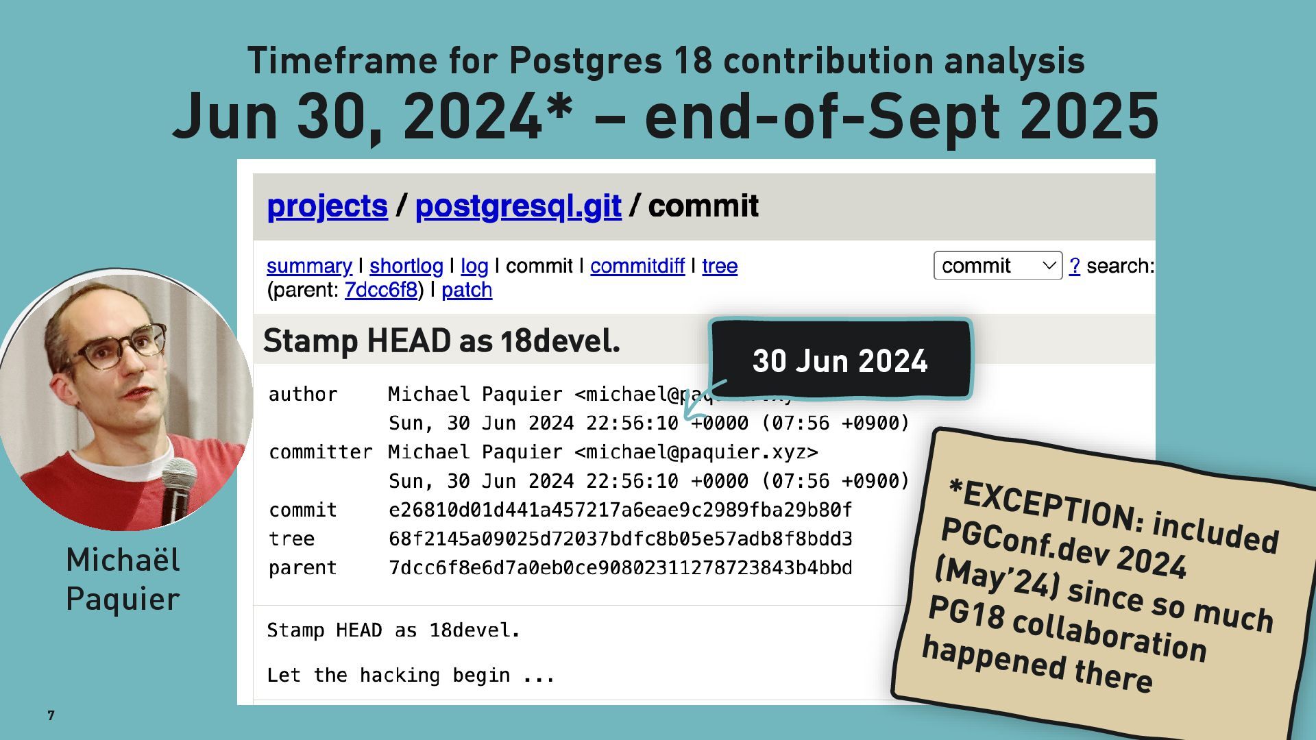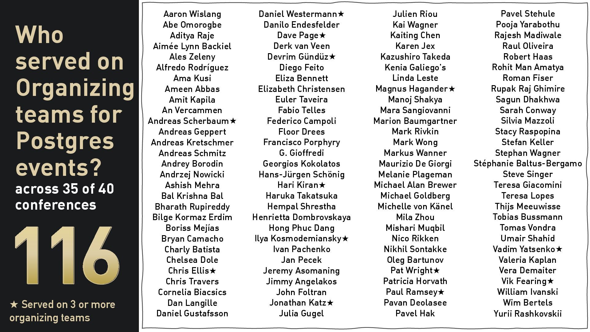 This talk shares an analysis of contributions to Postgres in the v18 timeframe. The research is done by Postgres committer Daniel Gustafsson and Claire Giordano—and leverages data from public sources like commit logs, mailing lists, and PostgreSQL.org. You’ll see maps and charts as you learn about the people behind governance, conferences, meetups, infrastructure, and the code.