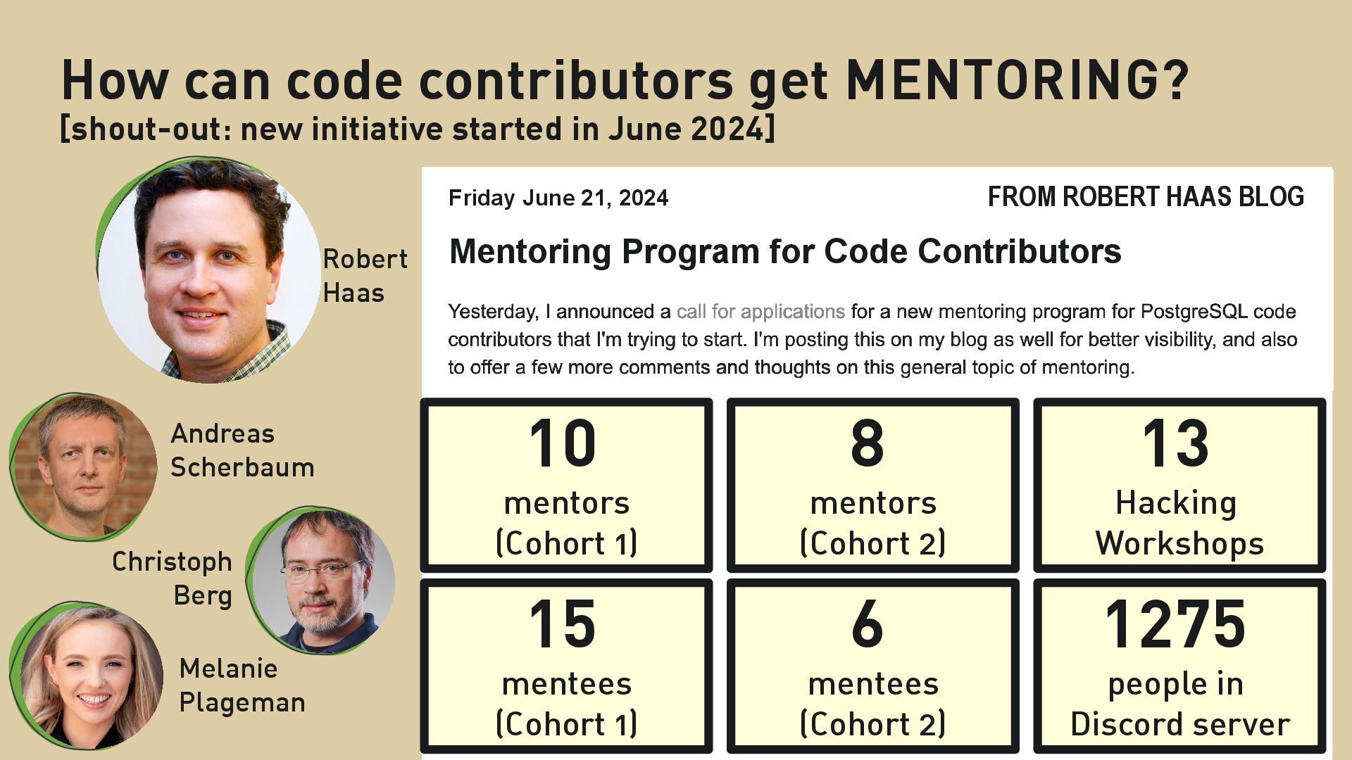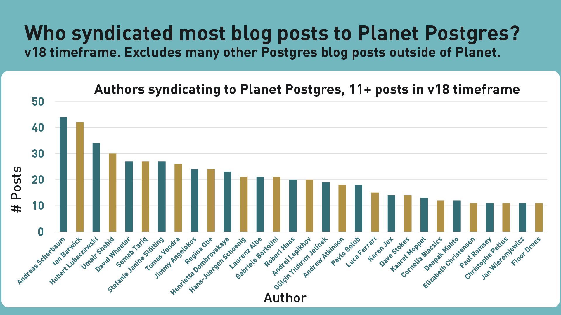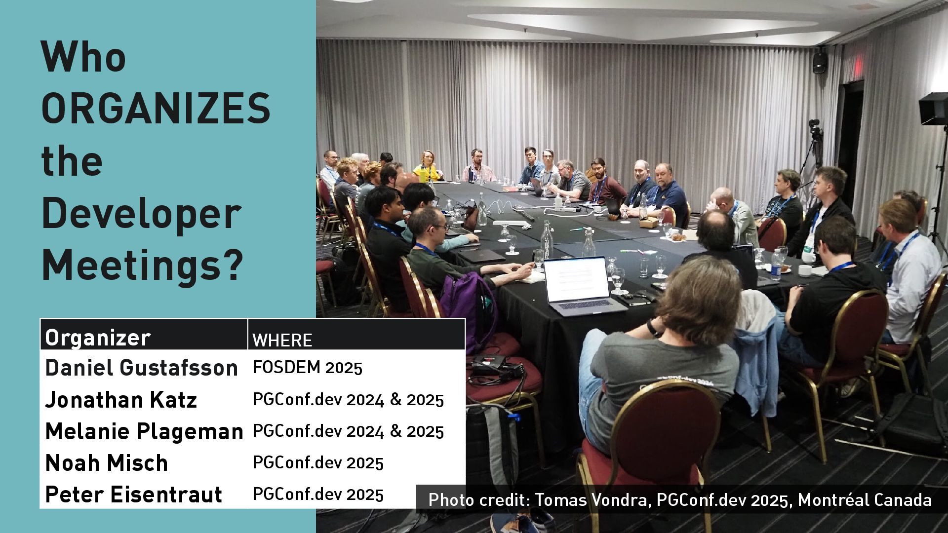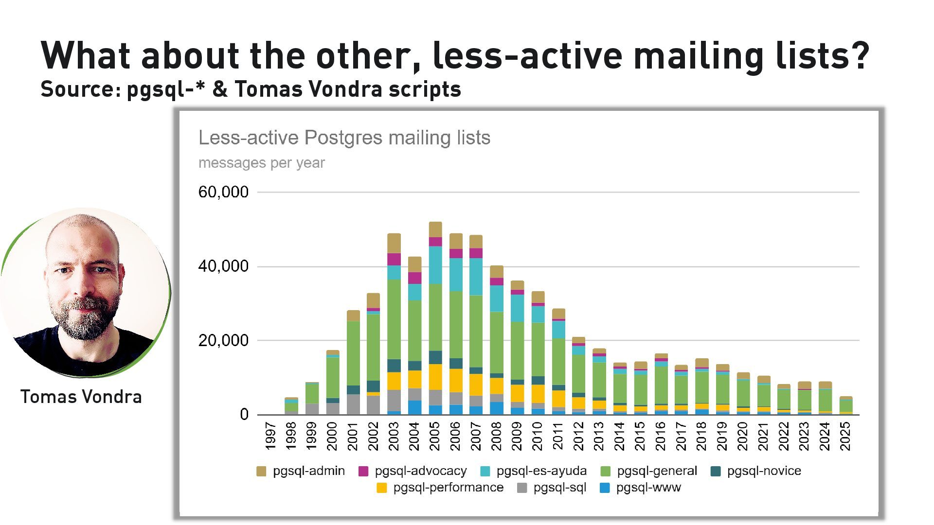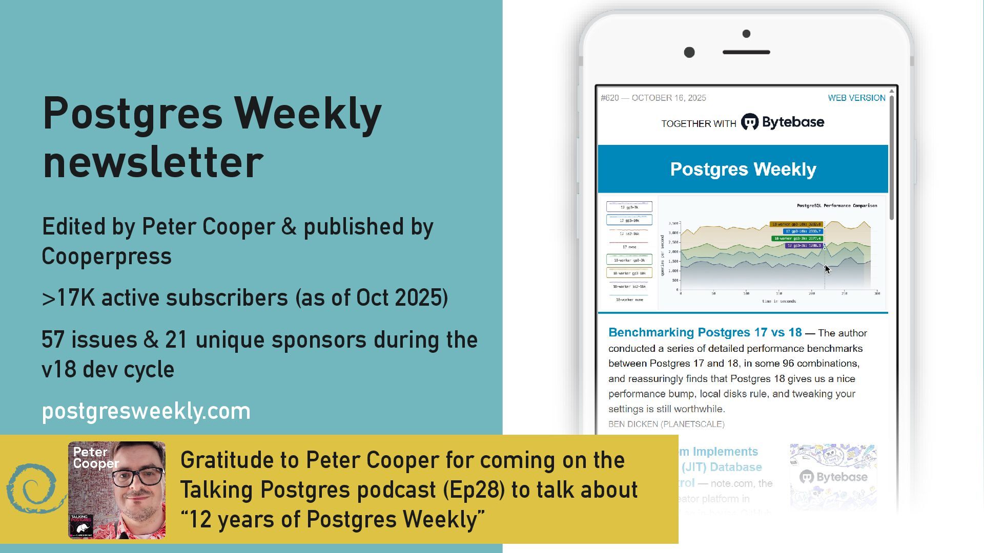 This talk shares an analysis of contributions to Postgres in the v18 timeframe. The research is done by Postgres committer Daniel Gustafsson and Claire Giordano—and leverages data from public sources like commit logs, mailing lists, and PostgreSQL.org. You’ll see maps and charts as you learn about the people behind governance, conferences, meetups, infrastructure, and the code.
