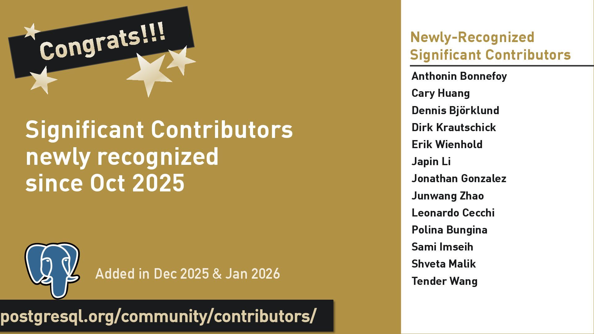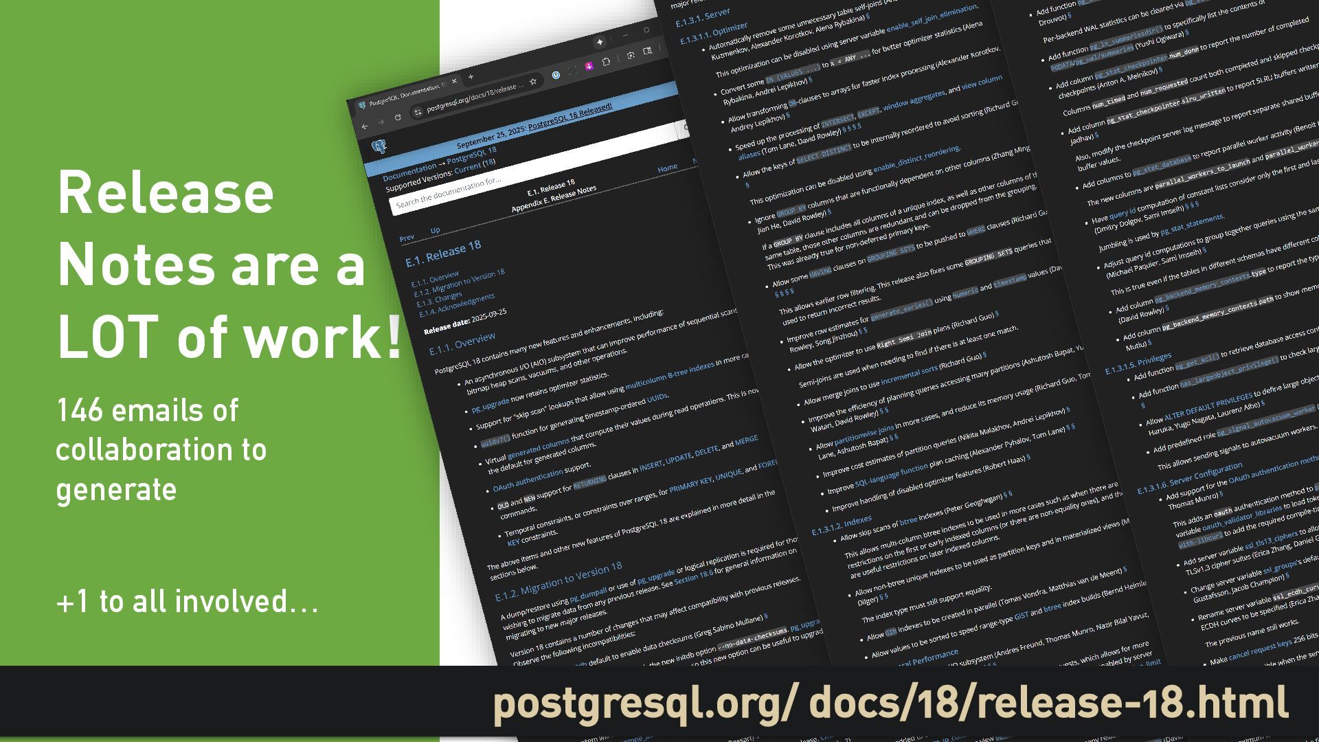 Slides from a conference talk at FOSDEM PGDay 2026 in Brussels, Belgium. Abstract: Ever wonder what happens during the 15-month development cycle for a new Postgres release? Ever wonder about all of the work that brings each new release to life? Let’s find out. In an open source project like Postgres, recognizing behind-the-scenes volunteer efforts isn’t just nice—it’s necessary to keep the momentum.
