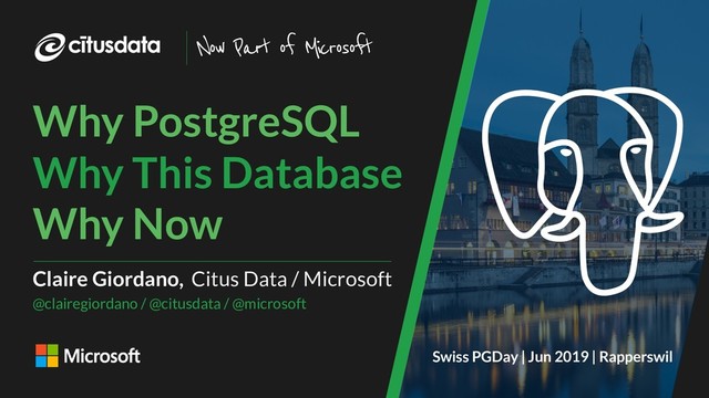 Database Why Now Claire Giordano, Citus Data / Microsoft @clairegiordano / @citusdata / @microsoft Now Part of Microsoft Swiss PGDay | Jun 2019 | Rapperswil