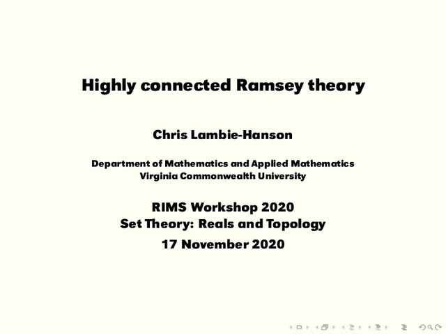 in graph-theoretic language: Whenever the edges of the complete graph on ν-many vertices are colored with λ-many colors, we can find a complete monochromatic subgraph of size µ. In search of nontrivial partition relations that can hold at small uncountable cardinals, one might try to slightly weaken the requirement that the monochromatic subgraph we obtain is complete. One natural way to approach this is via considerations of connectedness. Definition Let G = (V, E) be a graph. 1 G is connected if, for all u, v ∈ V, there are u0, u1, . . . , un ∈ V such that u0 = u, un = v, and, for all i < n, {ui , ui+1} ∈ E. 2 G is κ-connected if it is connected and remains connected after removing any fewer than κ-many vertices.