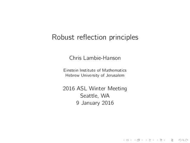 a property that a cardinal can satisfy (e.g. being weakly compact, having the tree property, etc.). κ satisfies P robustly (or κ has the robust property P) if, whenever Q is a forcing poset and |Q|+ < κ, κ satisfies P in V Q. Theorem (Levy-Solovay) Most large cardinal properties (e.g. being inaccessible, Mahlo, weakly compact, measurable, strongly compact, supercompact, etc.) are robust. Thus, reflection principles, when they hold due to the existence of large cardinals, are themselves robust.