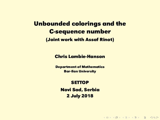 µ, θ, χ ≤ κ are cardinals. U(κ, µ, θ, χ) asserts the existence of a coloring c : [κ]2 → θ such that, for every χ < χ, for every A ⊆ [κ]χ consisting of κ-many pairwise disjoint sets, and for every i < θ, there is B ⊆ A of size µ such that, for all distinct a, b ∈ B, we have min(c[a × b]) ≥ i. • U(κ, 2, θ, 2) is a strong negation of κ → (κ)2 θ . • If µ∗ ≥ µ and χ∗ ≥ χ, then U(κ, µ∗, θ, χ∗) implies U(κ, µ, θ, χ). There is no such monotonicity in the third coordinate. • Instances of this principle are implicit in previous work of, for instance, Galvin, Todorcevic, and Shelah.