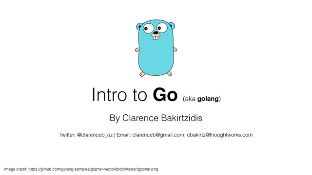 C but easier, low-level access, C-interop • Web Services - It has just about everything you need built into the Standard Library • Concurrent Programming - Its built into the language: goroutines and channels • Target multiple platforms - Linux, Windows, Mac OS X, Free BSD • Simple deployments - Your app is a single binary with no other dependencies • Large scale development! • Easy to read, write, maintain • Garbage collected, statically-typed, fast compilation, fast execution Image credit: http://blog.golang.org/go-11-is-released_gopherbiplane5.jpg