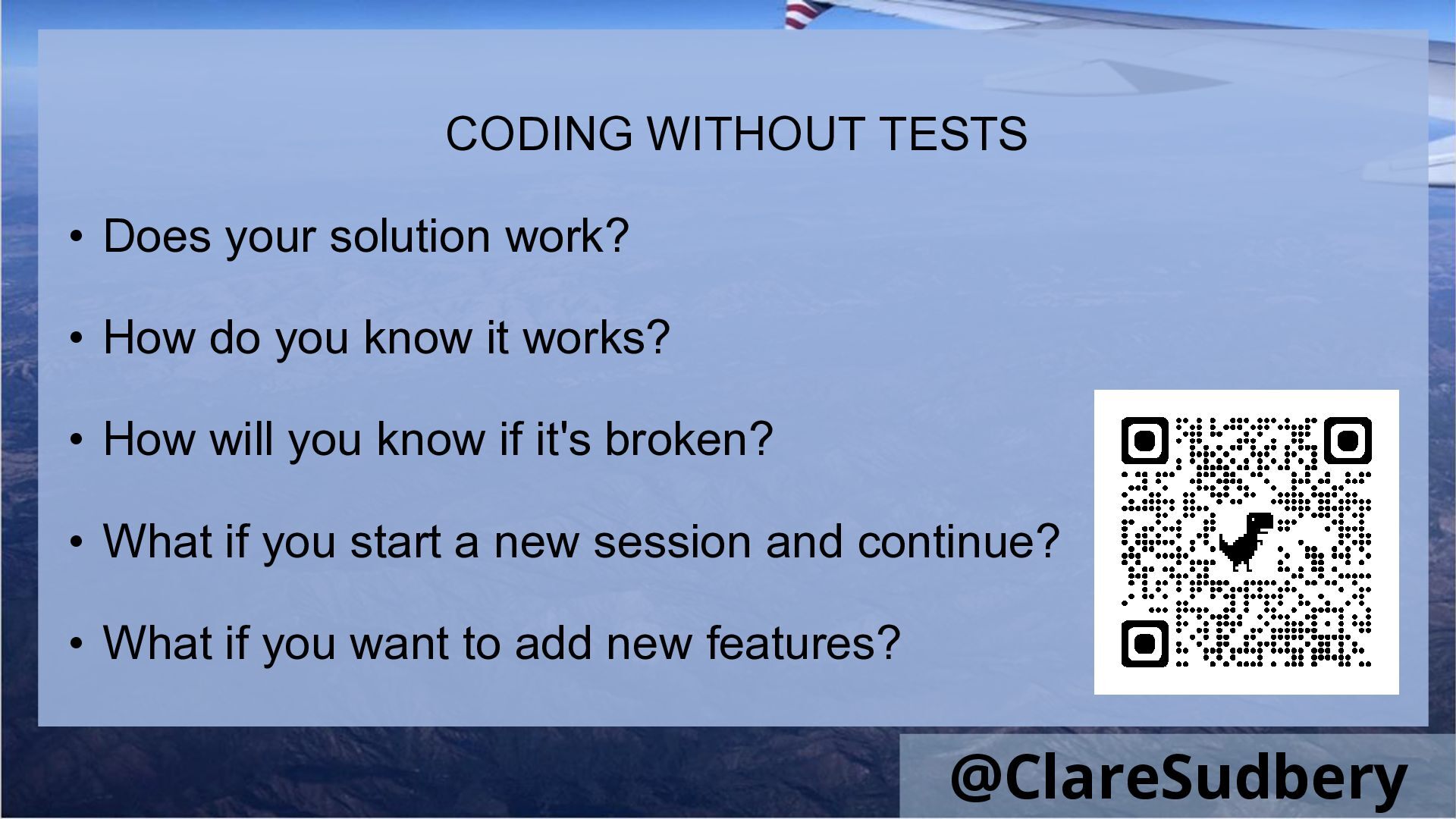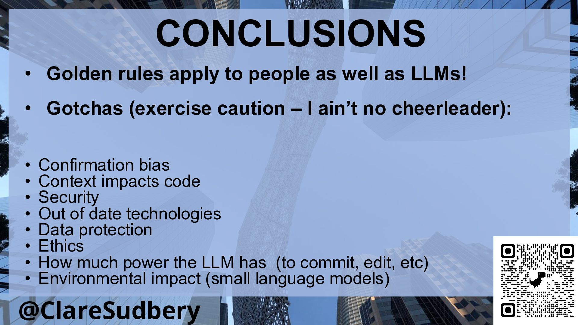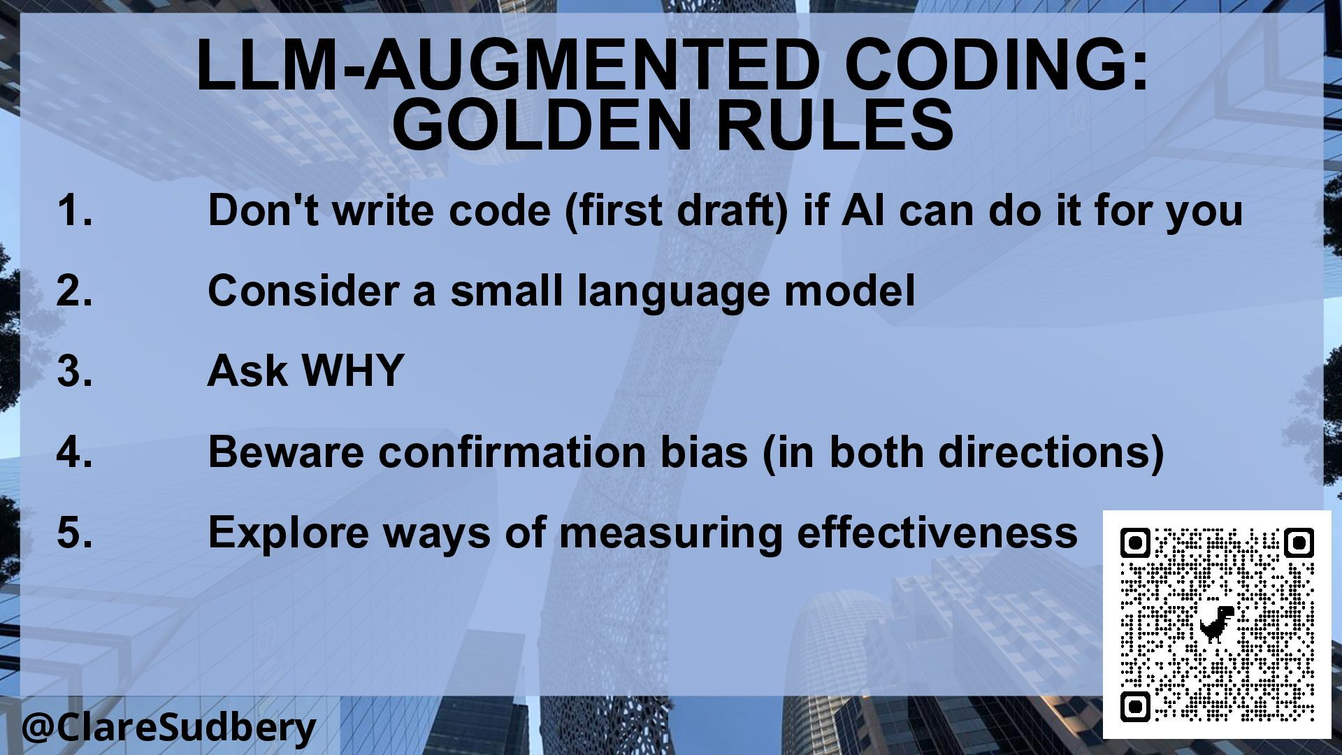It’s time to take a deep breath and leap in. Find out how to keep the fun of solving problems with code, while maximising the usefulness of AI. Learn how to use test driven development and robust test suites to monitor genAI outputs, understand what they’ve created for you and maintain confidence in the quality of your software. Find out how to use small language models to minimise the environmental impact.