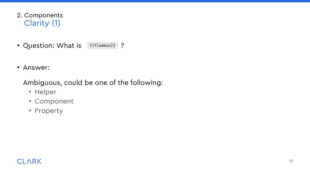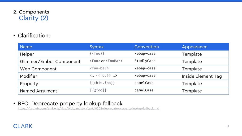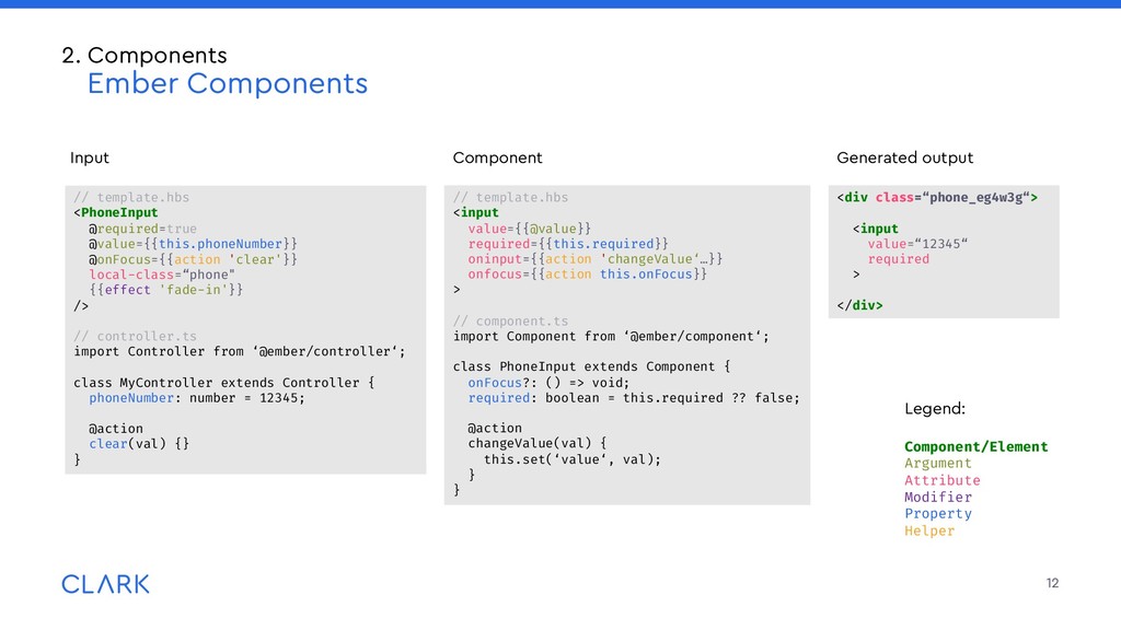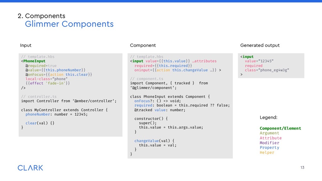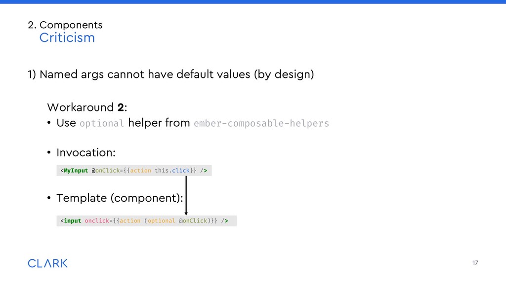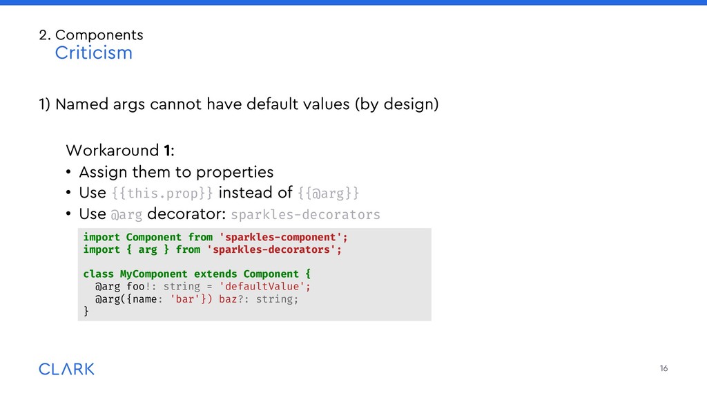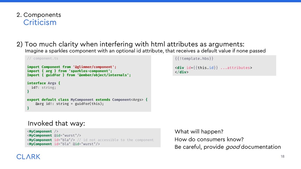 arguments: Imagine a sparkles component with an optional id attribute, that receives a default value if none passed Invoked that way: What will happen? How do consumers know? Be careful, provide good documentation 18 2. Components Criticism <MyComponent /> <MyComponent @id="wurst"/> <MyComponent id="bla"/> // id not accessible to the component <MyComponent id="bla" @id="wurst"/> {{!template.hbs}} <div id={{this.id}} ...attributes> </div> // component.ts import Component from '@glimmer/component'; import { arg } from ‘sparkles-component‘; Import { guidFor } from ‘@ember/object/internals‘; interface Args { id?: string; } export default class MyComponent extends Component<Args> { @arg id!: string = guidFor(this); }