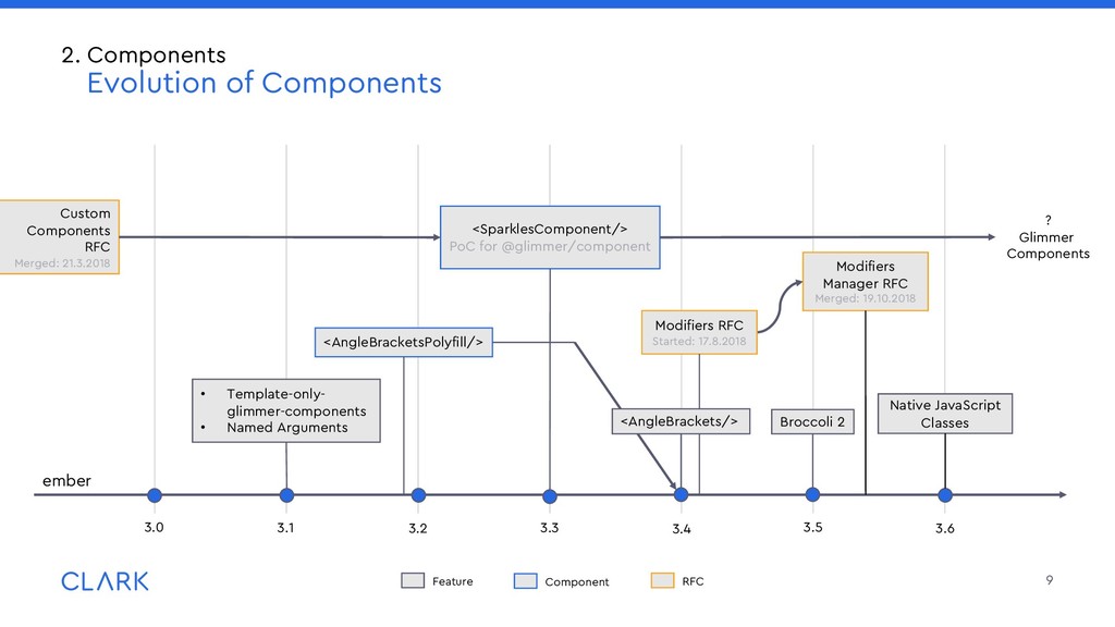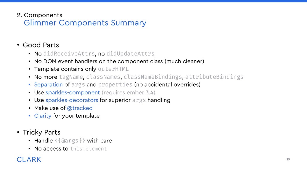 DOM event handlers on the component class (much cleaner) • Template contains only outerHTML • No more tagName, classNames, classNameBindings, attributeBindings • Separation of args and properties (no accidental overrides) • Use sparkles-component (requires ember 3.4) • Use sparkles-decorators for superior args handling • Make use of @tracked • Clarity for your template • Tricky Parts • Handle {{@args}} with care • No access to this.element 19 2. Components Glimmer Components Summary