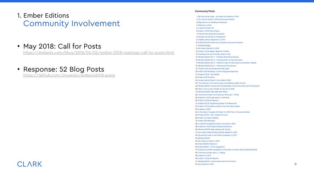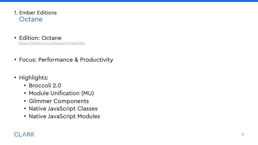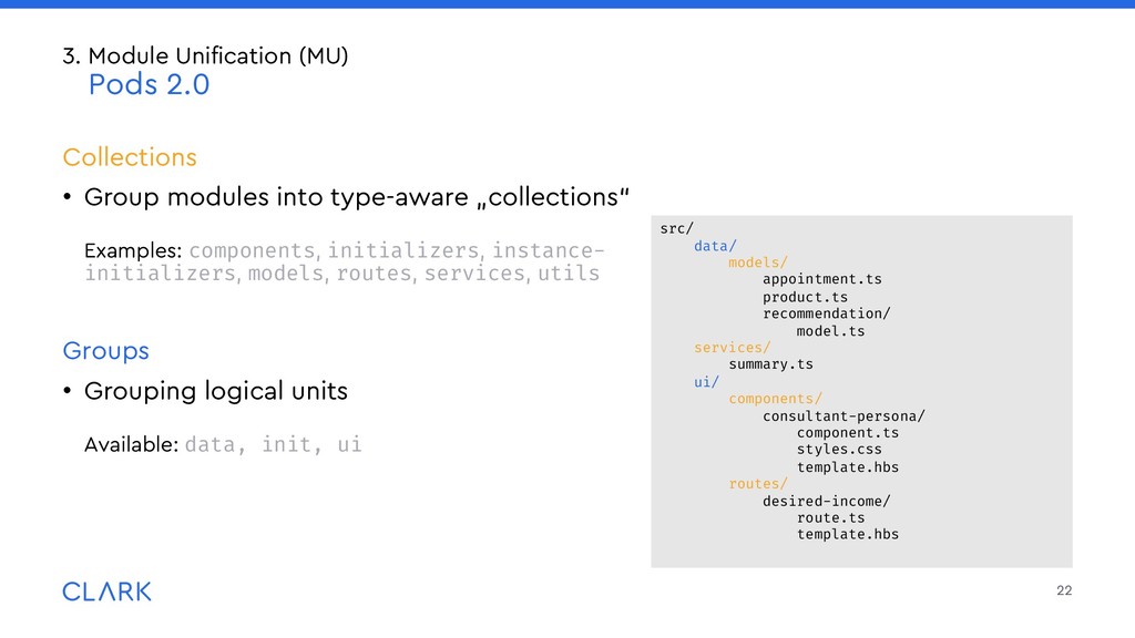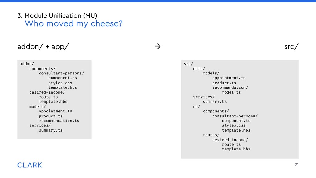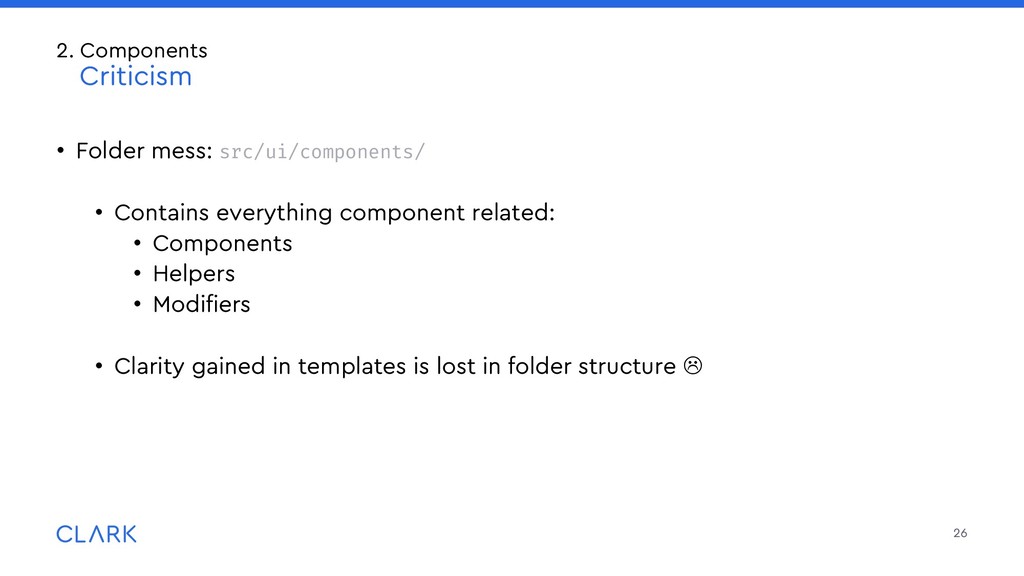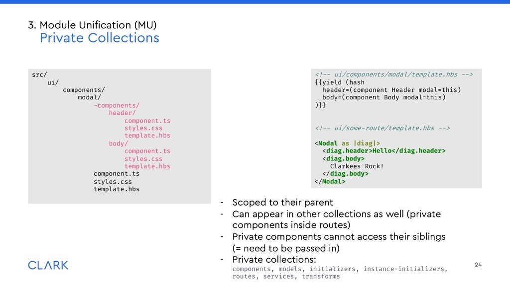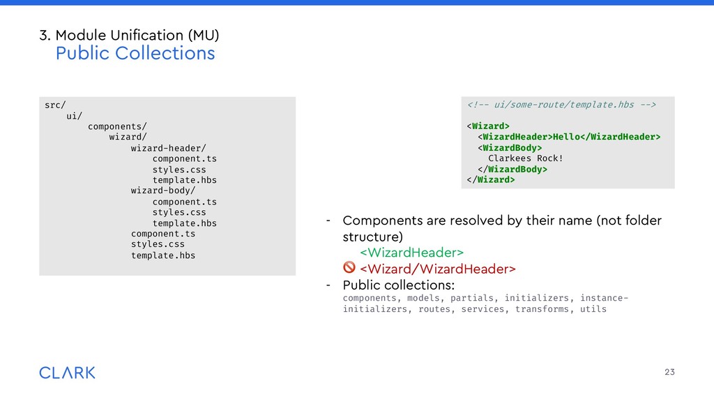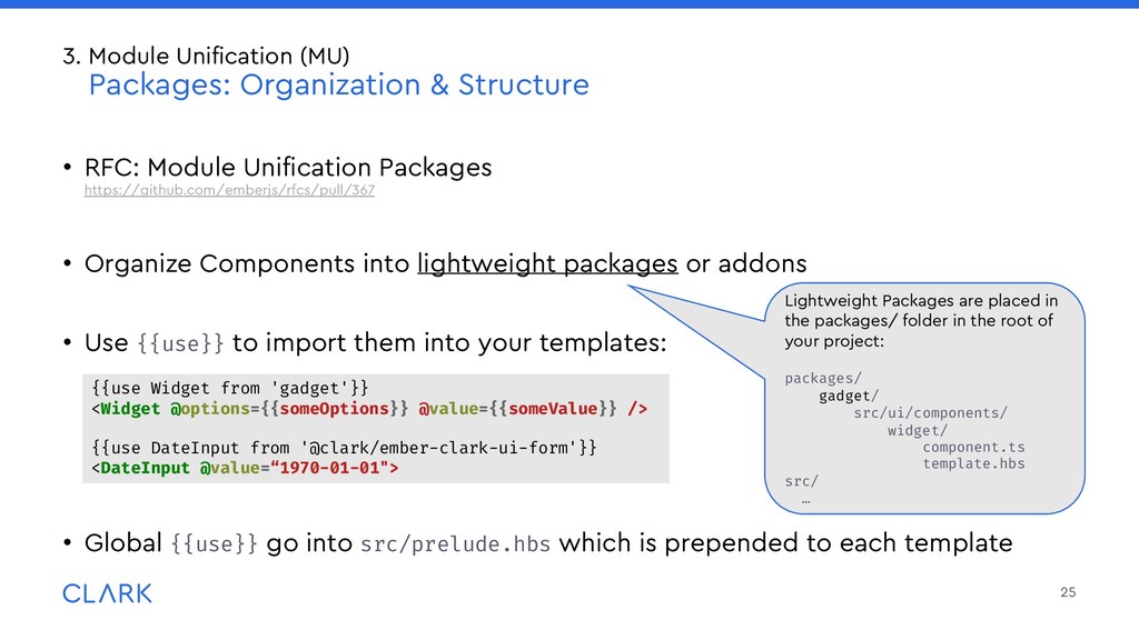lightweight packages or addons • Use {{use}} to import them into your templates: • Global {{use}} go into src/prelude.hbs which is prepended to each template 25 3. Module Unification (MU) Packages: Organization & Structure Lightweight Packages are placed in the packages/ folder in the root of your project: packages/ gadget/ src/ui/components/ widget/ component.ts template.hbs src/ … {{use Widget from 'gadget'}} <Widget @options={{someOptions}} @value={{someValue}} /> {{use DateInput from '@clark/ember-clark-ui-form'}} <DateInput @value=“1970-01-01">